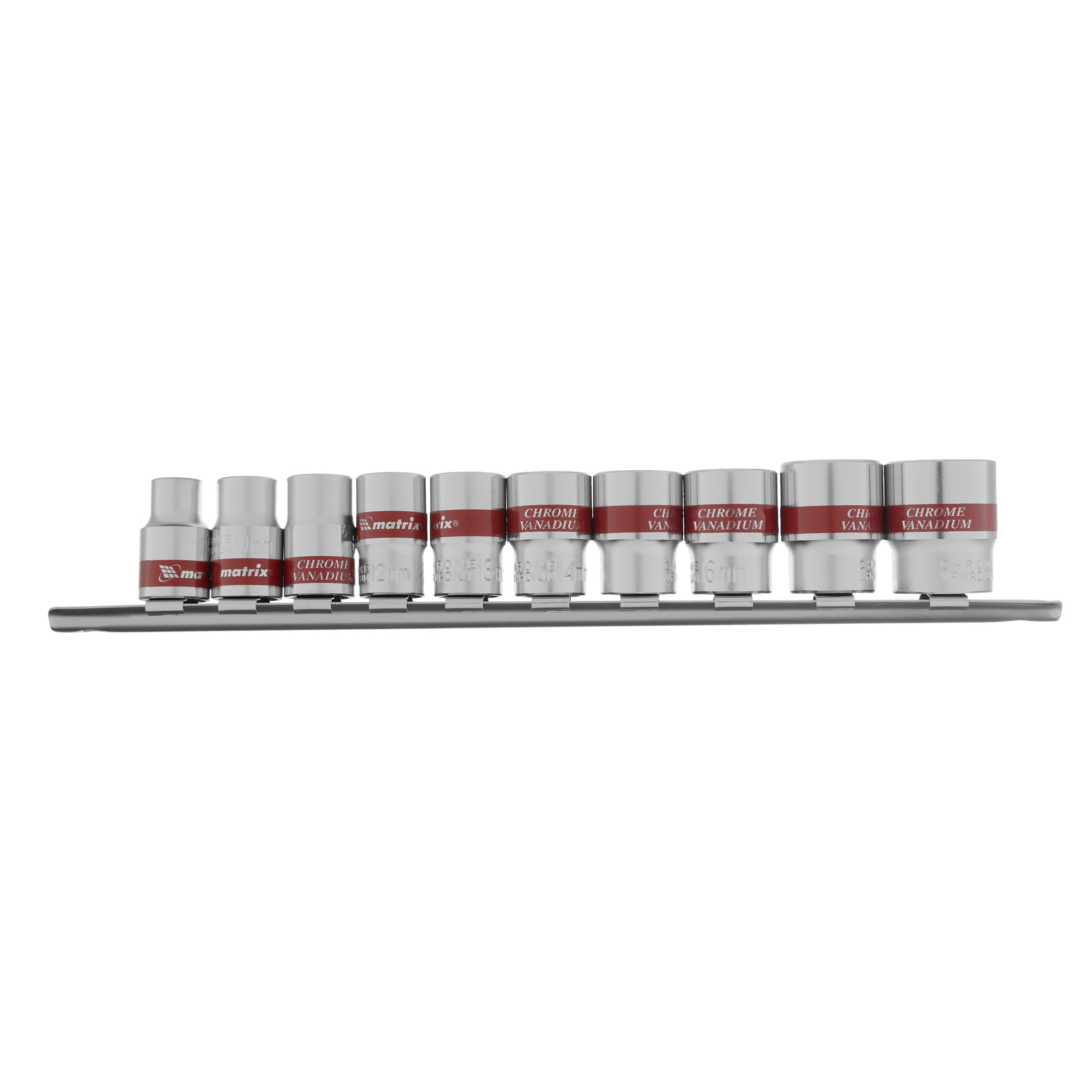 Набор торцевых головок Matrix 13558 из стали CrV, с посадочным гнездом 3/8" и шестигранным профилем, включает 10 насадок диаметром 8-19 мм, предназначенных для работы с резьбовыми соединениями. Пригодится для проведения бытового ремонта, будет полезен сантехнику, слесарю, авторемонтнику.