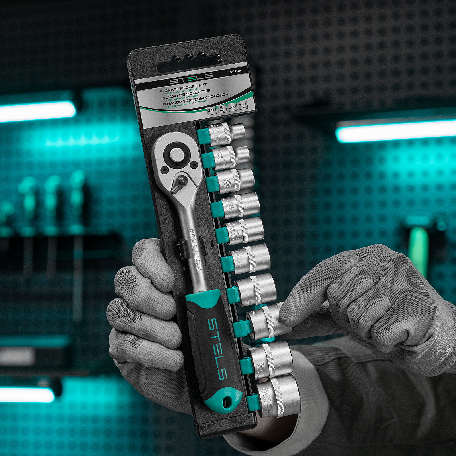 Набор Stels 14126 из стали CrV включает в себя 11 предметов: торцевые головки 7-22 мм с присоединительным размером 3/8 дюйма и трещоточный ключ. Он используется для закручивания и откручивания крепежных элементов, пригодится при ремонте крупногабаритной техники и обслуживании авто. Инструменты выдерживают высокие нагрузки и могут использоваться в ограниченном пространстве.