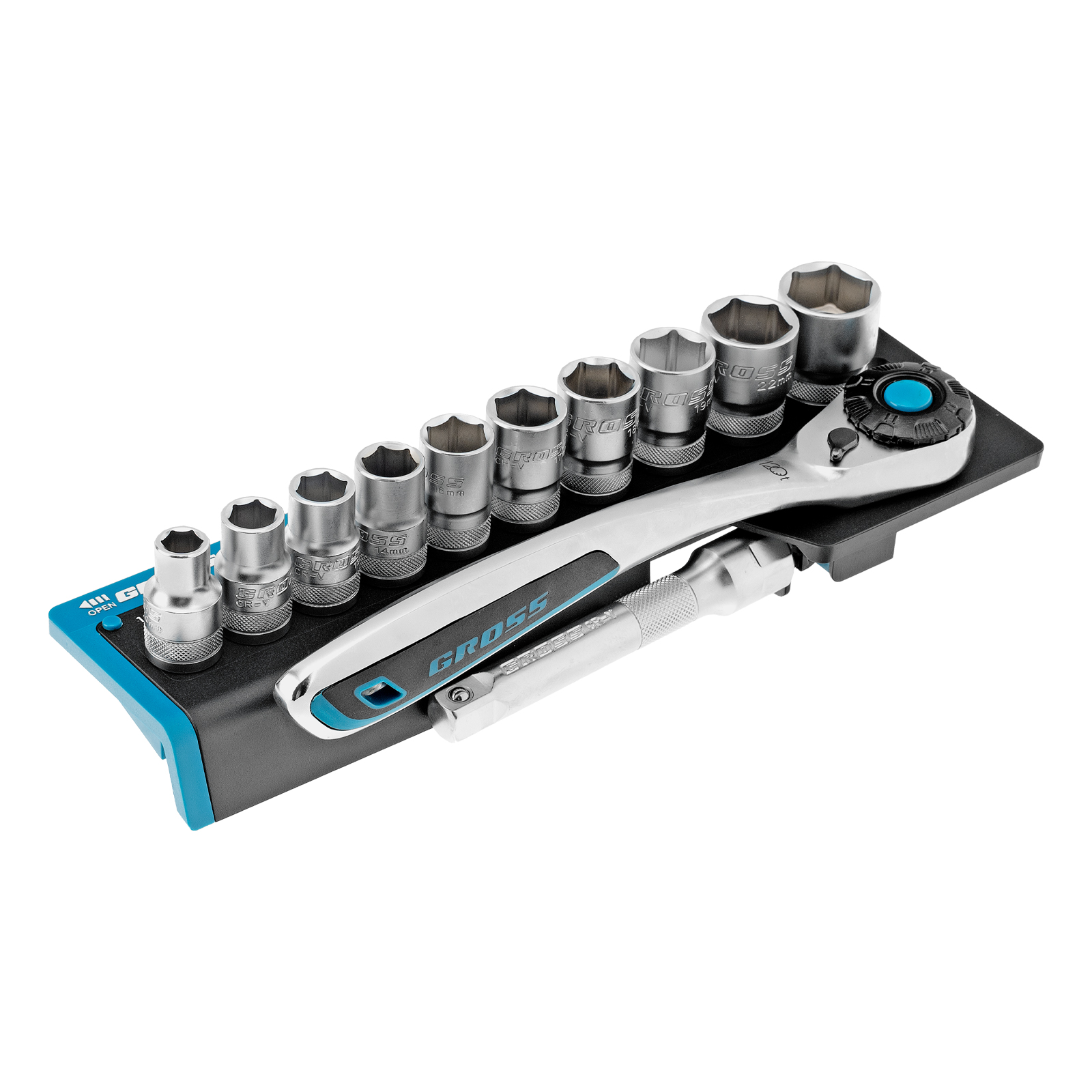 Набор Gross 14138 включает в себя 12 предметов из стали CrV-группы с посадочным квадратом 1/2 дюйма: 10 торцевых головок, трещотку со 120 зубьями и удлинитель 100 мм. Применяется для монтажа и демонтажа резьбовых соединений при проведении технического обслуживания авто или для бытовых ремонтных работ. Набор подходит не только для самостоятельного использования в гараже и дома, но и для профессиональной эксплуатации на станциях техобслуживания.