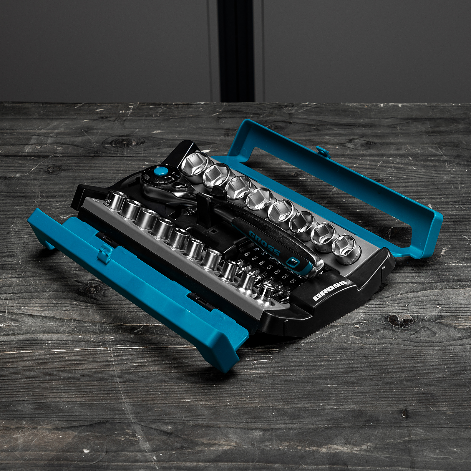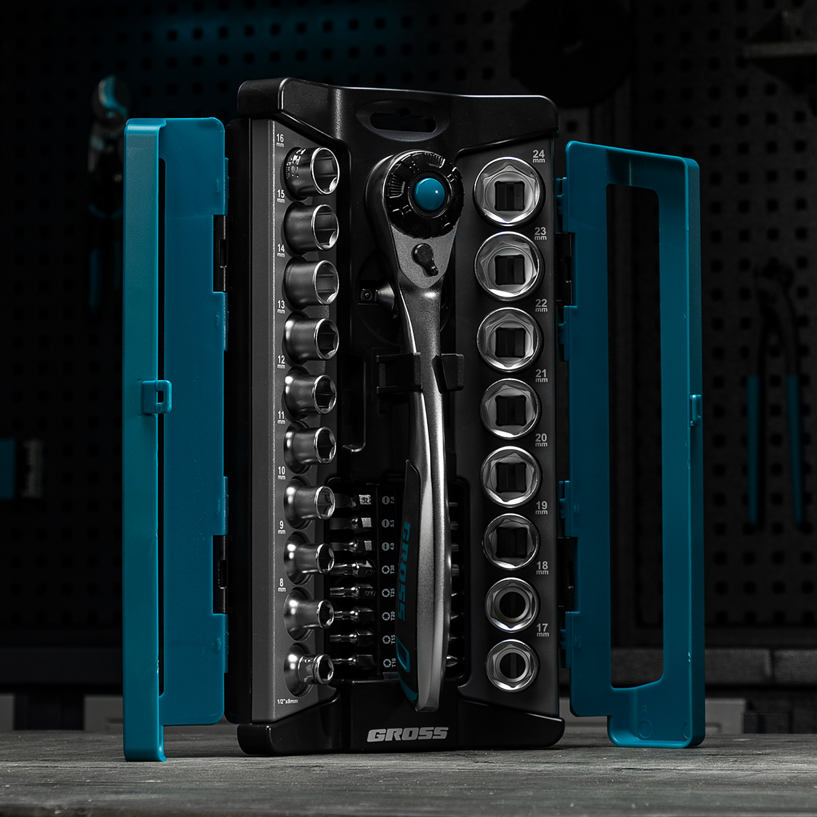 Набор Gross 14144 включает в себя 36 предметов с посадочным квадратом 1/2″: 17 торцевых головок, трещотку со 120 зубьями, переходник, адаптер и 16 бит. Применяется для монтажа и демонтажа резьбовых соединений при проведении технического обслуживания авто или для бытовых ремонтных работ. Набор подходит не только для самостоятельного использования в гараже и дома, но и для профессиональной эксплуатации на станциях техобслуживания.