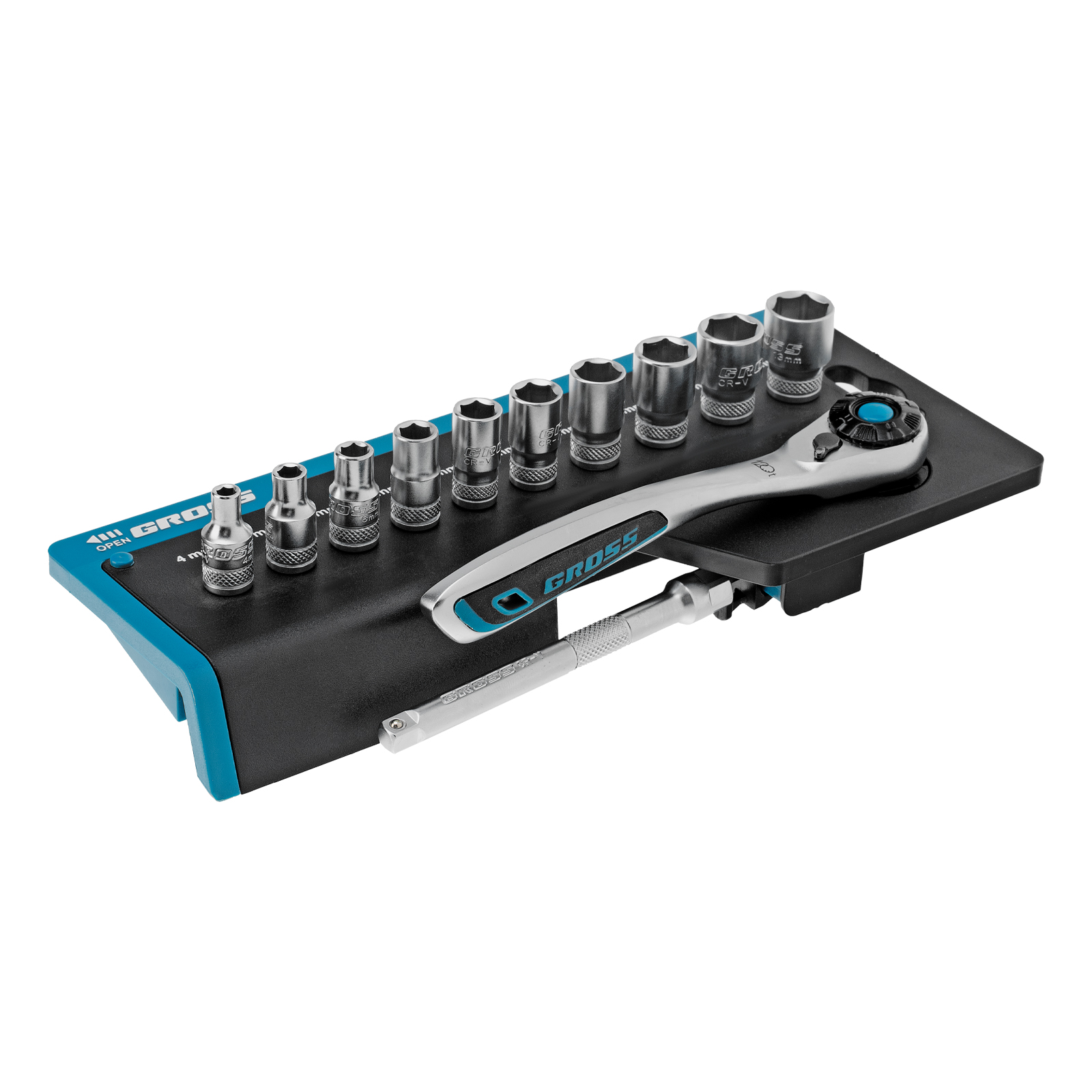 Набор Gross 14141 включает в себя 12 предметов из стали CrV-группы с посадочным квадратом 1/4 дюйма: 10 торцевых головок, трещотку со 120 зубьями и удлинитель 100 мм. Применяется для монтажа и демонтажа резьбовых соединений при проведении технического обслуживания авто или для бытовых ремонтных работ. Набор подходит не только для самостоятельного использования в гараже и дома, но и для профессиональной эксплуатации на станциях техобслуживания.
