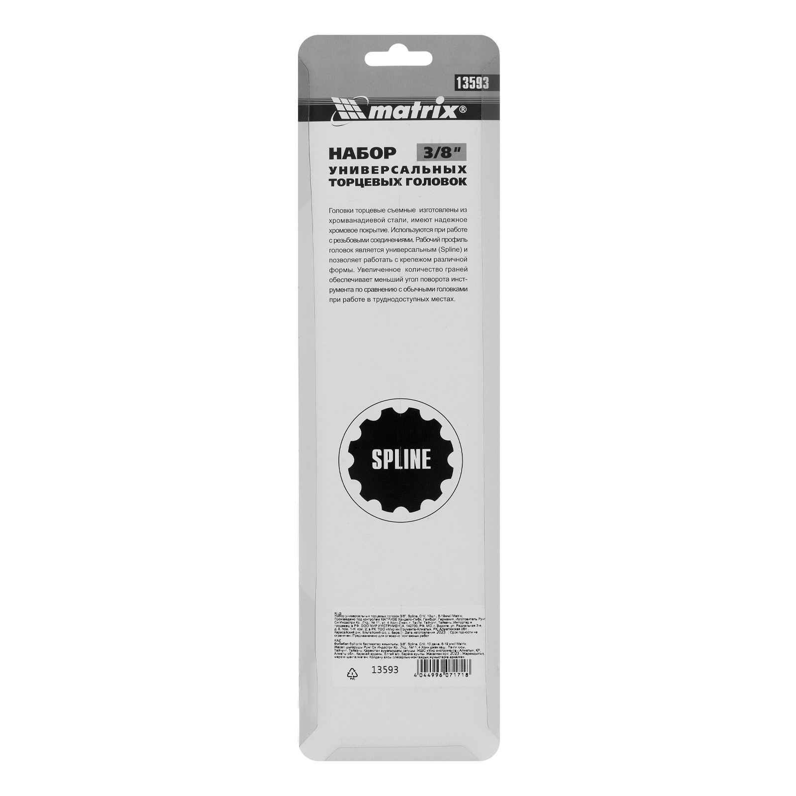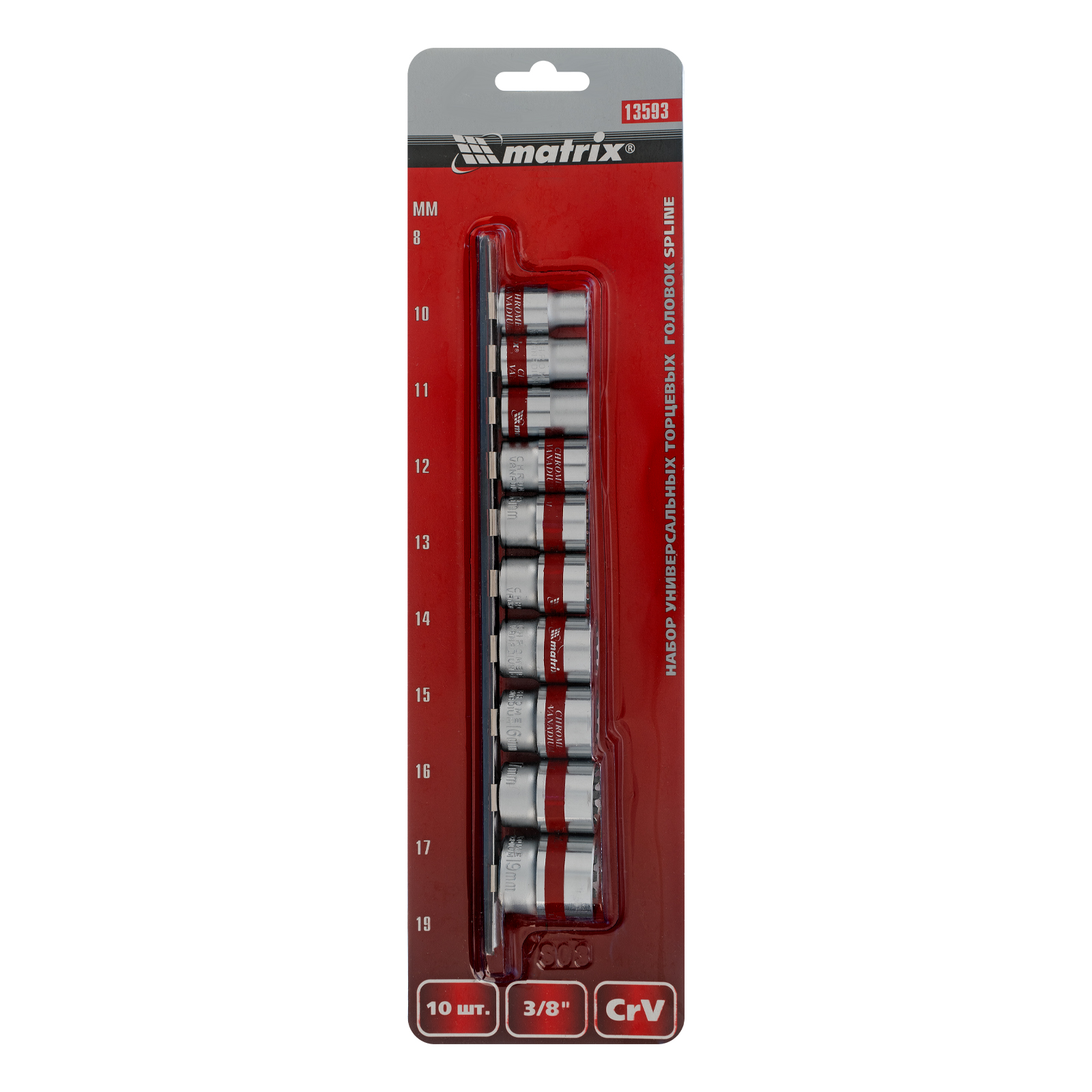 Набор универсальных торцевых головок Matrix 13593 с 12-гранным профилем Spline состоит из 10 насадок 8-19 мм из стали CrV-группы, с присоединительным квадратом 3/8". Они используются для работы с резьбовыми соединениями и подходят для всех видов крепежа. Набор будет полезен дома, на даче или в гараже.