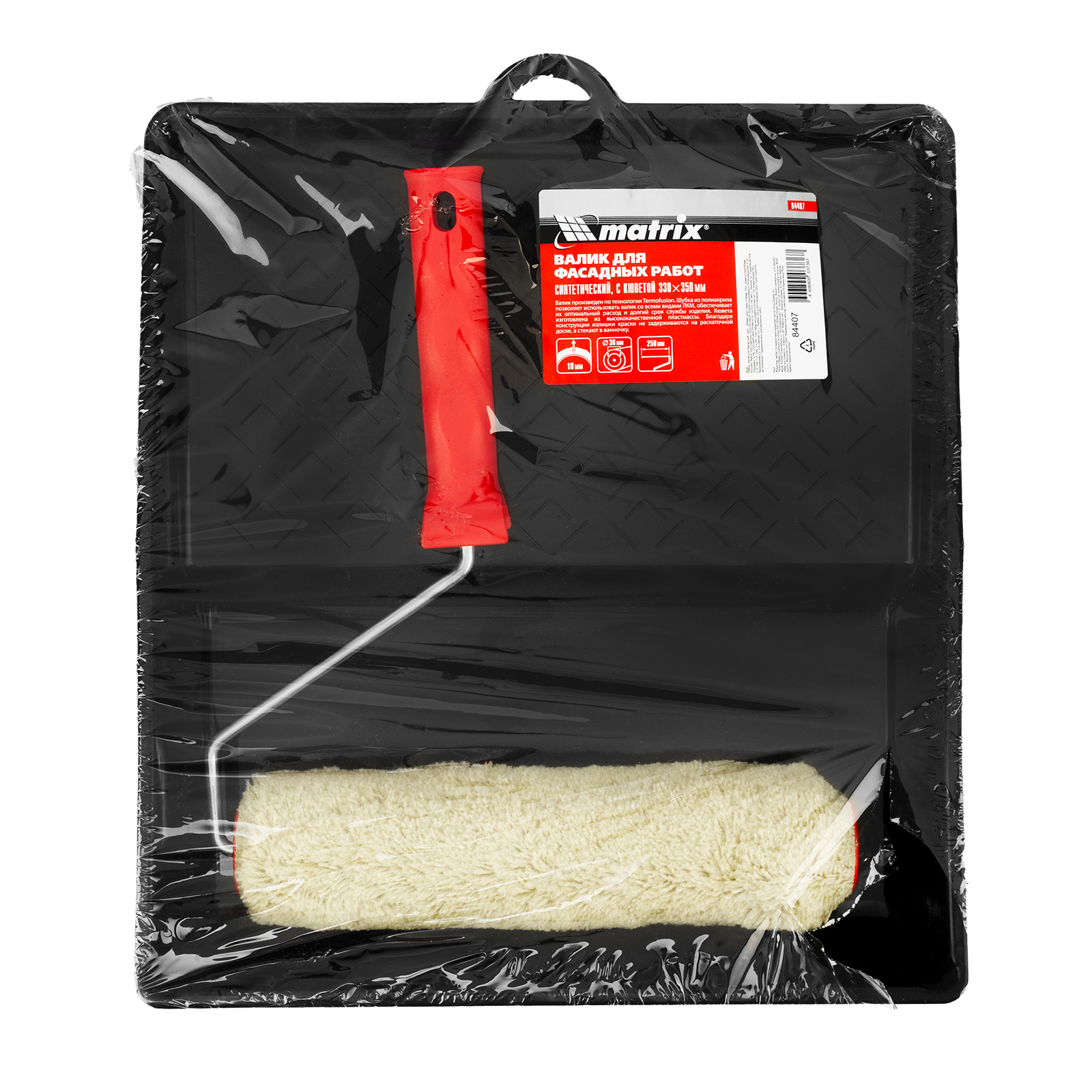 Набор Matrix 84407 включает в себя кювету размером 330 х 350 мм и синтетический валик для фасадных работ с ворсом 18 мм из полиакрила, шириной 250 мм и диаметром 36 мм. Валик используется для окрашивания фасадов зданий, необработанной древесины, участков с грубой штукатуркой, кирпича, бетона, гофрированного металла и других текстурных поверхностей. Полиакрил подходит для работы с лакокрасочными материалами на водной основе и на основе растворителей. Длинноворсовая шубка отлично прокрашивает неровности без разбрызгивания ЛКМ. Универсальная кювета предназначена для набора краски, раскатывания и отжима валиков шириной до 250 мм.