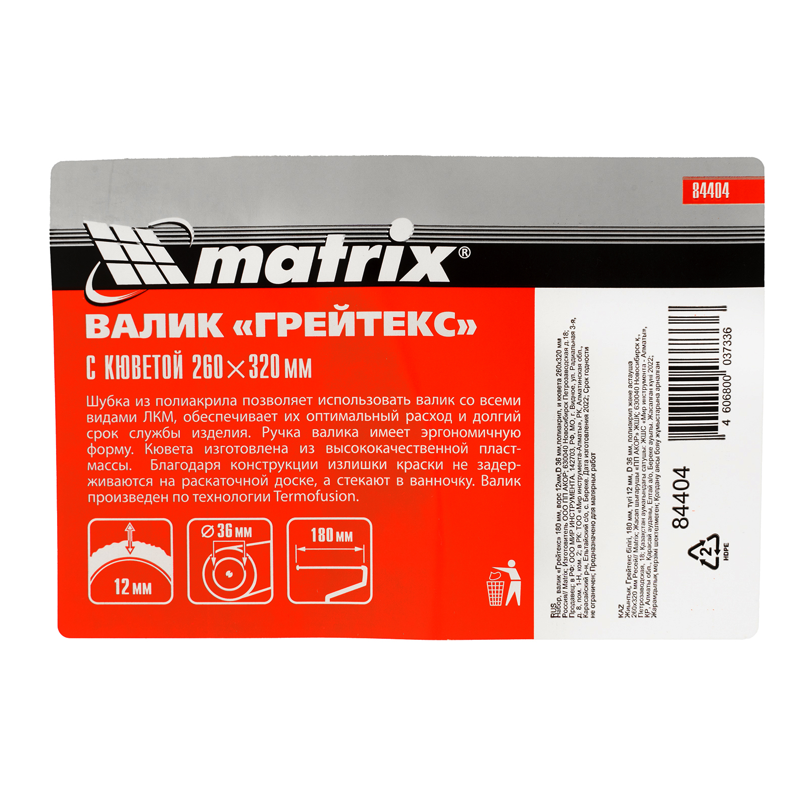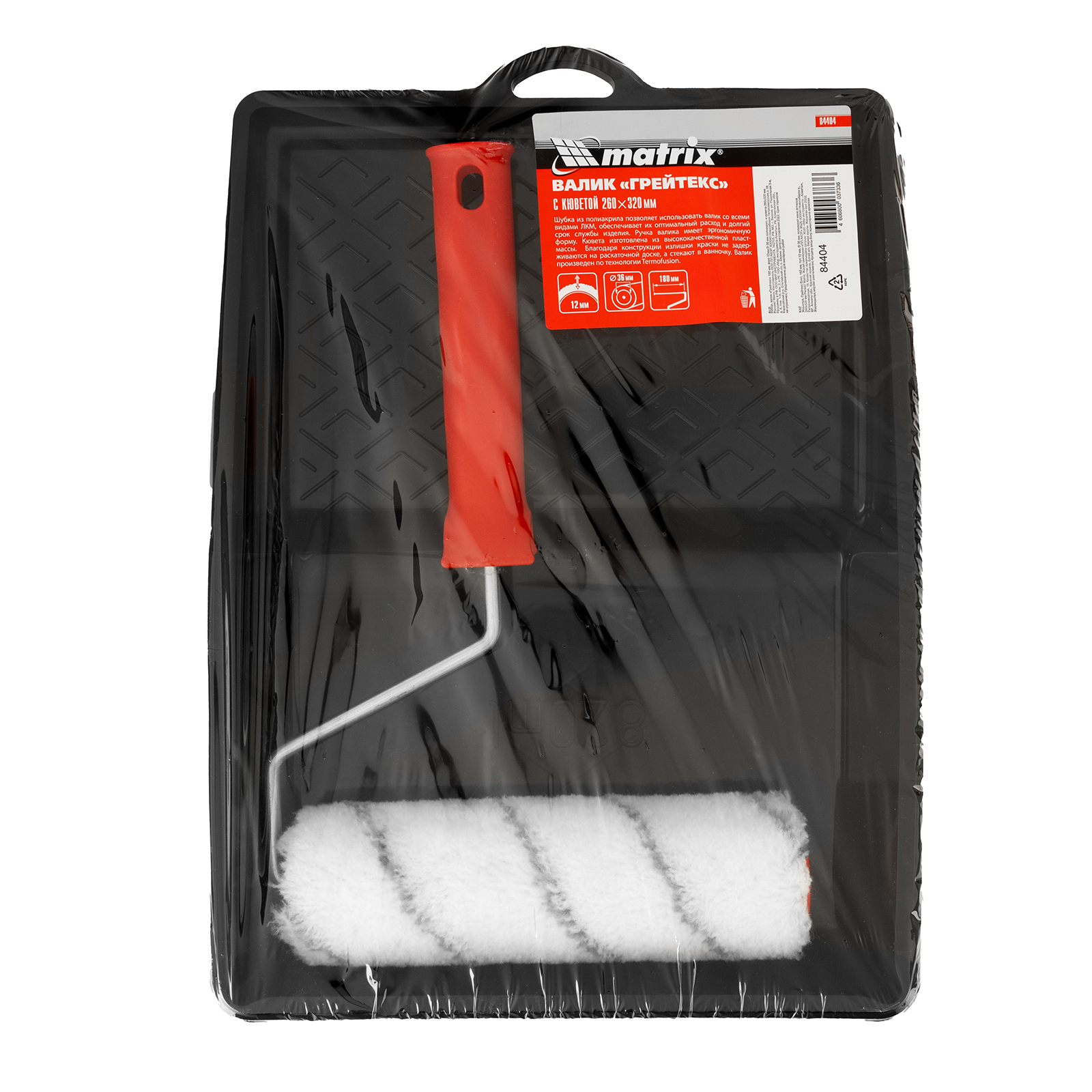 Набор Matrix 84404 включает валик «Грейтекс» размером 180 х 36 мм, с ворсом 12 мм из полиакрила, и кювету размером 260 х 320 мм. Кювета подходит для валиков шириной 180 мм, позволяет набирать и равномерно распределять краску. Шубка из полиакрила подходит для малярных работ на средне-гладких поверхностях с ЛКМ любого типа, в том числе содержащими растворители.