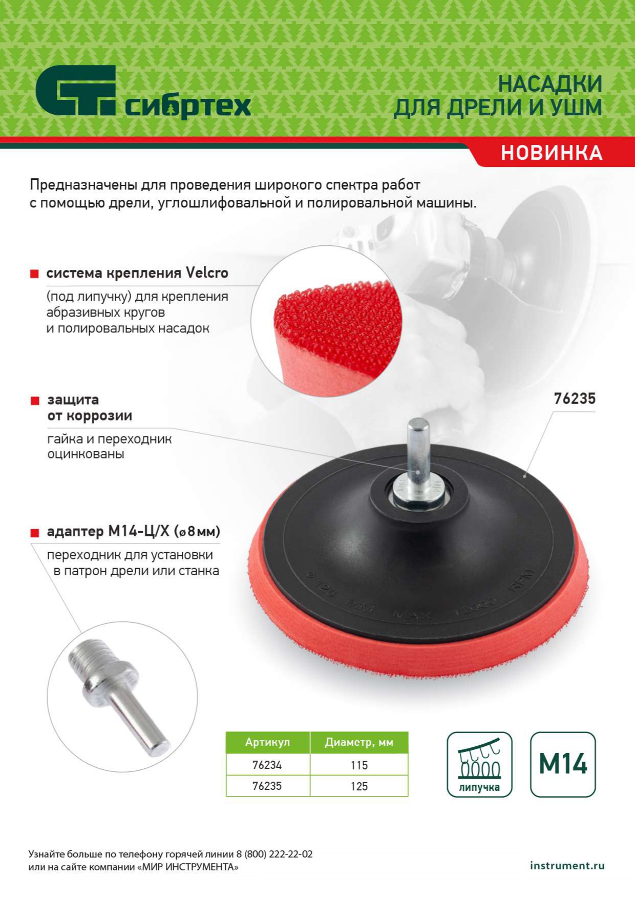 Насадка (опорная тарелка) ТМ Сибртех 76234 предназначена для проведения шлифовальных и полировальных работ с помощю абразивных кругов и полировальных насадок с креплением velcro (под липучку) соответствующего типоразмера.