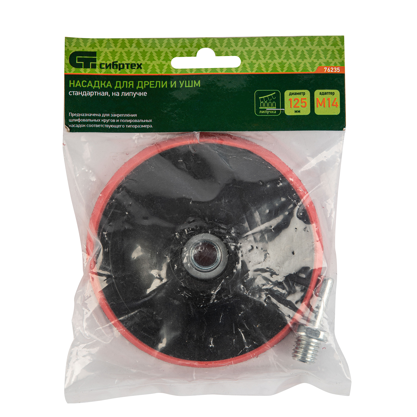 Насадка (опорная тарелка) ТМ Сибртех 76235 предназначена для проведения шлифовальных и полировальных работ с помощю абразивных кругов и полировальных насадок с креплением velcro (под липучку) соответствующего типоразмера.
