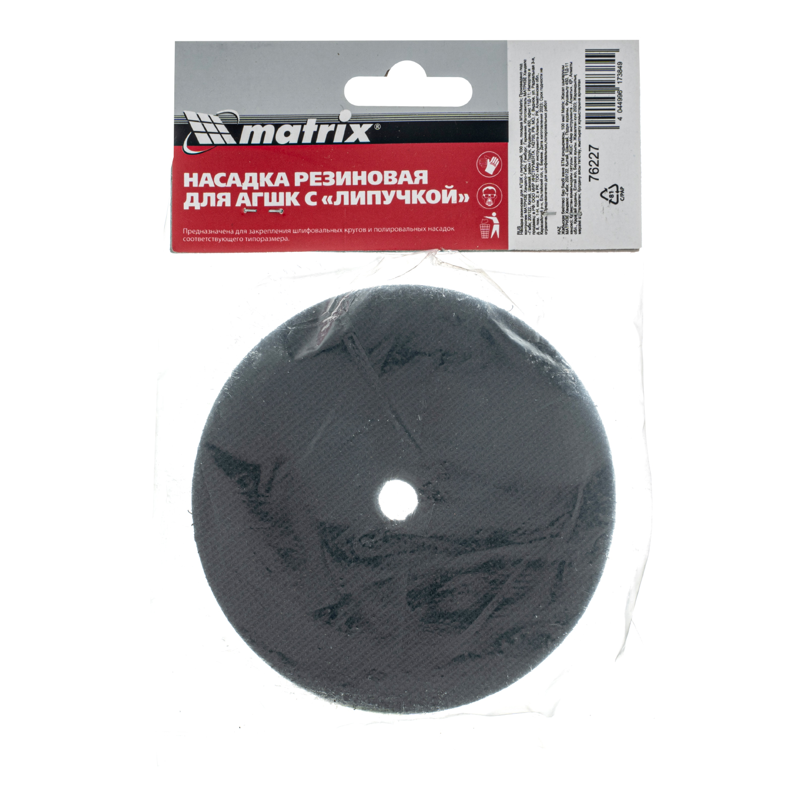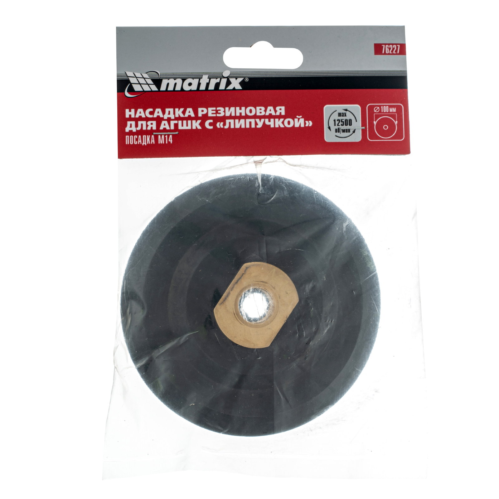 <p>Резиновая насадка для АГШК с «липучкой» Matrix 76227 диаметром 100 мм, с посадочной резьбой М14, — опора для крепления алмазных гибких шлифовальных кругов, или «черепашек». Совместима с углошлифовальными машинами, работающими с частотой вращения до 12500 об/мин. Изготовлена из прочной резины, обеспечивает хороший контакт шлифкруга с обрабатываемой поверхностью. Насадка применяется для шлифовки и полировки каменных, гранитных, мраморных и керамогранитных поверхностей.</p><h2>Преимущества</h2><ul><li>Быстрая установка оснастки — АГШК на «липучке» за несколько секунд крепится на нейлоновую контактную поверхность насадки с крючками (velcro).</li><li>Универсальность — насадку можно использовать для шлифовки как с водяным охлаждением, так и без него.</li><li>Дополнительные возможности — опорную тарелку можно установить на дрель при помощи переходника Matrix 76290 (приобретается отдельно).</li></ul>