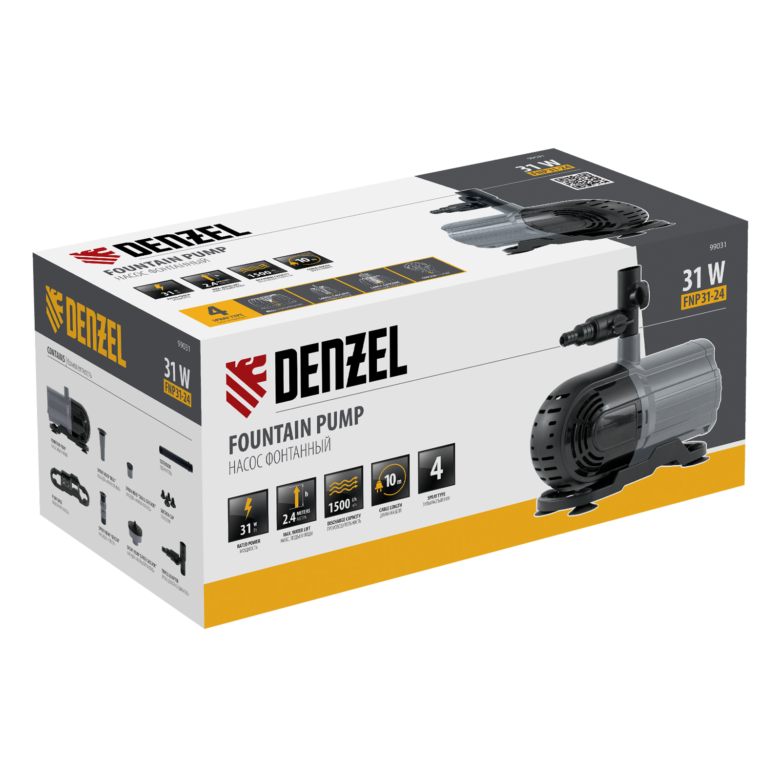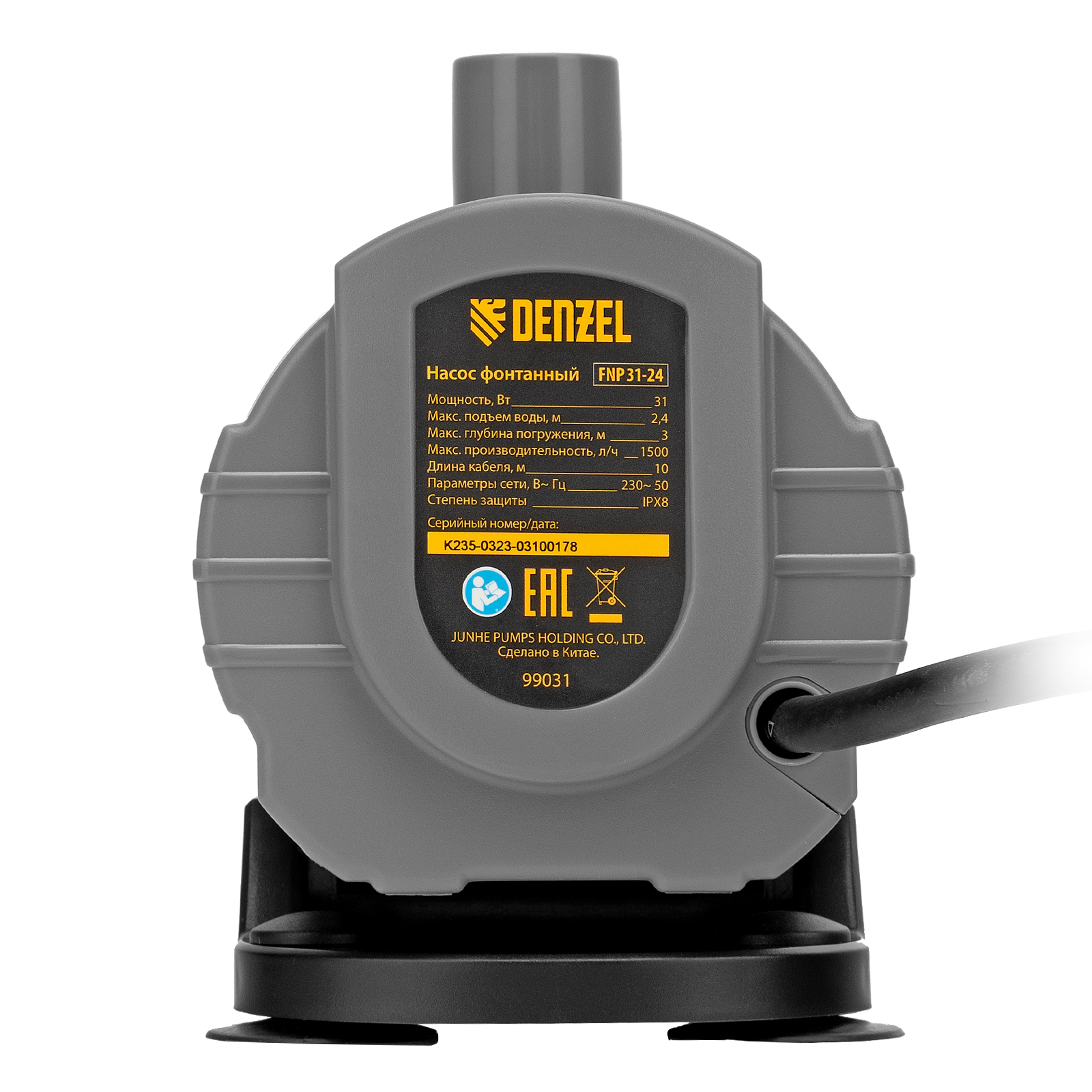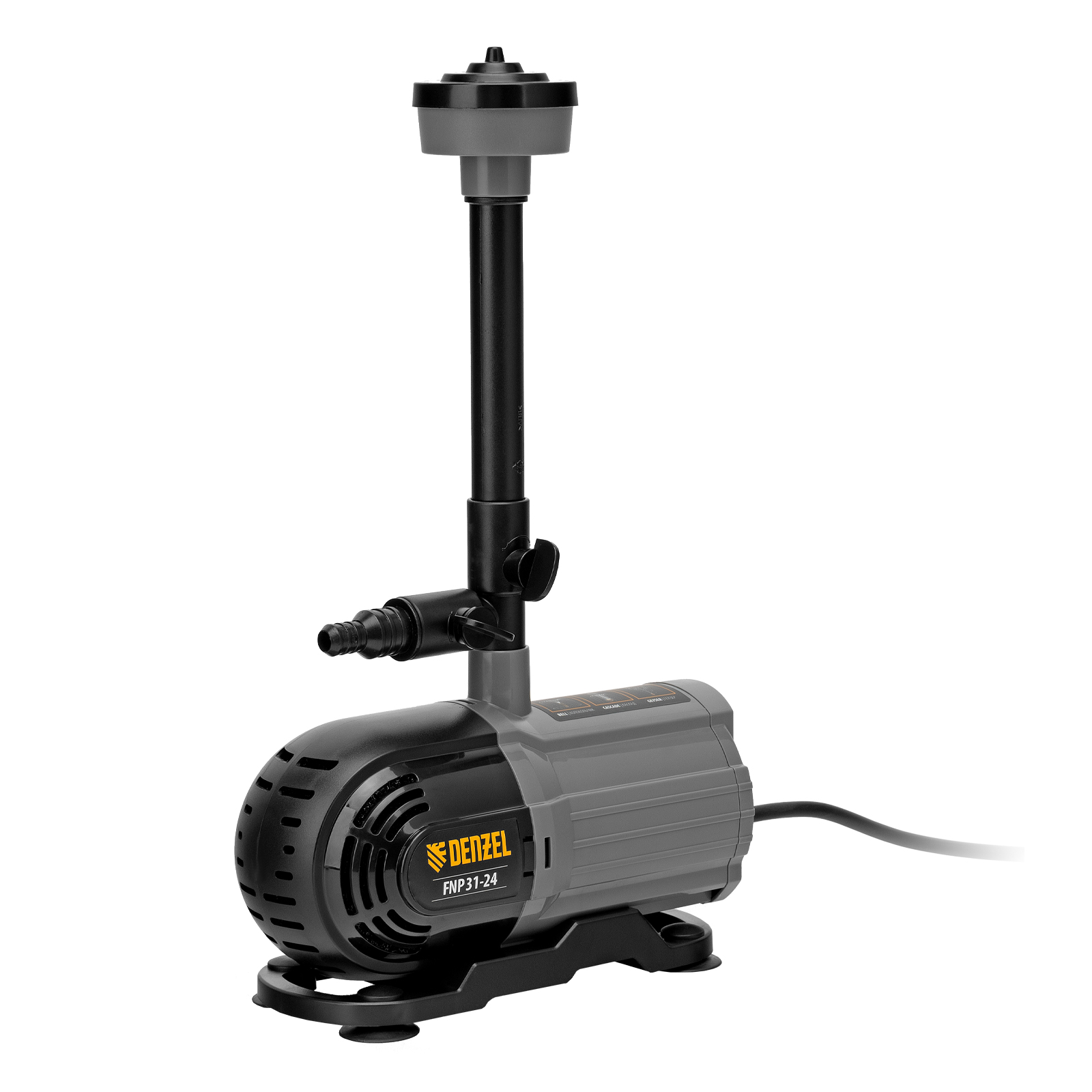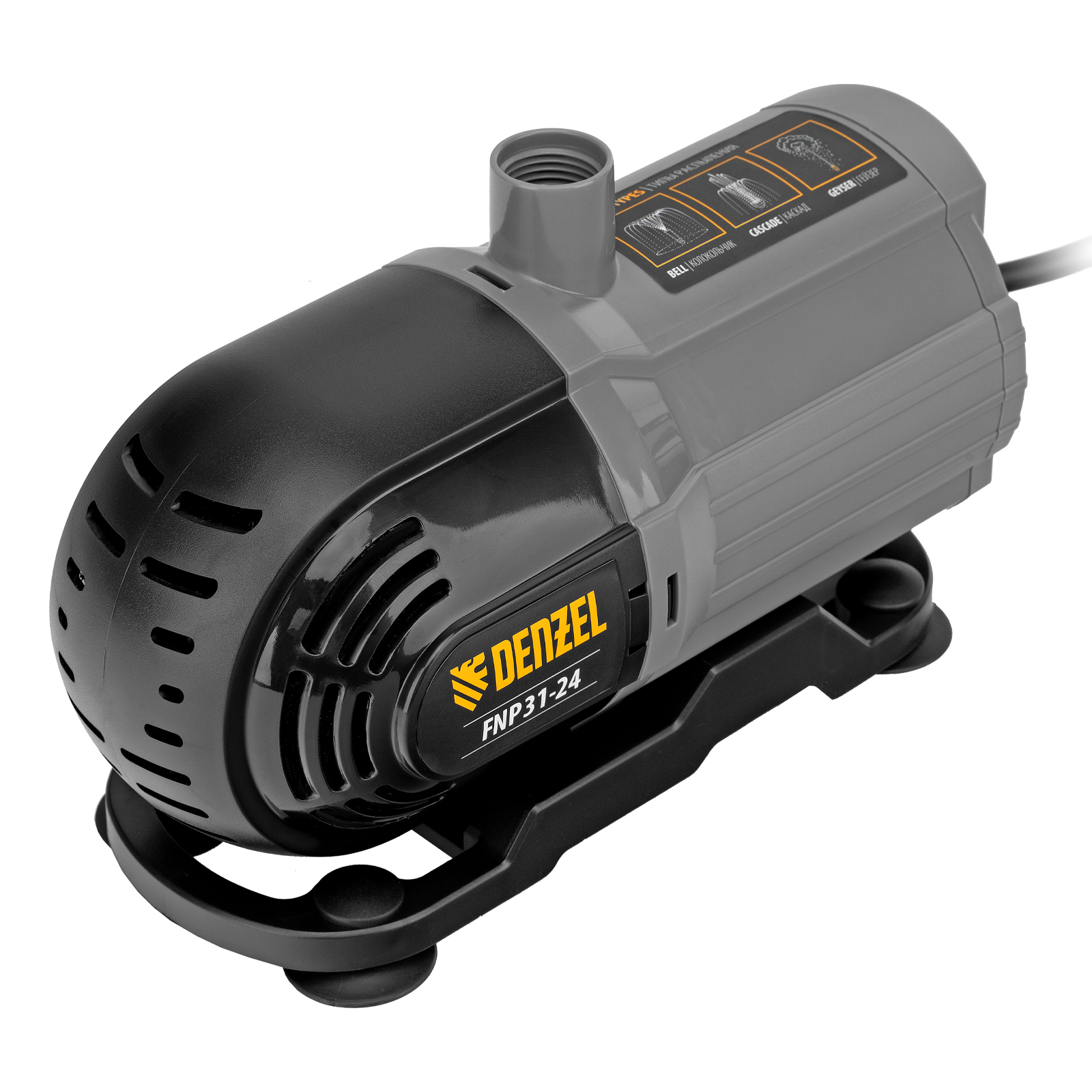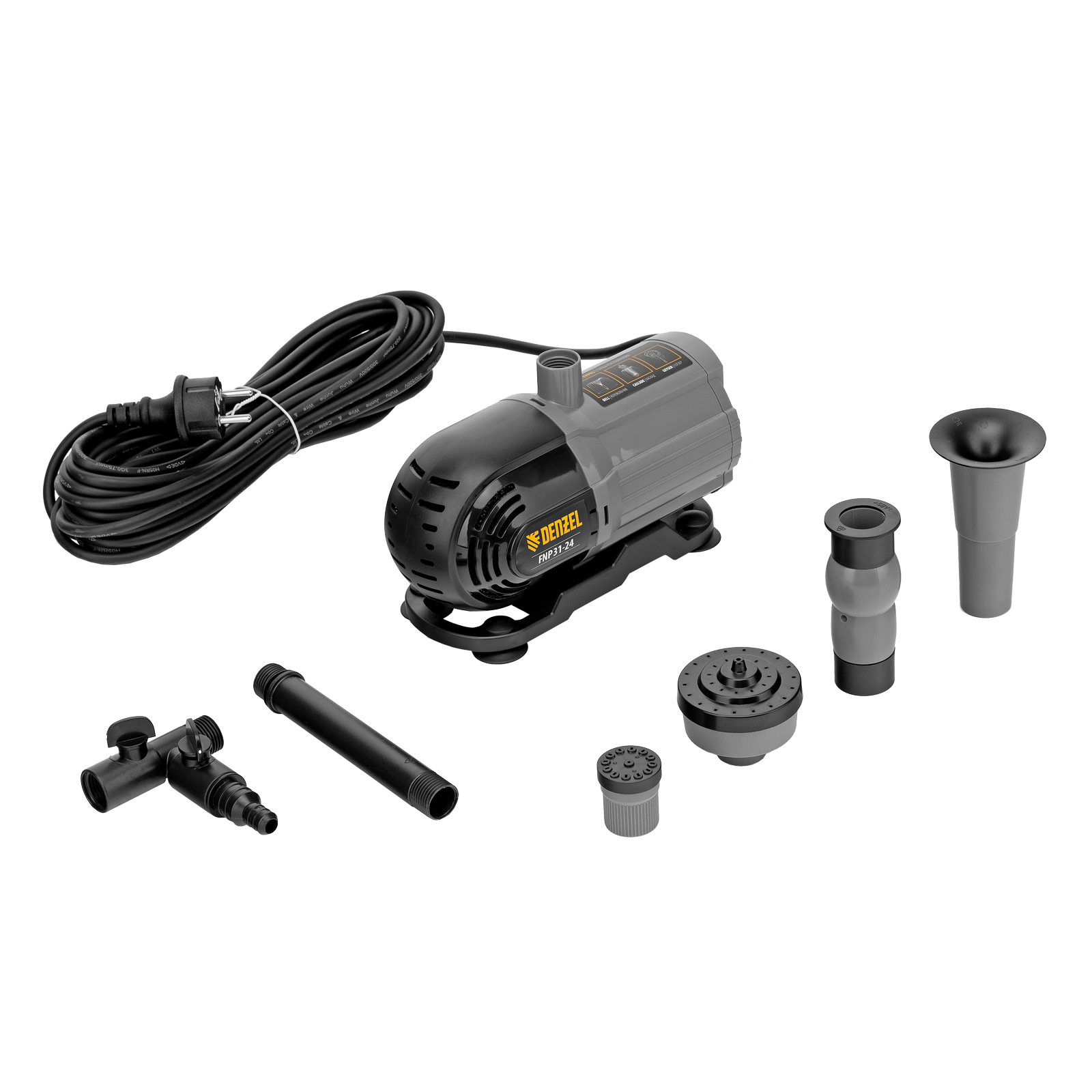 Фонтанный насос Denzel FNP31-24 99031 мощностью 31 Вт, с насадками колокольчик/гейзер/каскад, перекачивает 1500 л воды в час и обеспечивает максимальную высоту подъема 2,4 м. Позволяет создать декоративный фонтан, украсив водоем и оживив ландшафт дачного участка. Установив одну из входящих в комплект насадок, можно получить наиболее подходящий тип струи: в виде колокольчика, гейзера, большого или малого каскада. Также в конструкции насоса предусмотрен специальный патрубок для создания водопада.