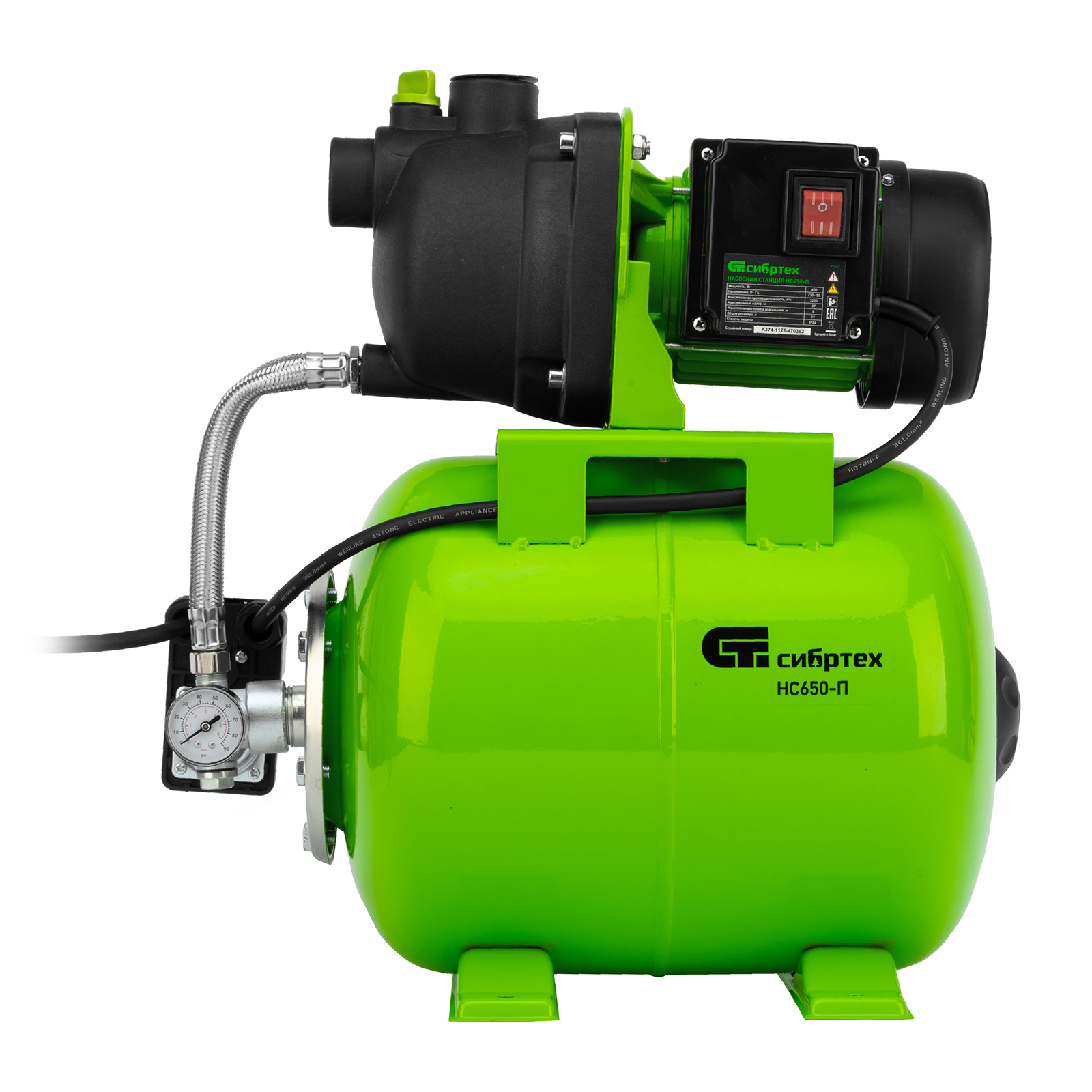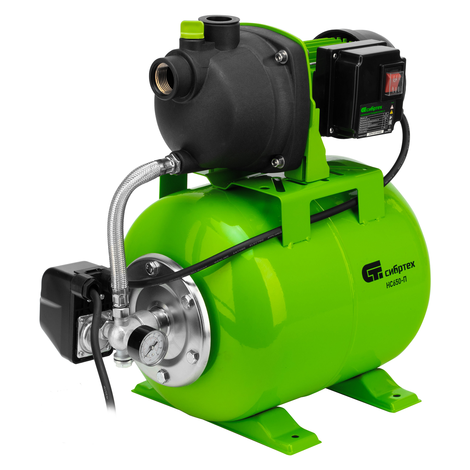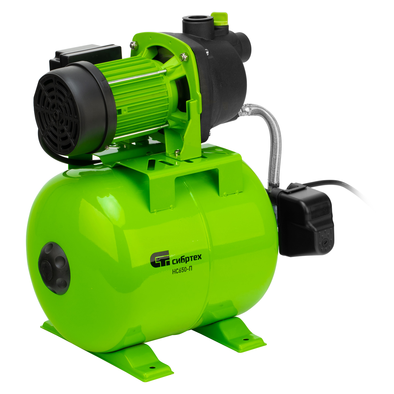 Насосная станция Сибртех НС650-П 97247 мощностью 650 Вт, с ресивером на 19 л, обеспечивает напор воды до 37 м и применяется для организации водоснабжения в частных домах и дачных коттеджах. Также подходит для стабилизации напора воды в квартирах. Надежный электродвигатель на 650 Вт обеспечивает скорость перекачивания до 53 л/мин под давлением до 2,8 бар.,Насосная станция оснащена ресивером, поэтому двигатель включается только после израсходования накопленного запаса воды. Автоматизация рабочего процесса позволяет разумно потреблять как воду, так и электроэнергию.