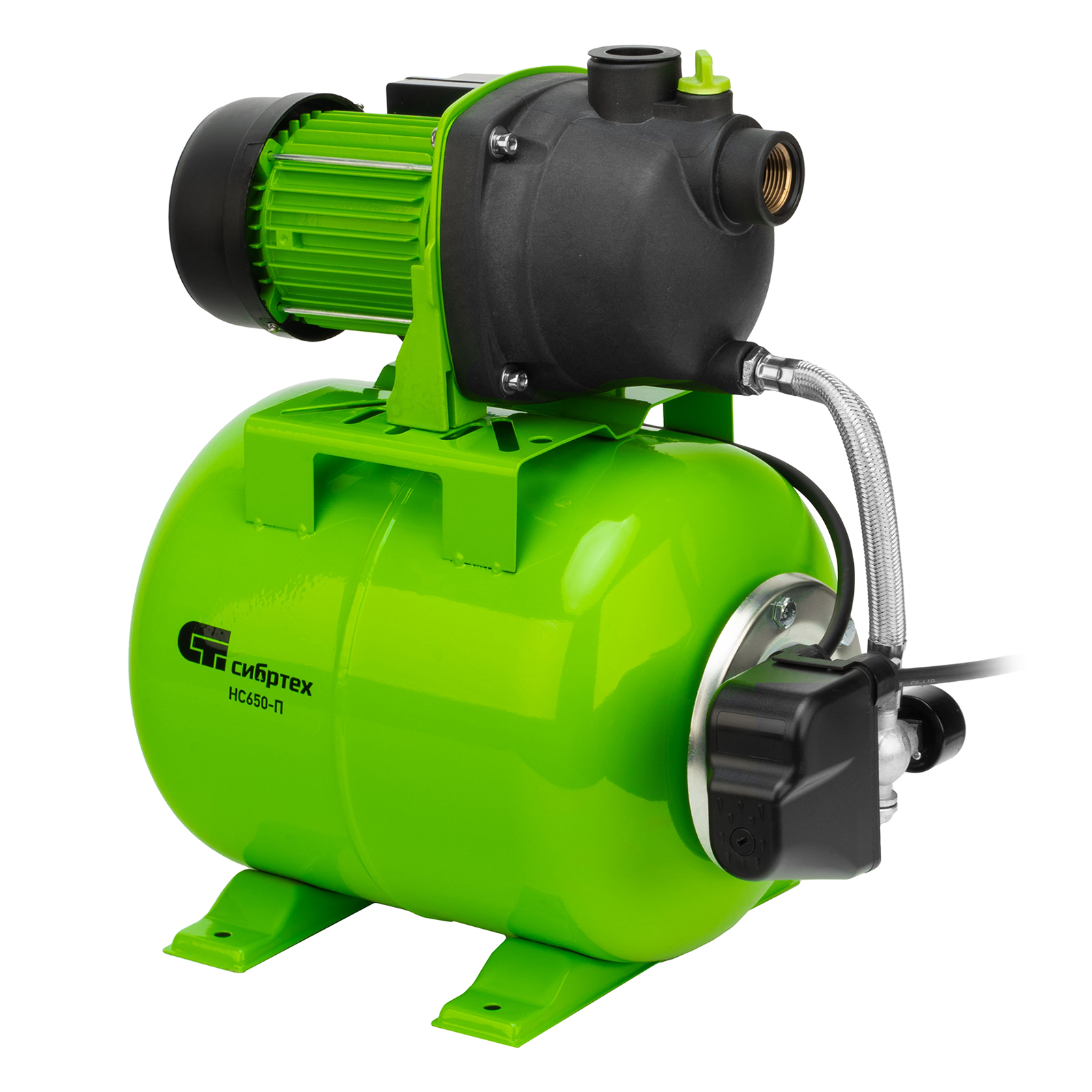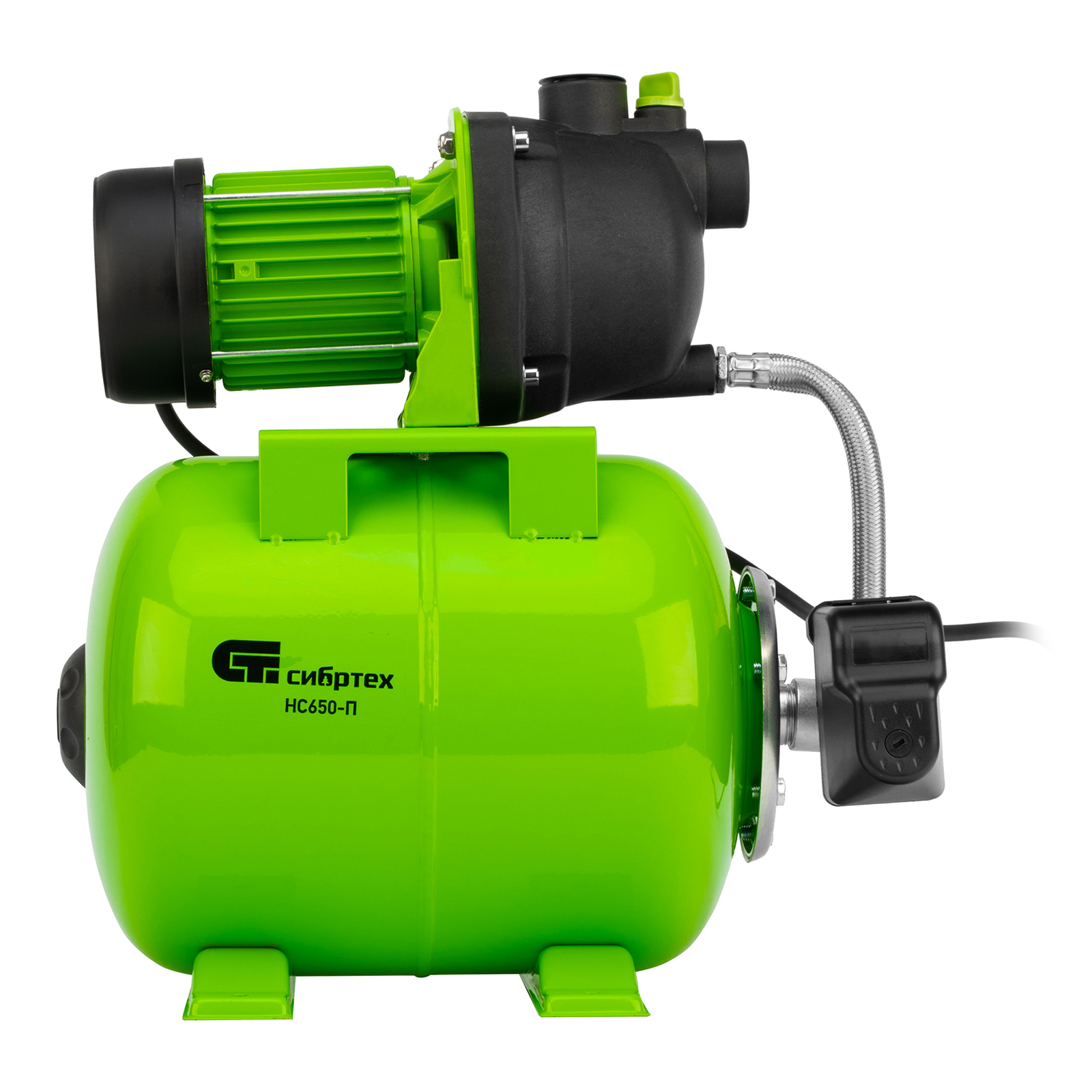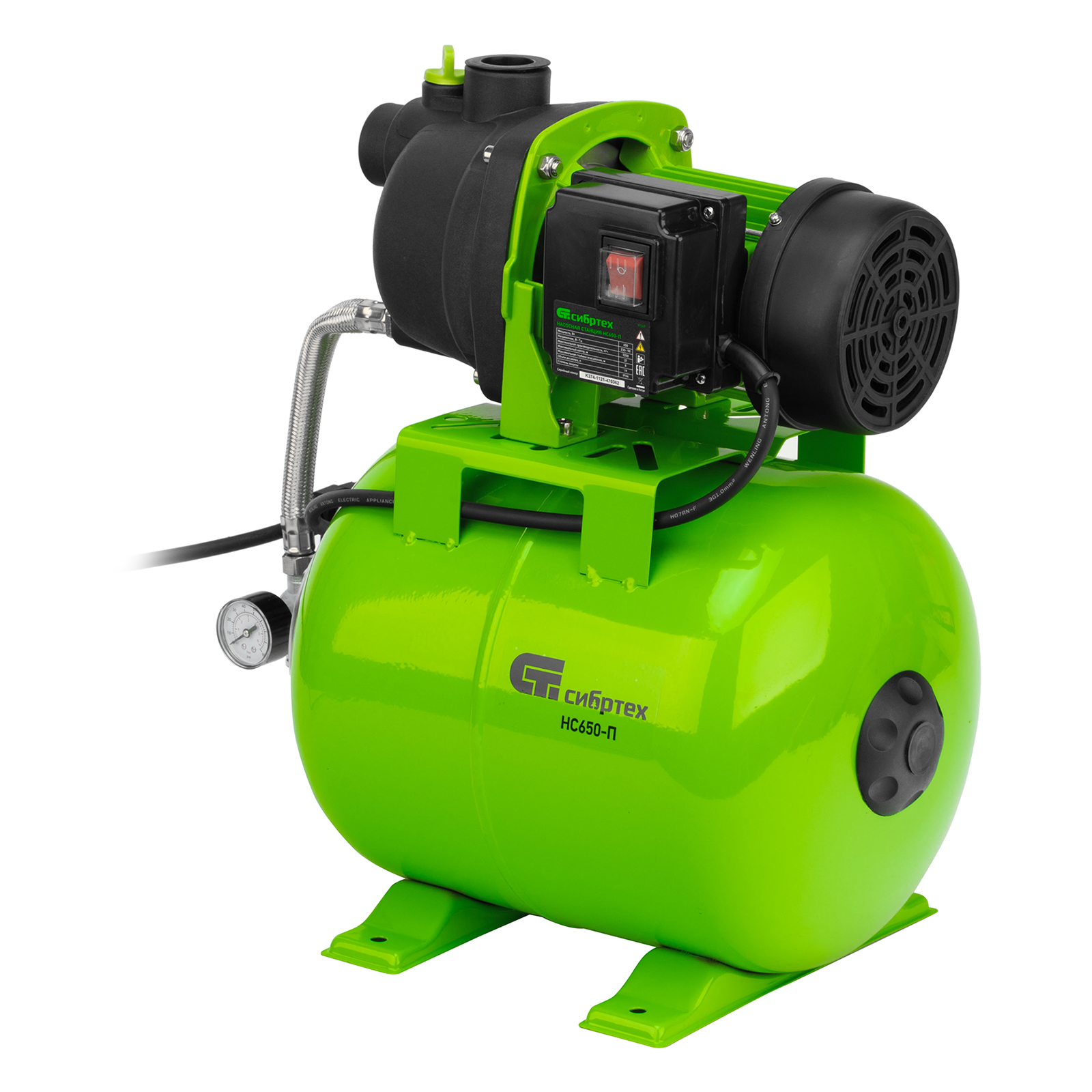 Насосная станция Сибртех НС650-П 97247 мощностью 650 Вт, с ресивером на 19 л, обеспечивает напор воды до 37 м и применяется для организации водоснабжения в частных домах и дачных коттеджах. Также подходит для стабилизации напора воды в квартирах. Надежный электродвигатель на 650 Вт обеспечивает скорость перекачивания до 53 л/мин под давлением до 2,8 бар.,Насосная станция оснащена ресивером, поэтому двигатель включается только после израсходования накопленного запаса воды. Автоматизация рабочего процесса позволяет разумно потреблять как воду, так и электроэнергию.