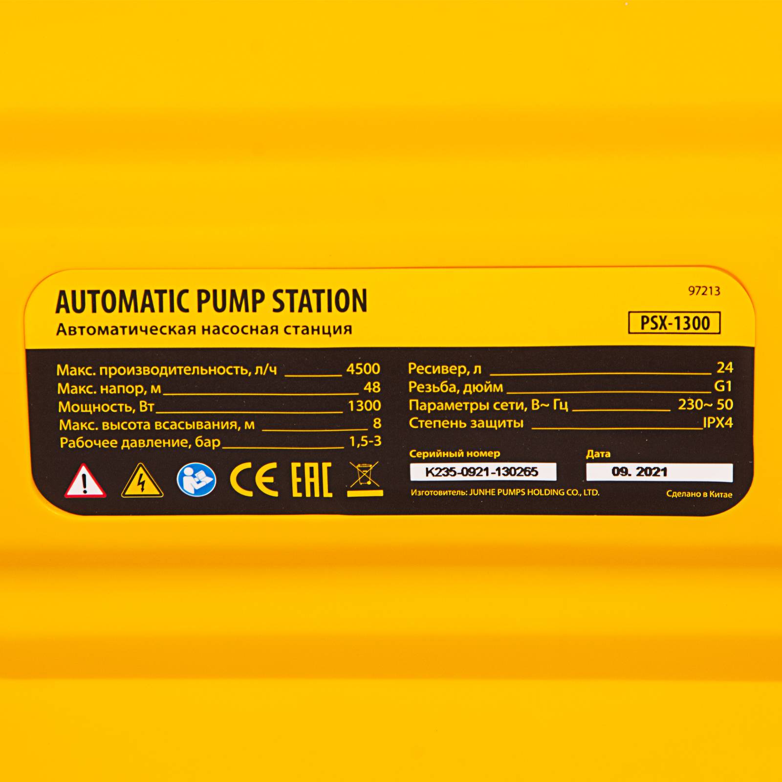 Насосная станция Denzel PSХ1300 97213 мощностью 1300 Вт оснащена ресивером на 24 л, работает со скоростью 4500 л/ч и обеспечивает подъем воды на высоту до 48 м. Позволяет в короткие сроки решить вопрос с водоснабжением частных домов и коттеджей, рядом с которыми находятся скважины, колодцы или водоемы естественного происхождения.,Станция обеспечивает бесперебойную работу в автоматическом режиме, останавливая и запуская электродвигатель в зависимости от расхода воды. Гидроаккумулятор объемом 24 литра позволяет экономно расходовать энергию и обеспечивает пользователей запасом воды в случае отключения электричества.