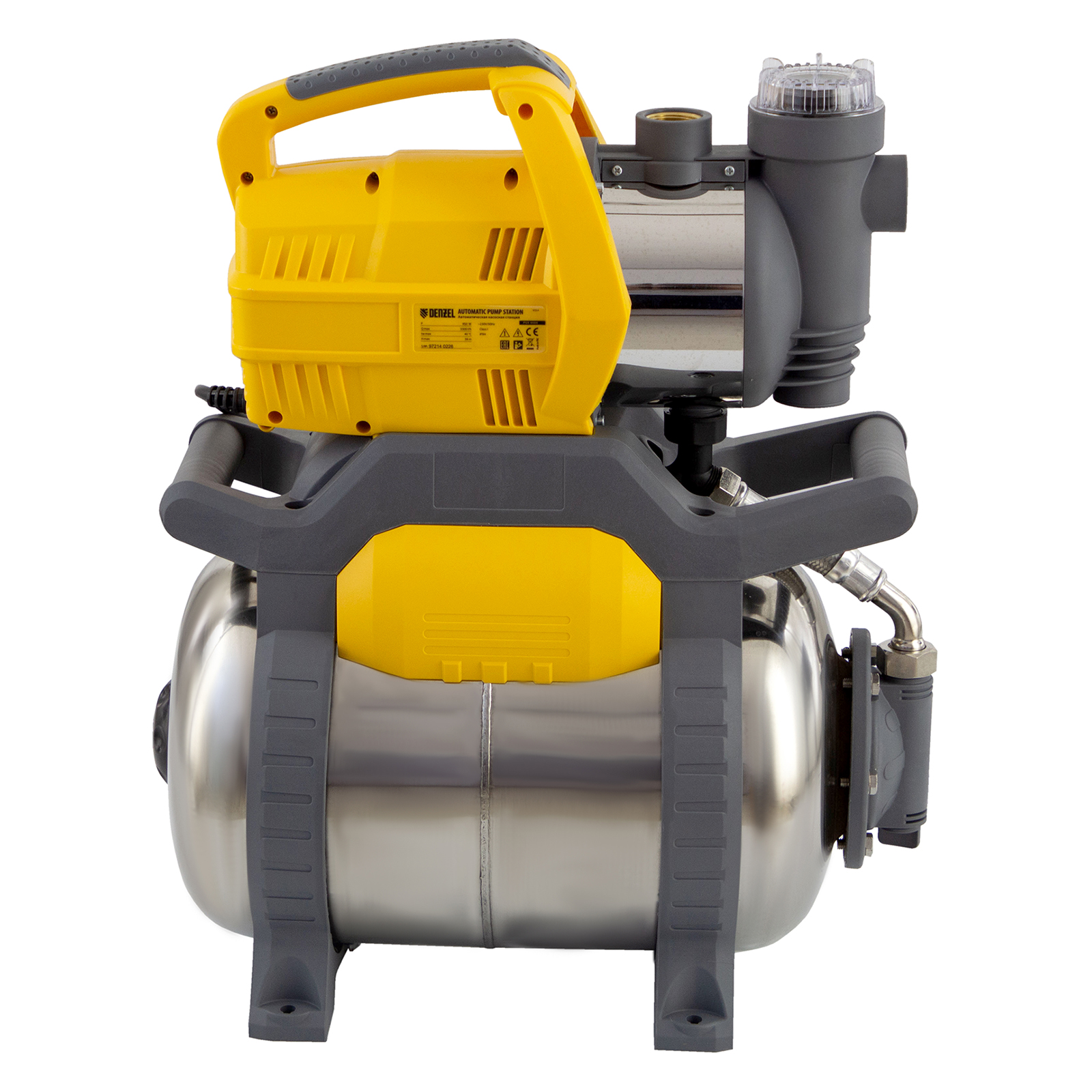 Насосная станция Denzel PSX950X 97214 мощностью 950 Вт и производительностью 3300 л/ч, с ресивером объемом 24 л из «нержавейки», обеспечивает подъем воды на высоту 38 м. Подходит для организации системы водоснабжения в загородном доме. Скорости перекачки до 3300 л/ч достаточно для обеспечения работы нескольких потребителей — в ванной, на кухне и в системе полива. Насосная станция способна выкачивать чистую воду из резервуаров и колодцев глубиной до 8 м. Гидроаккумулятор позволяет снизить частоту включений двигателя, а также обеспечивает запас воды в системе на случай отключения электричества.