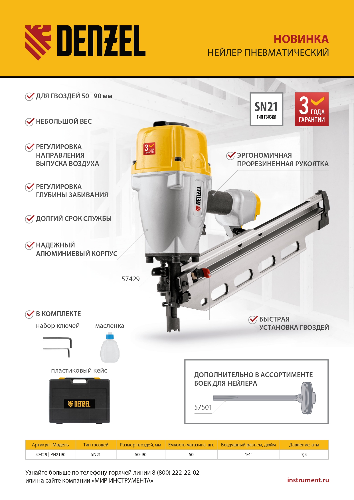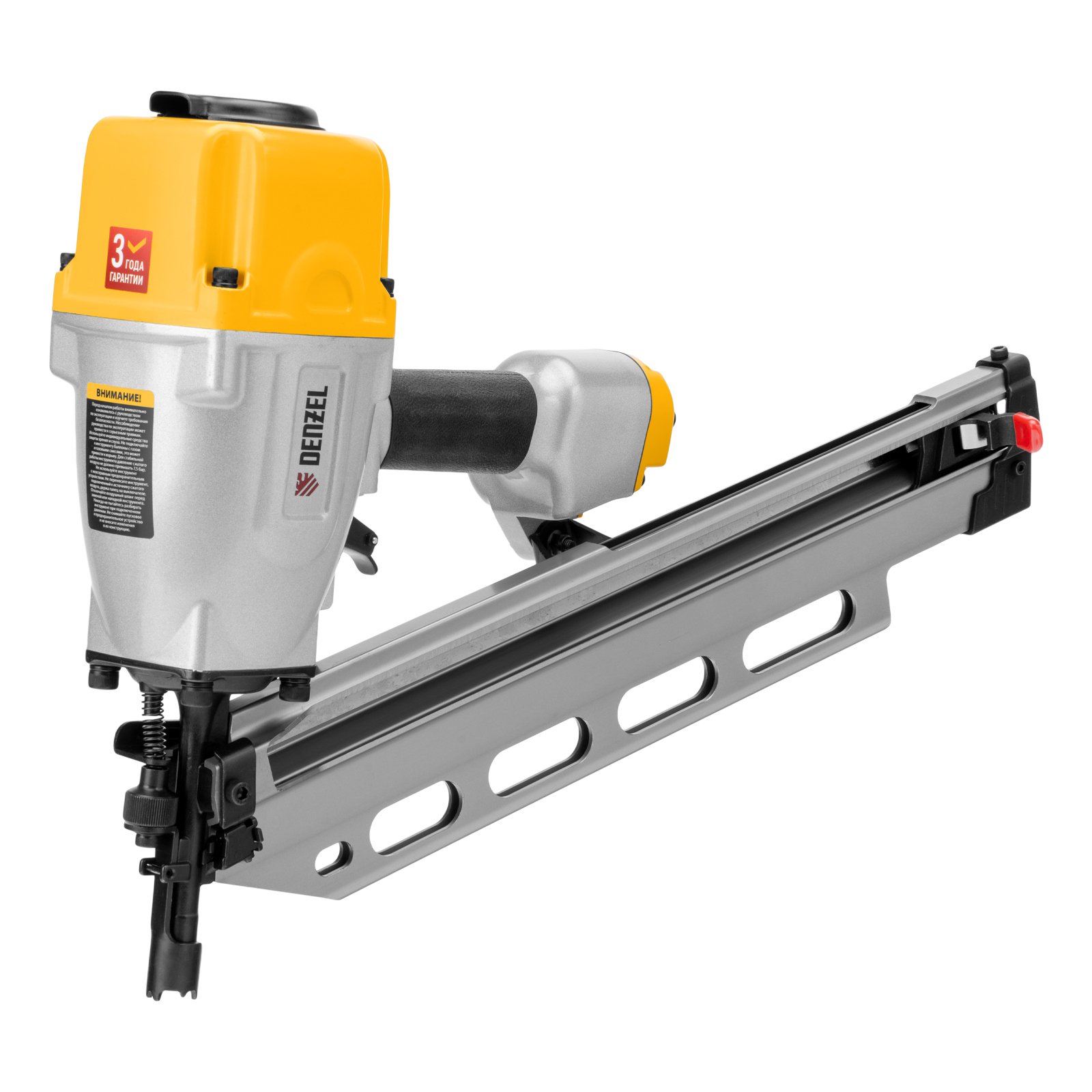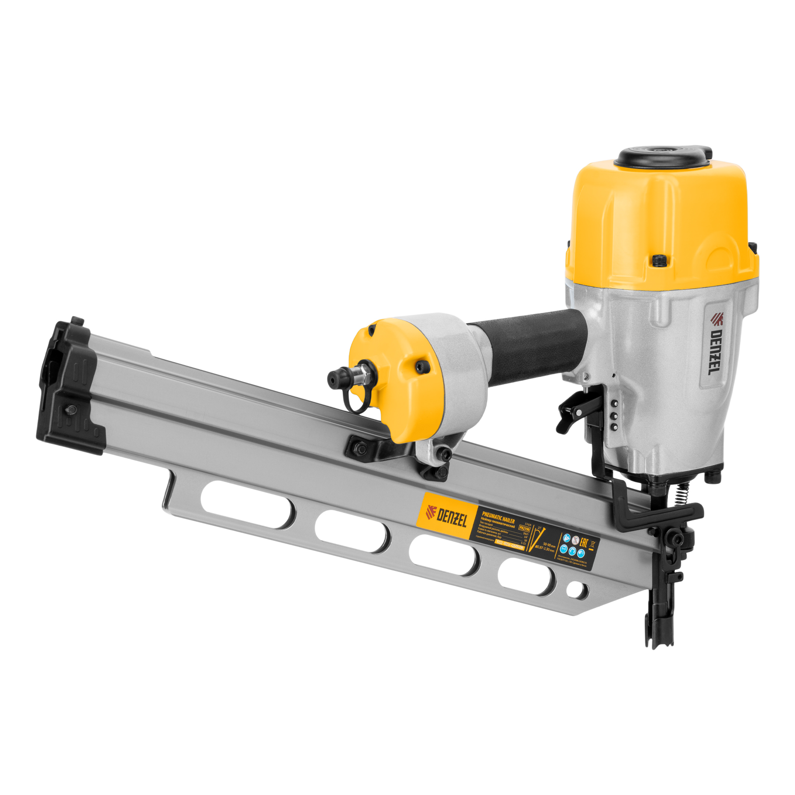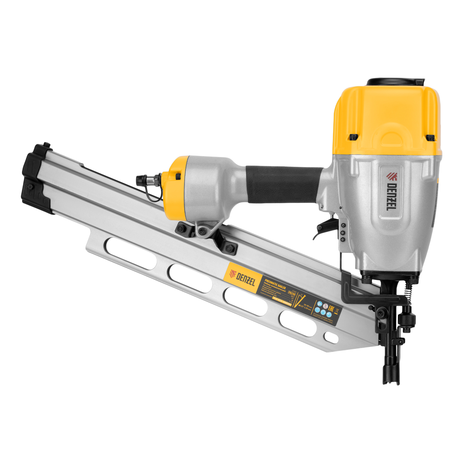 Пневматический нейлер Denzel PN2190 57429 предназначен для сборки каркасов деревянных домов, стяжки полов, а также выполнения других работ по креплению листовых материалов с помощью гвоздей SN21 длиной от 50 до 90 мм. Рабочее давление составляет 7,5 атмосфер, что обеспечивает эффективность и высокую скорость забивания крепежа. Инструмент также пригодится для сборки мебели, строительных и отделочных работ.