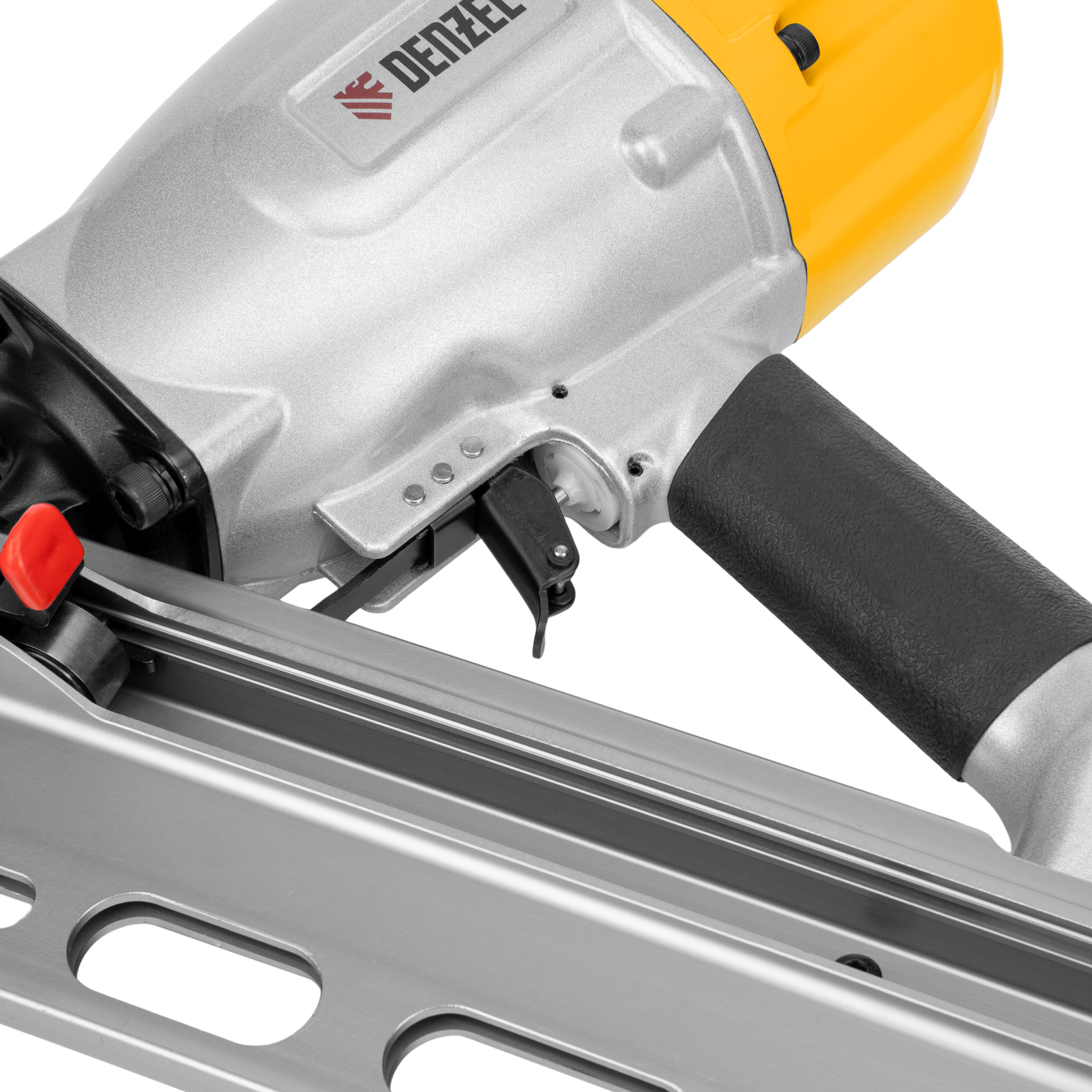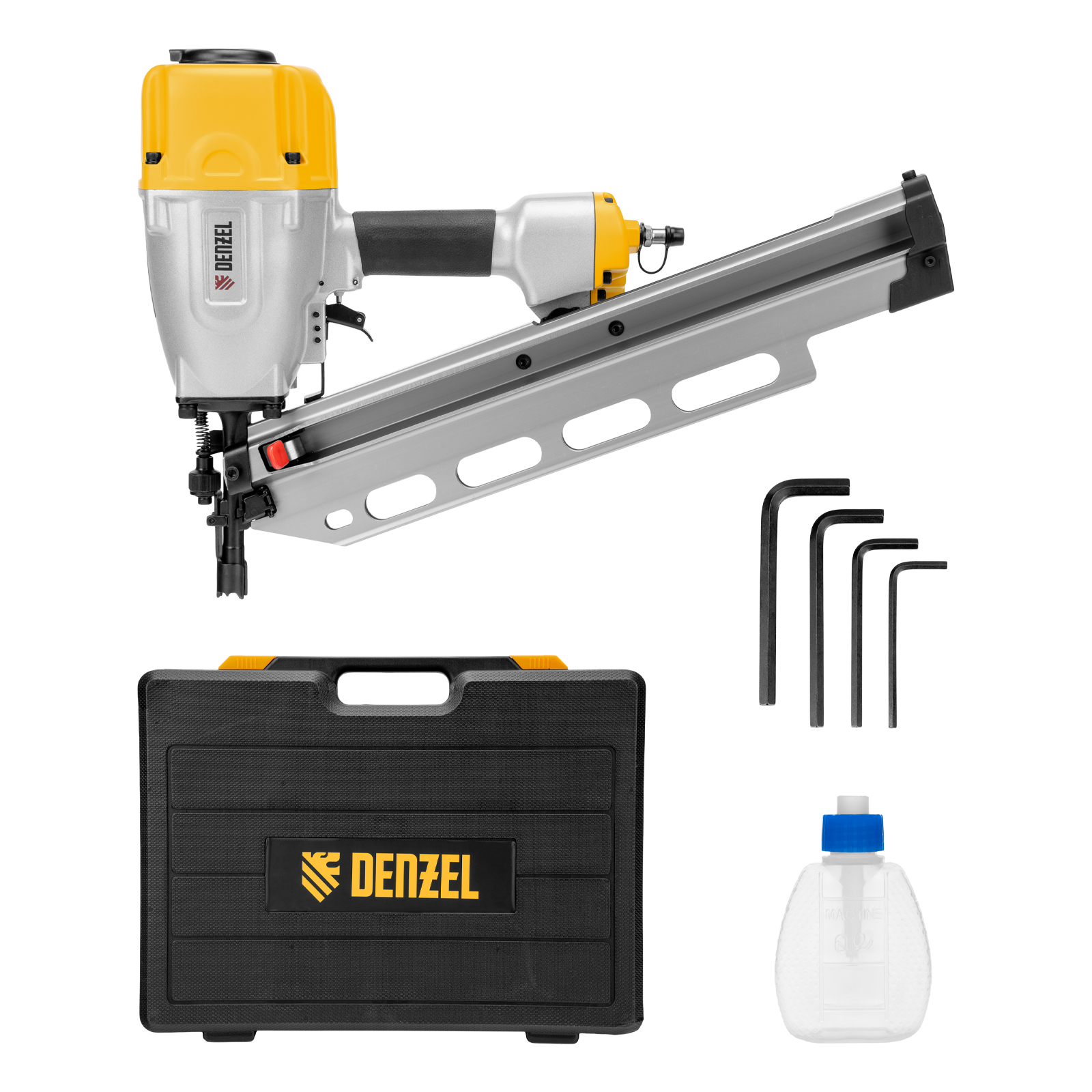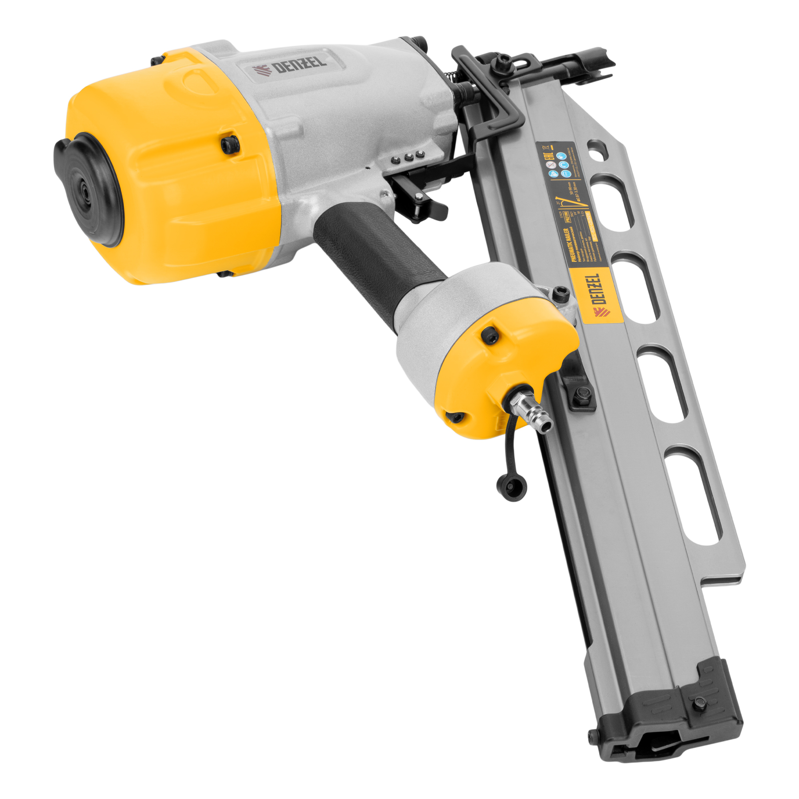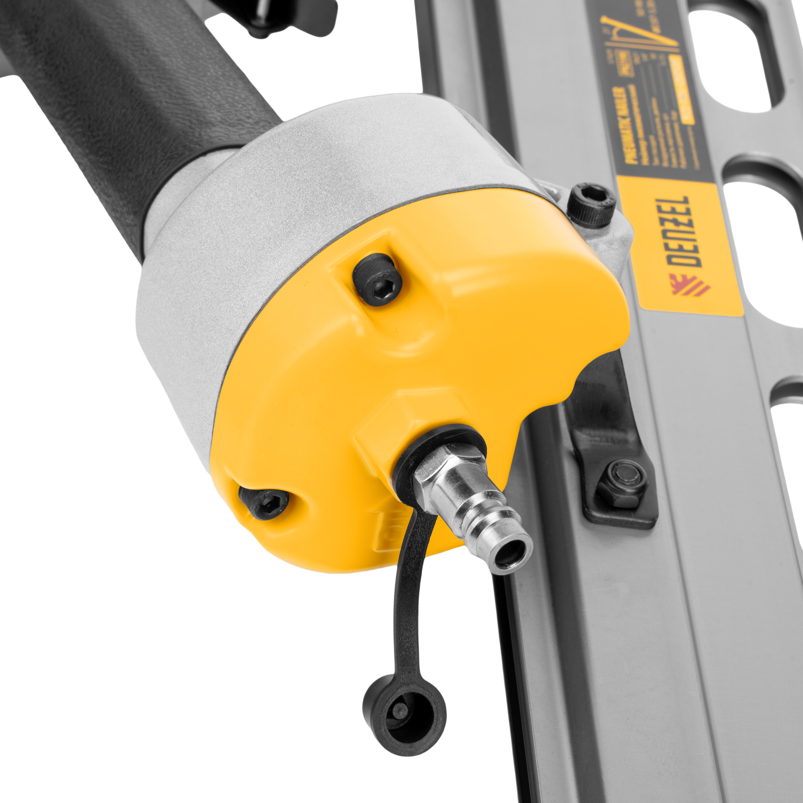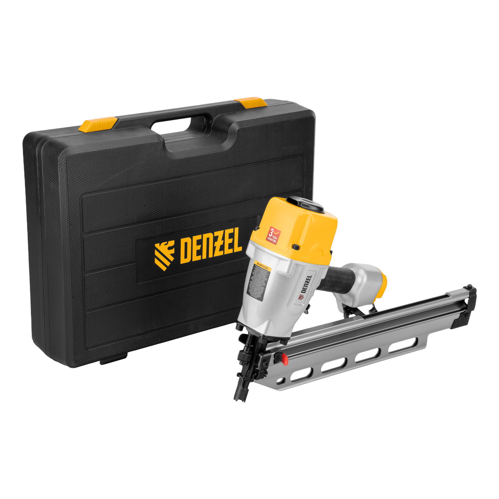 Пневматический нейлер Denzel PN2190 57429 предназначен для сборки каркасов деревянных домов, стяжки полов, а также выполнения других работ по креплению листовых материалов с помощью гвоздей SN21 длиной от 50 до 90 мм. Рабочее давление составляет 7,5 атмосфер, что обеспечивает эффективность и высокую скорость забивания крепежа. Инструмент также пригодится для сборки мебели, строительных и отделочных работ.