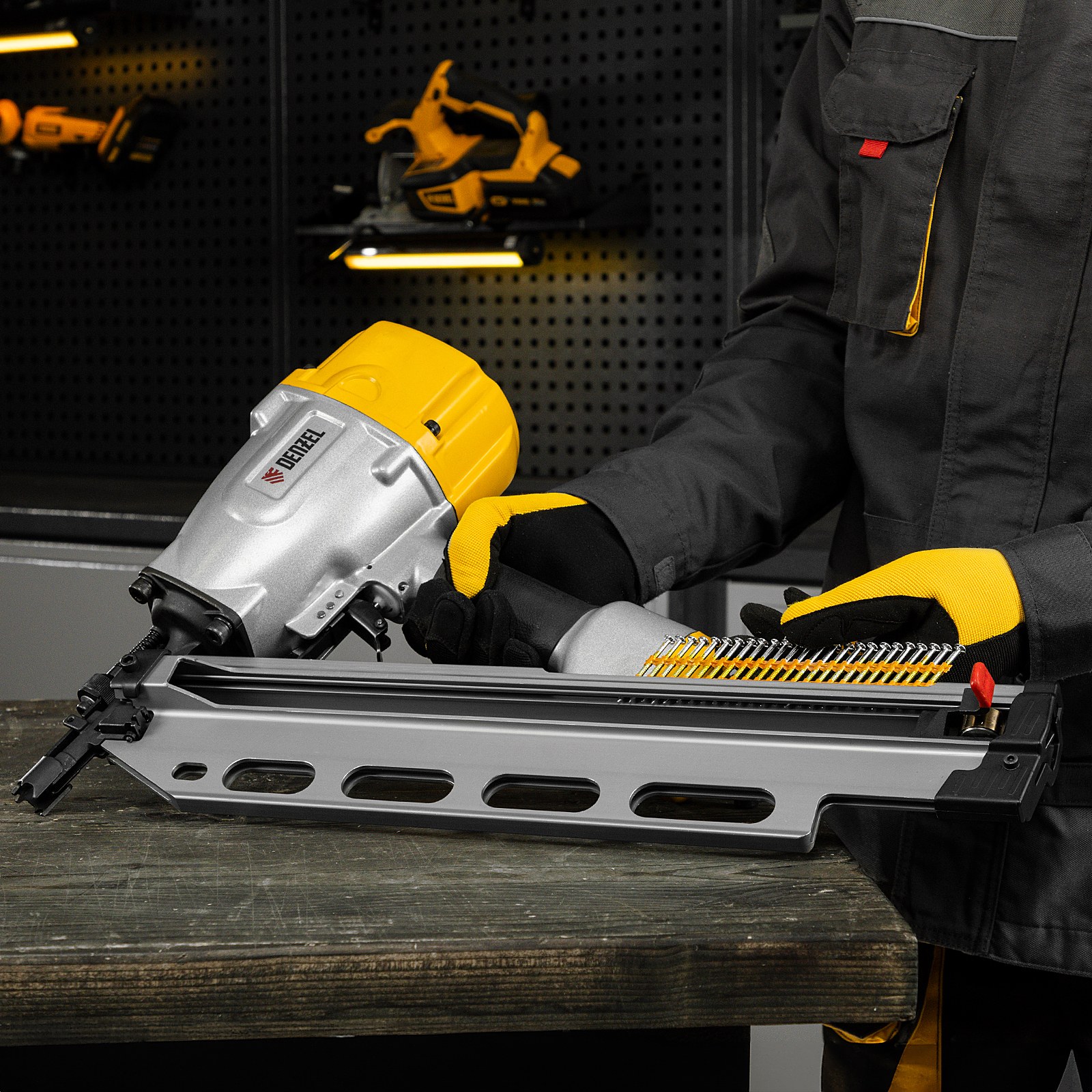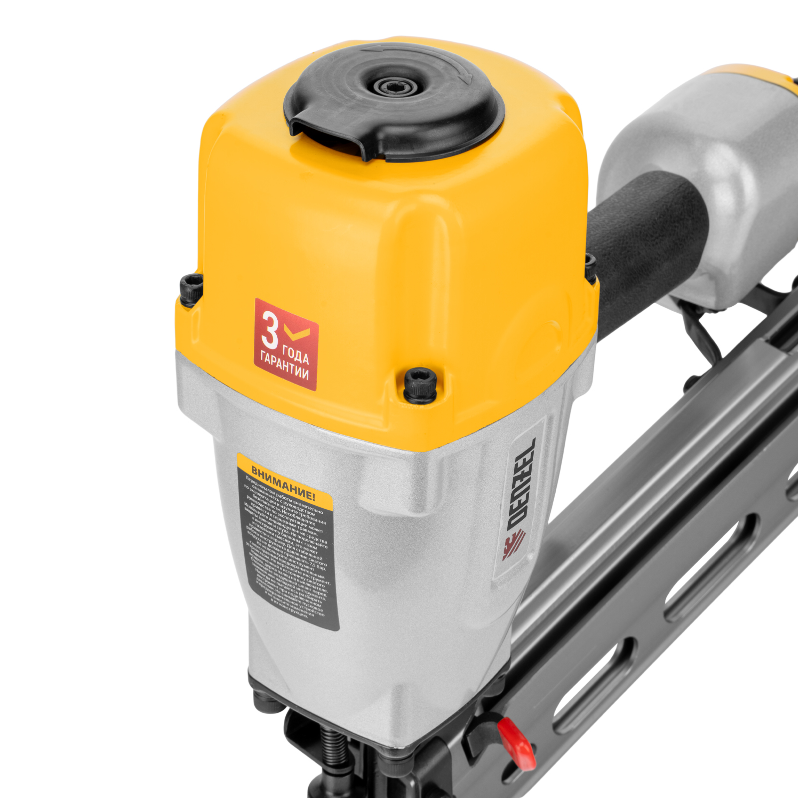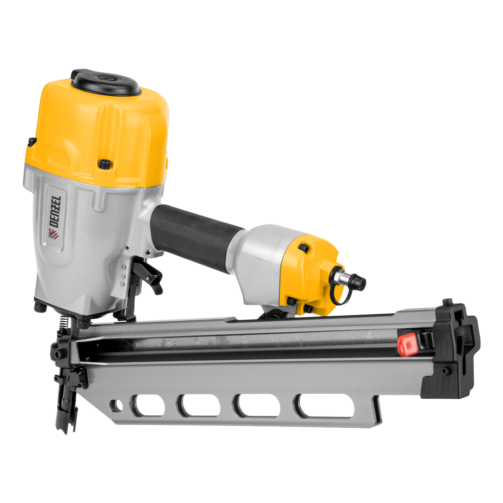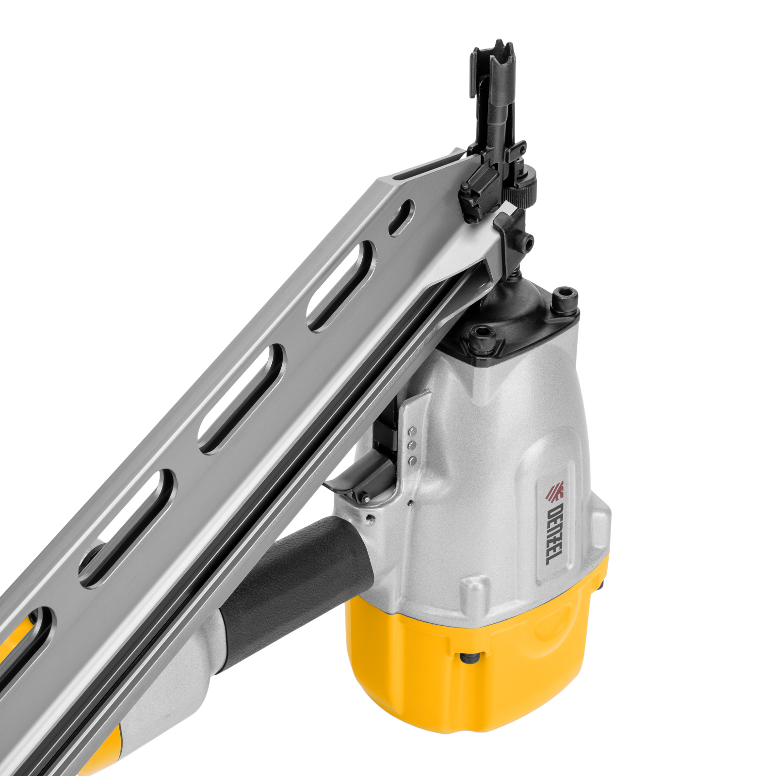 Пневматический нейлер Denzel PN2190 57429 предназначен для сборки каркасов деревянных домов, стяжки полов, а также выполнения других работ по креплению листовых материалов с помощью гвоздей SN21 длиной от 50 до 90 мм. Рабочее давление составляет 7,5 атмосфер, что обеспечивает эффективность и высокую скорость забивания крепежа. Инструмент также пригодится для сборки мебели, строительных и отделочных работ.