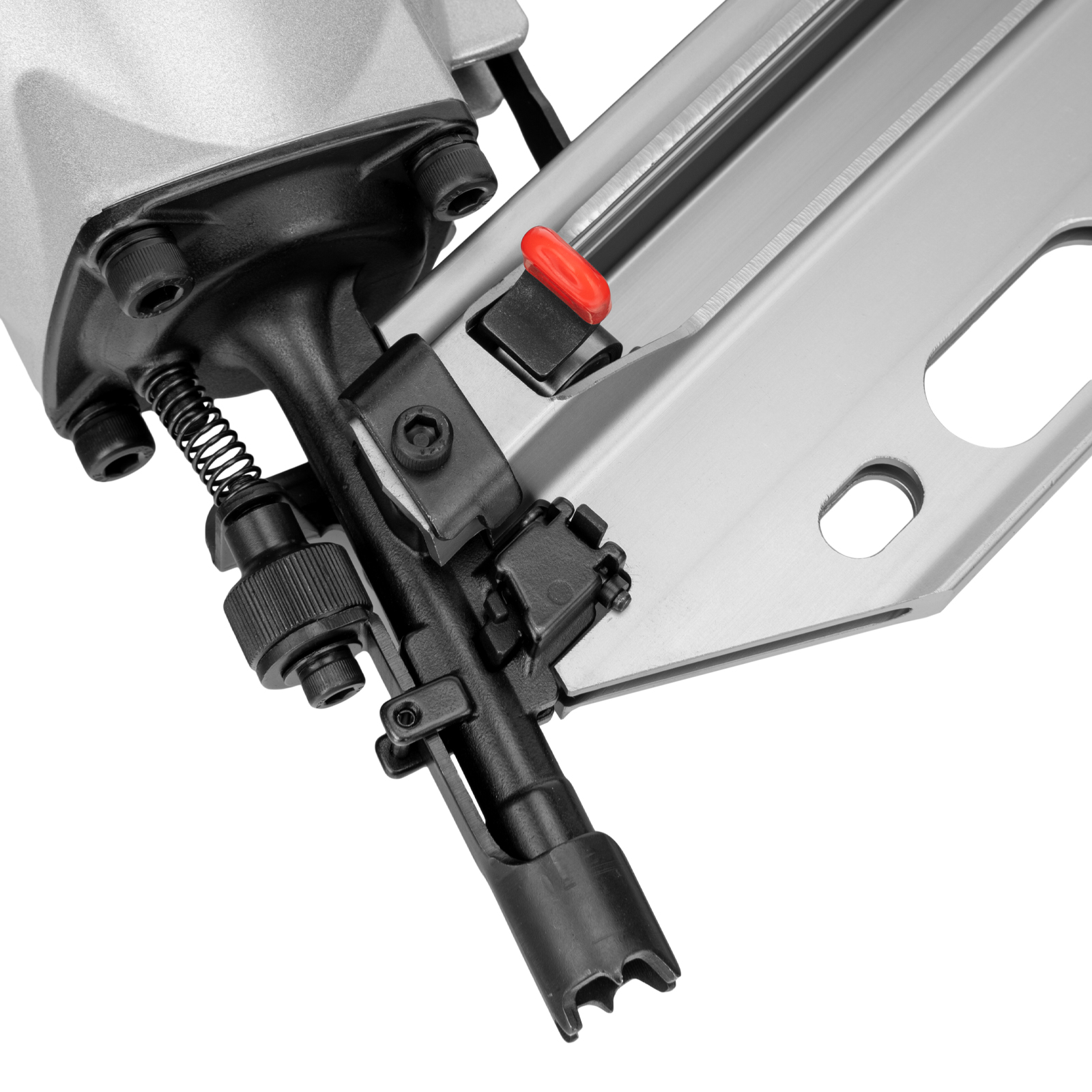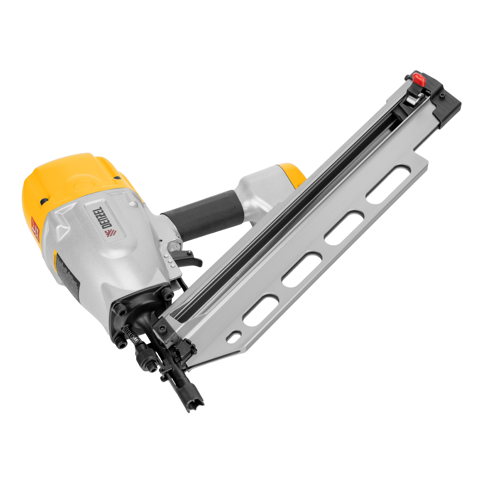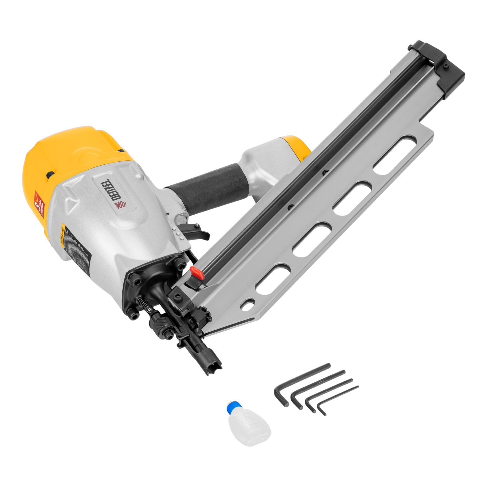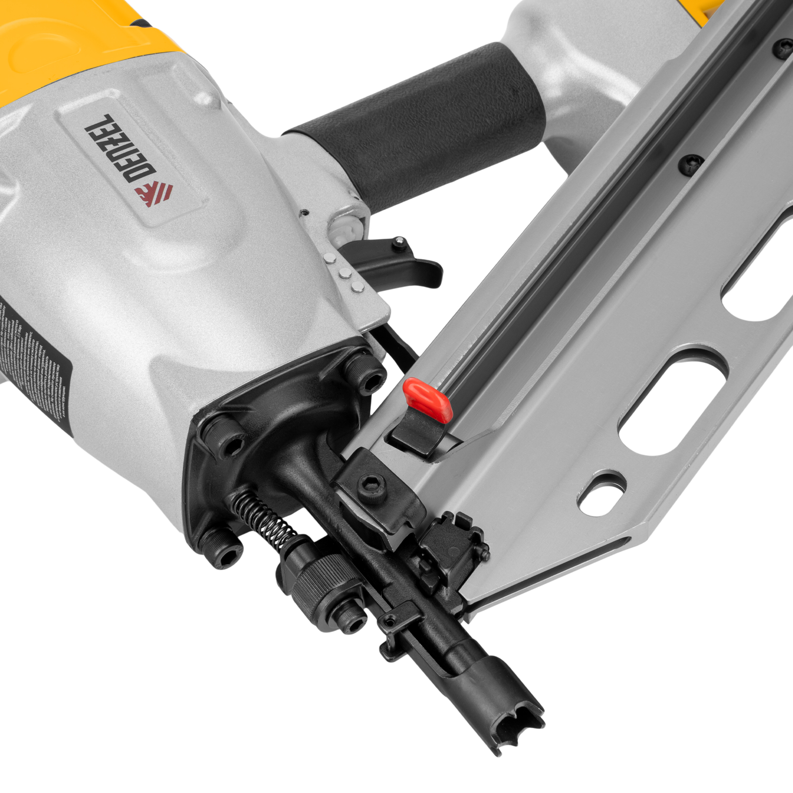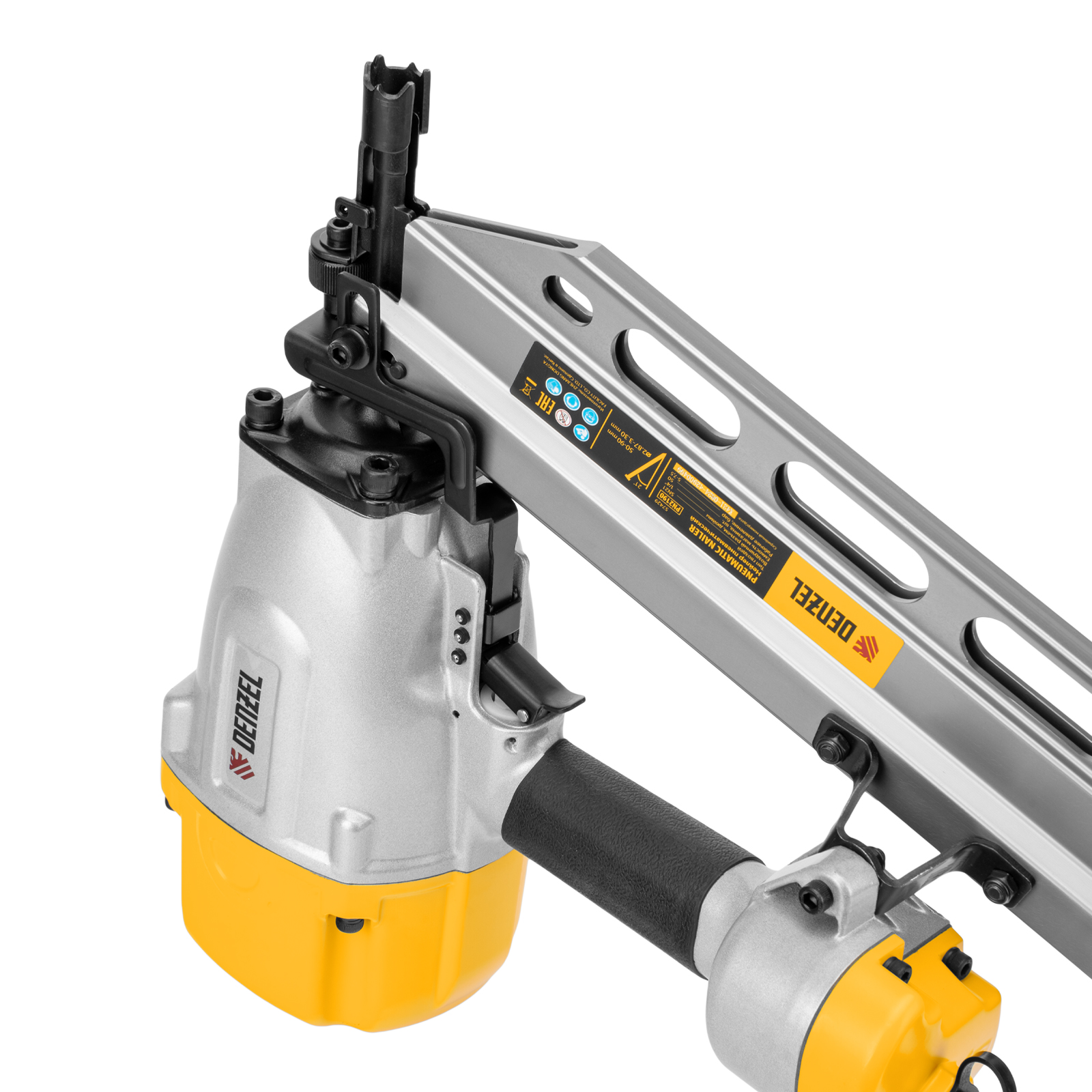 Пневматический нейлер Denzel PN2190 57429 предназначен для сборки каркасов деревянных домов, стяжки полов, а также выполнения других работ по креплению листовых материалов с помощью гвоздей SN21 длиной от 50 до 90 мм. Рабочее давление составляет 7,5 атмосфер, что обеспечивает эффективность и высокую скорость забивания крепежа. Инструмент также пригодится для сборки мебели, строительных и отделочных работ.