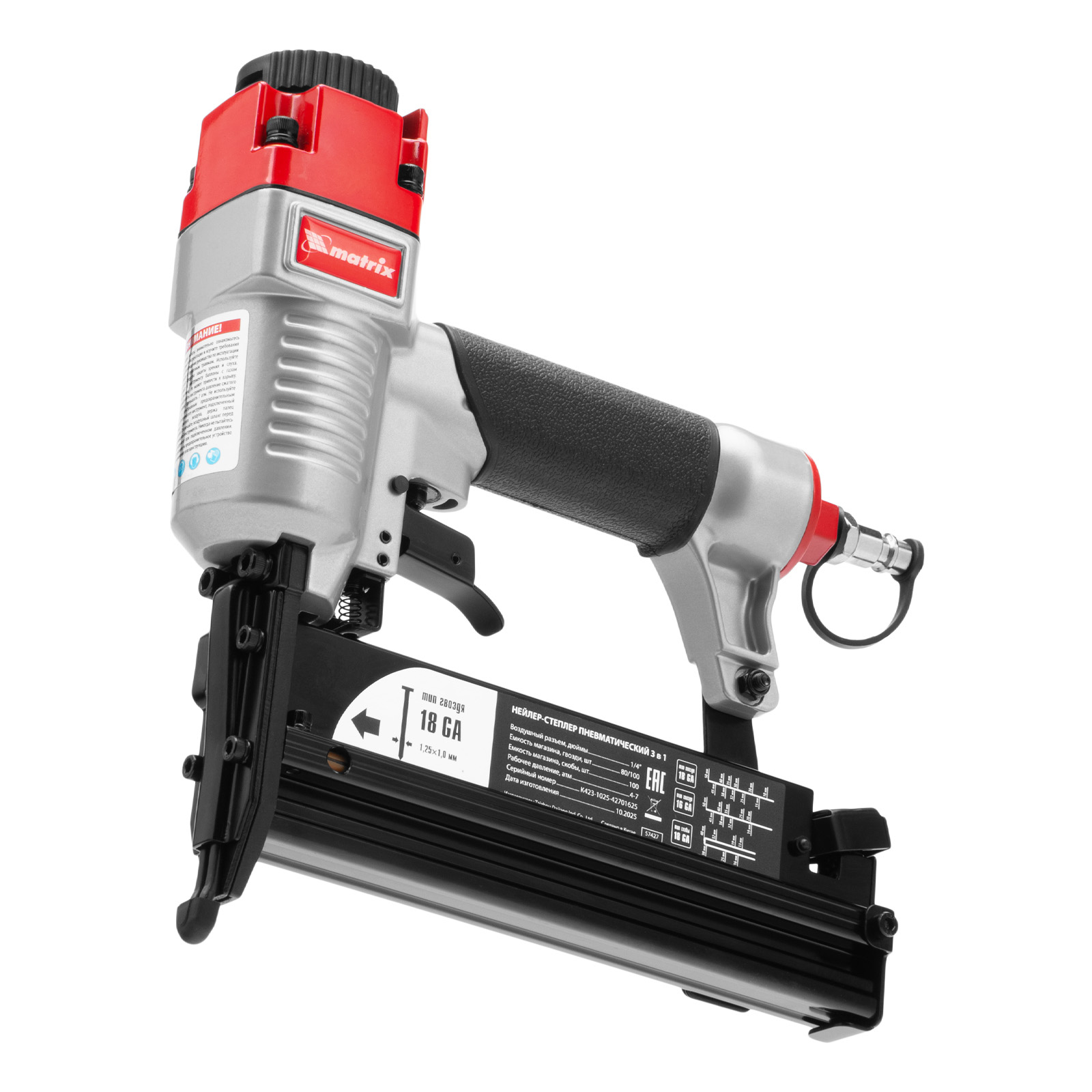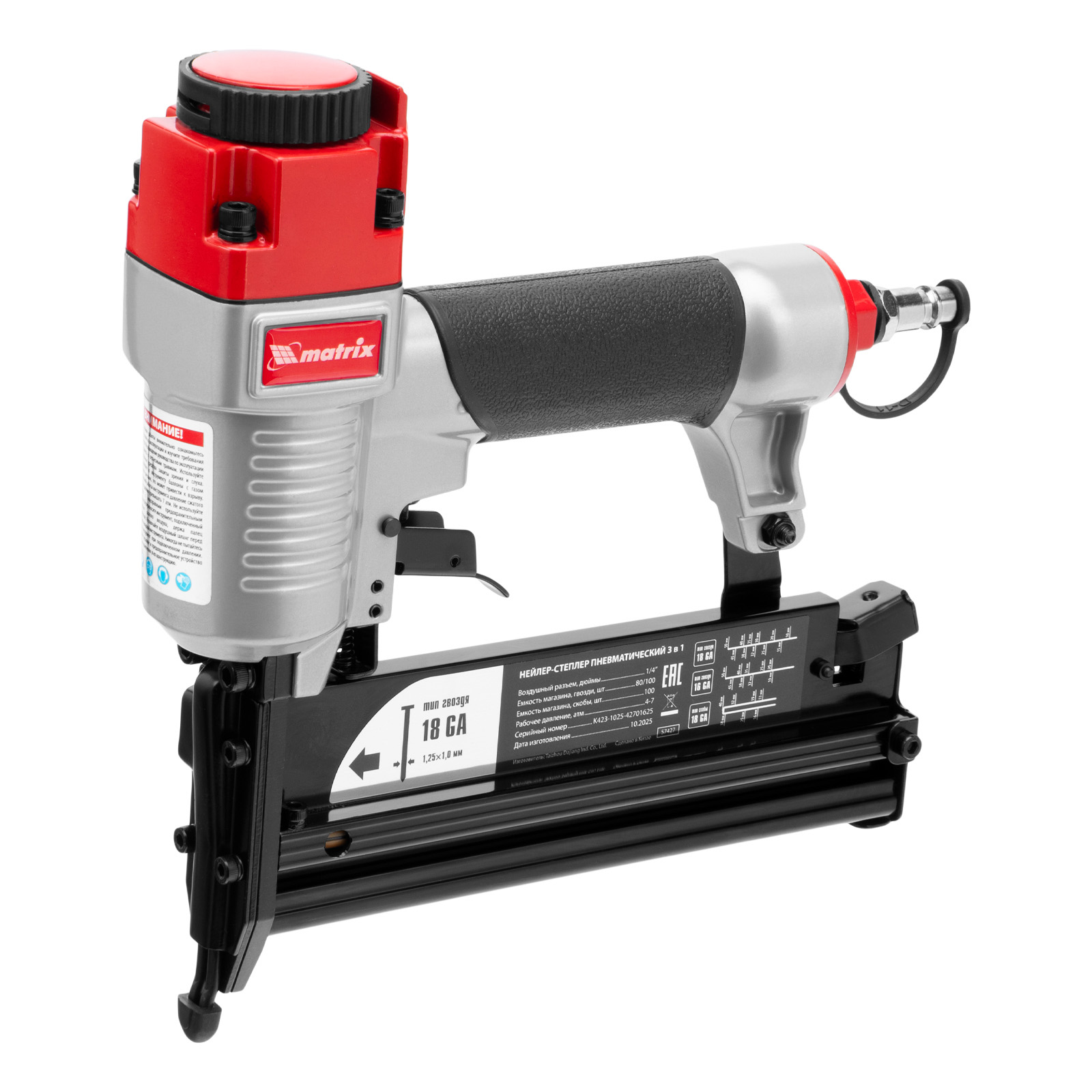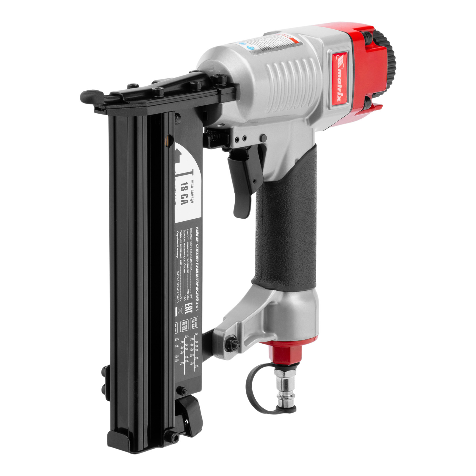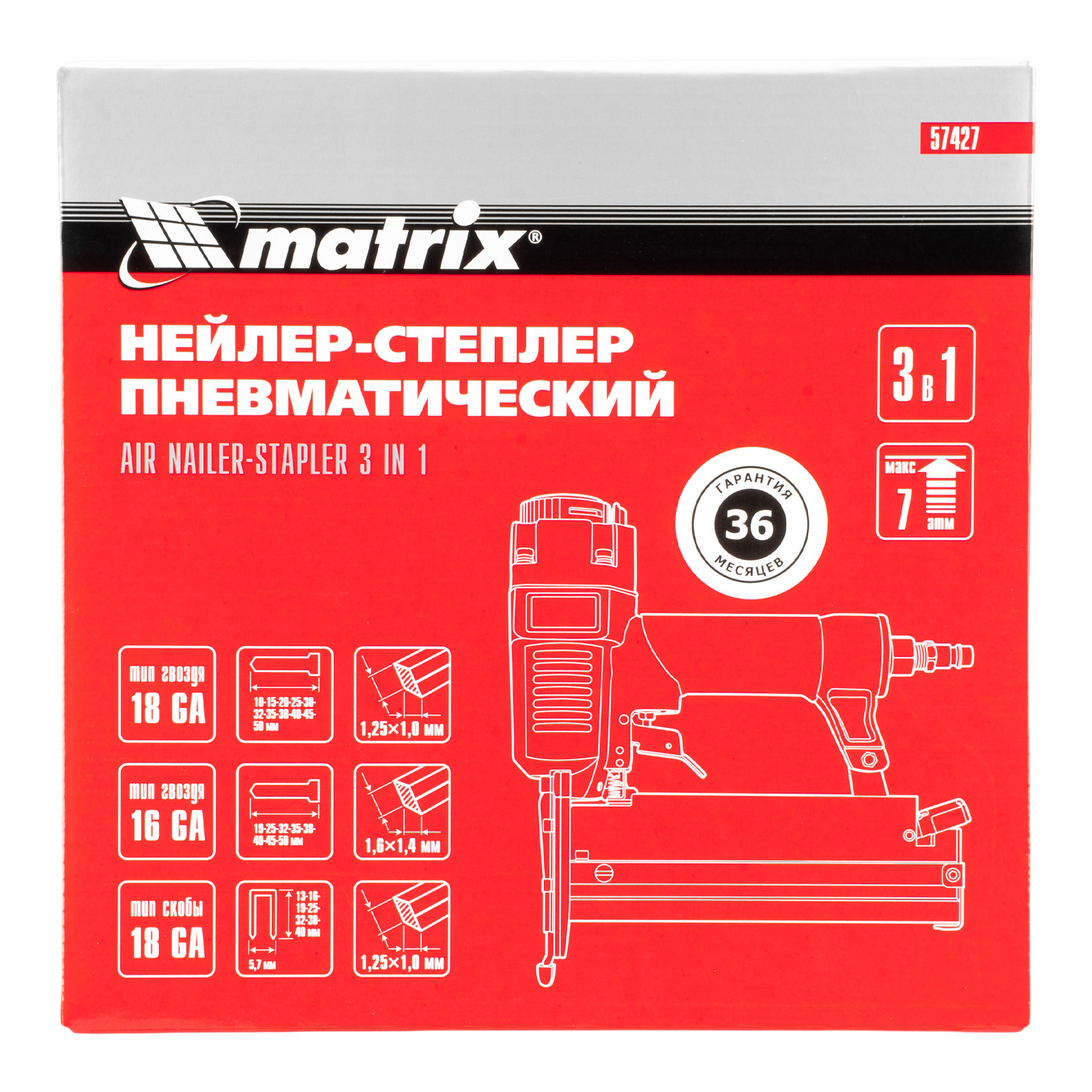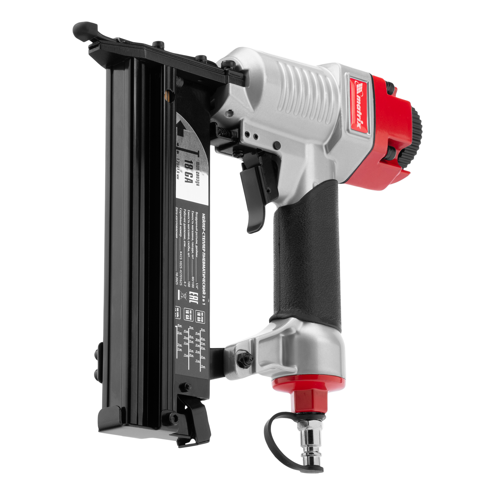 Пневматический нейлер-степлер 3 в 1 Matrix 57427 способен забивать на регулируемую глубину скобы 18 GA и гвозди 18GA и 16GA. Используется для фиксации паркетной доски, фанеры, ДВП, шифера, гипсокартона, ткани и бумаги. Пригодится во время ремонта, а также для сборки мебели и отделочных работ. Расход воздуха составляет 107 л/мин, поэтому нейлер-степлер можно подключать к любому типу компрессоров.