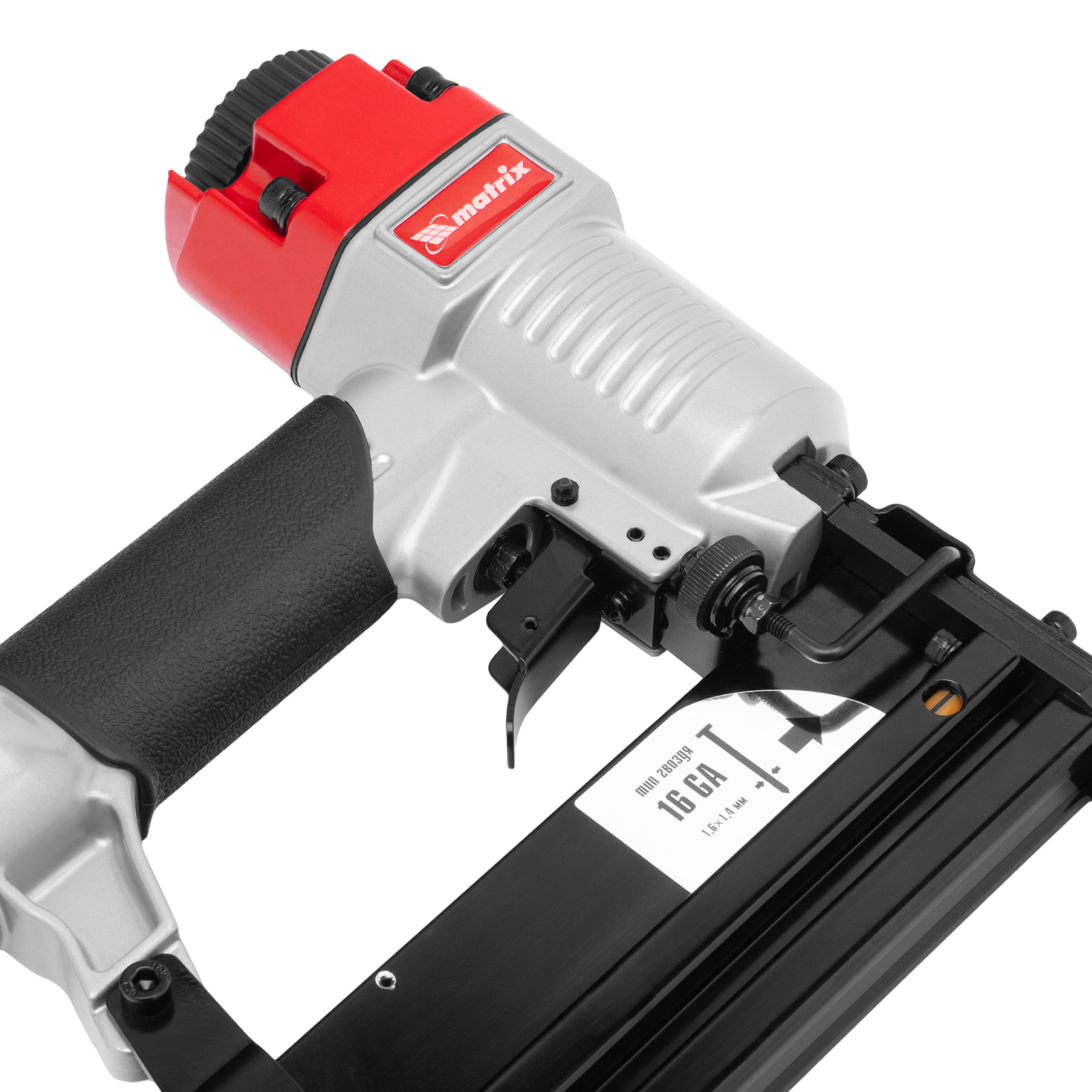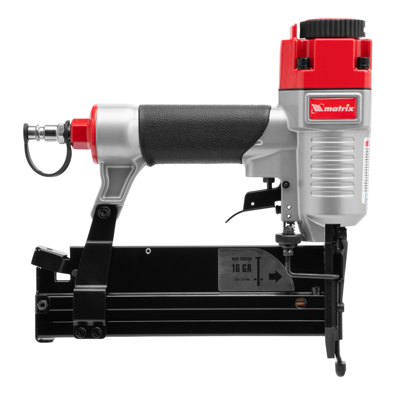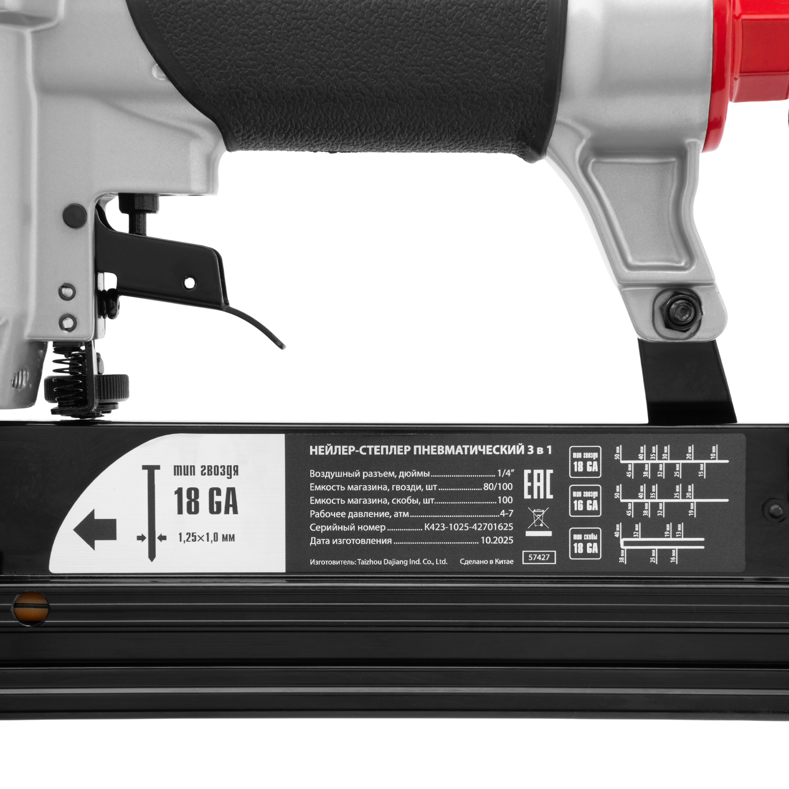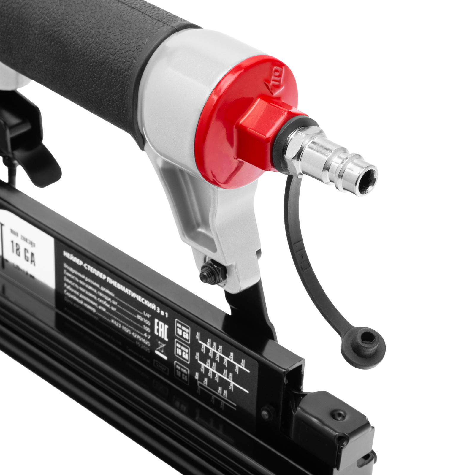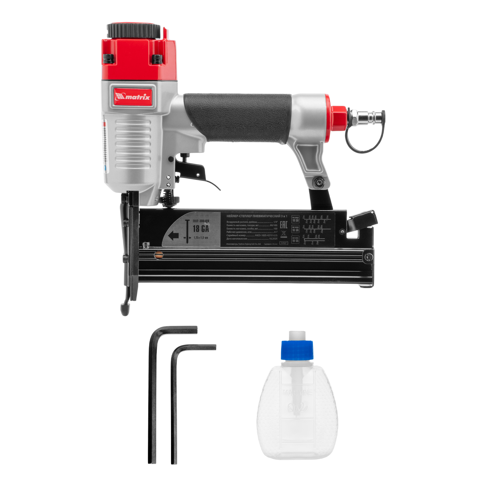 Пневматический нейлер-степлер 3 в 1 Matrix 57427 способен забивать на регулируемую глубину скобы 18 GA и гвозди 18GA и 16GA. Используется для фиксации паркетной доски, фанеры, ДВП, шифера, гипсокартона, ткани и бумаги. Пригодится во время ремонта, а также для сборки мебели и отделочных работ. Расход воздуха составляет 107 л/мин, поэтому нейлер-степлер можно подключать к любому типу компрессоров.
