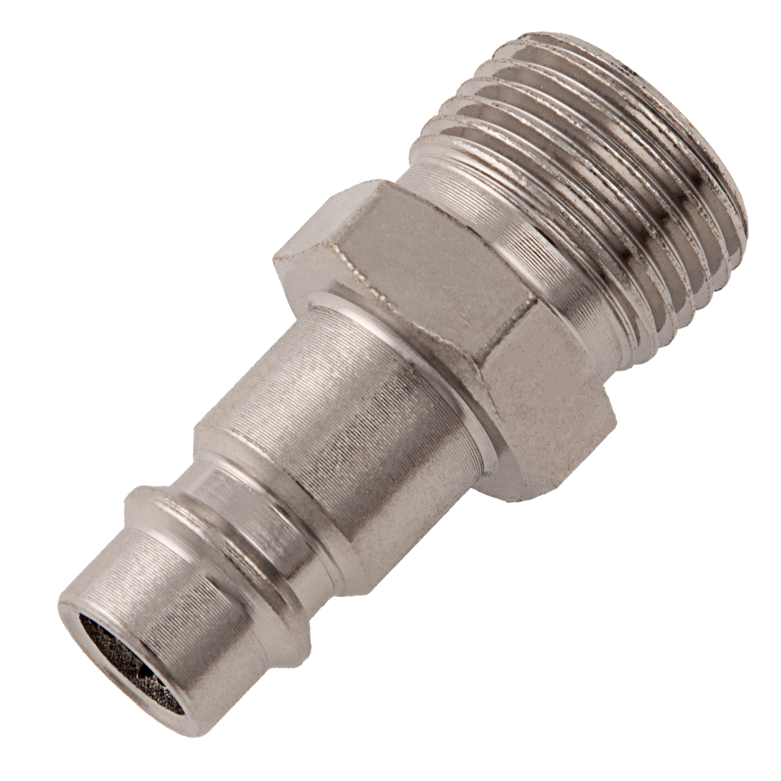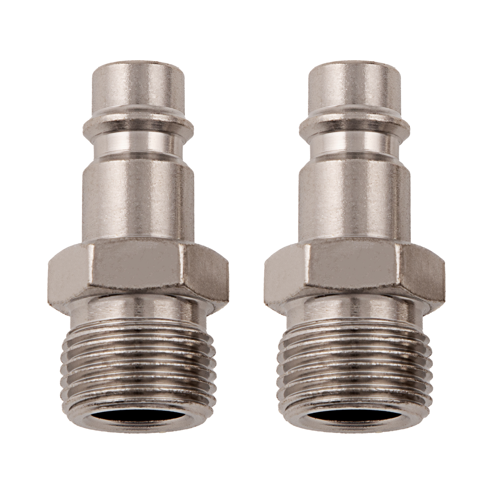 Универсальный быстросъемный ниппель Stels 57059, 2 шт. в упаковке, предназначен для перехода с внешней резьбы 3/8 дюйма на рапид типа «папа» для соединения пневматического шланга и компрессора. Используется для работы с пневмоинструментом, будет полезен на строительной площадке, в гараже и автосервисе.