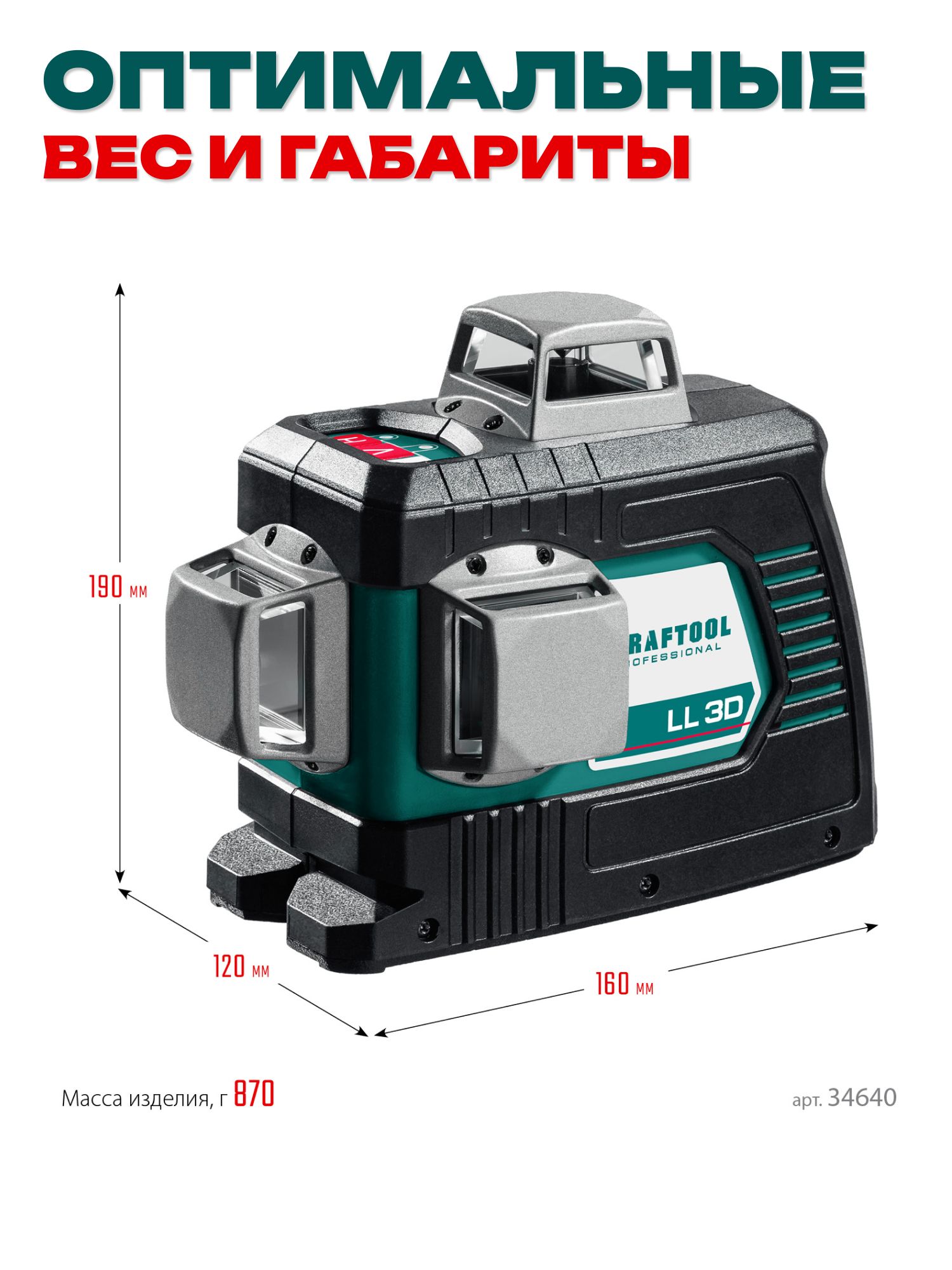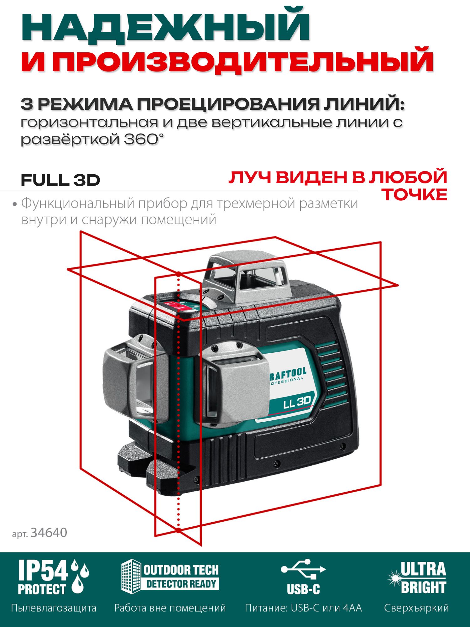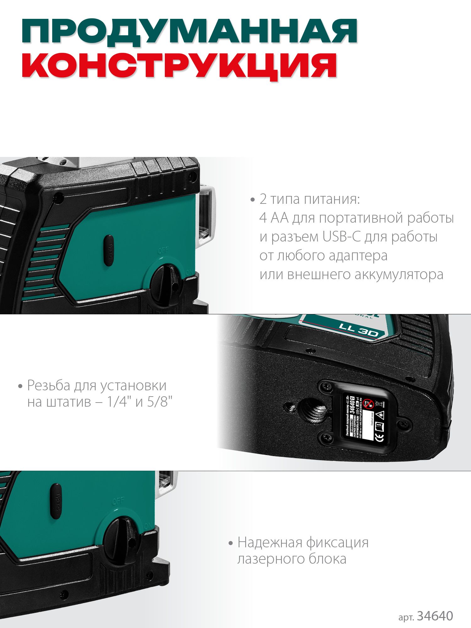 - 3 режима проецирования линий: горизонтальная и две вертикальные линии с развёрткой 360°, благодаря чему луч будет виден в любой точке.