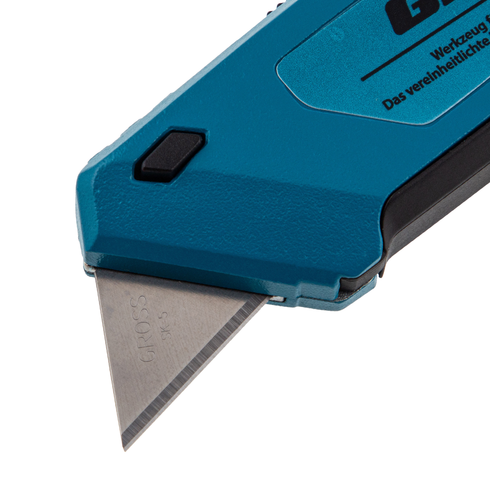 Нож Gross 78899 из стали SK-5, длиной 130 мм, с алюминиевым корпусом, выдвижным трапециевидным лезвием шириной 18 мм, клипсой для ремня и 4 лезвиями, — профессиональный инструмент для разрезания картона, линолеума, обоев, кожи и других мягких материалов. Благодаря алюминиевому корпусу он отличается повышенной прочностью и коррозионной стойкостью, выдерживает длительное и частое использование. Нож будет полезен при проведении ремонтных и отделочных работ, подойдет и для бытового использования.