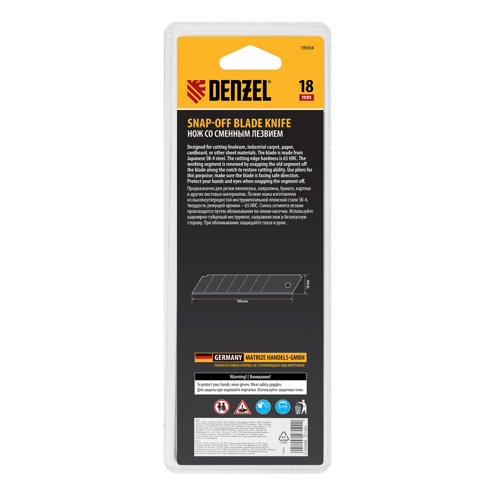 Нож Denzel 78904 выполнен в корпусе из цинкового сплава с вставкой из термопластичной резины TPR, оснащен сменным лезвием шириной 18 мм, изготовленным из стали SK4 по технологии UltraSharp, и торцевым зажимом. Сверхострое выдвижное лезвие легко режет линолеум, ковролин, бумагу, обои, картон и другие листовые материалы. Нож будет полезен для проведения профессиональных ремонтных и отделочных работ, пригодится также в домашнем хозяйстве.