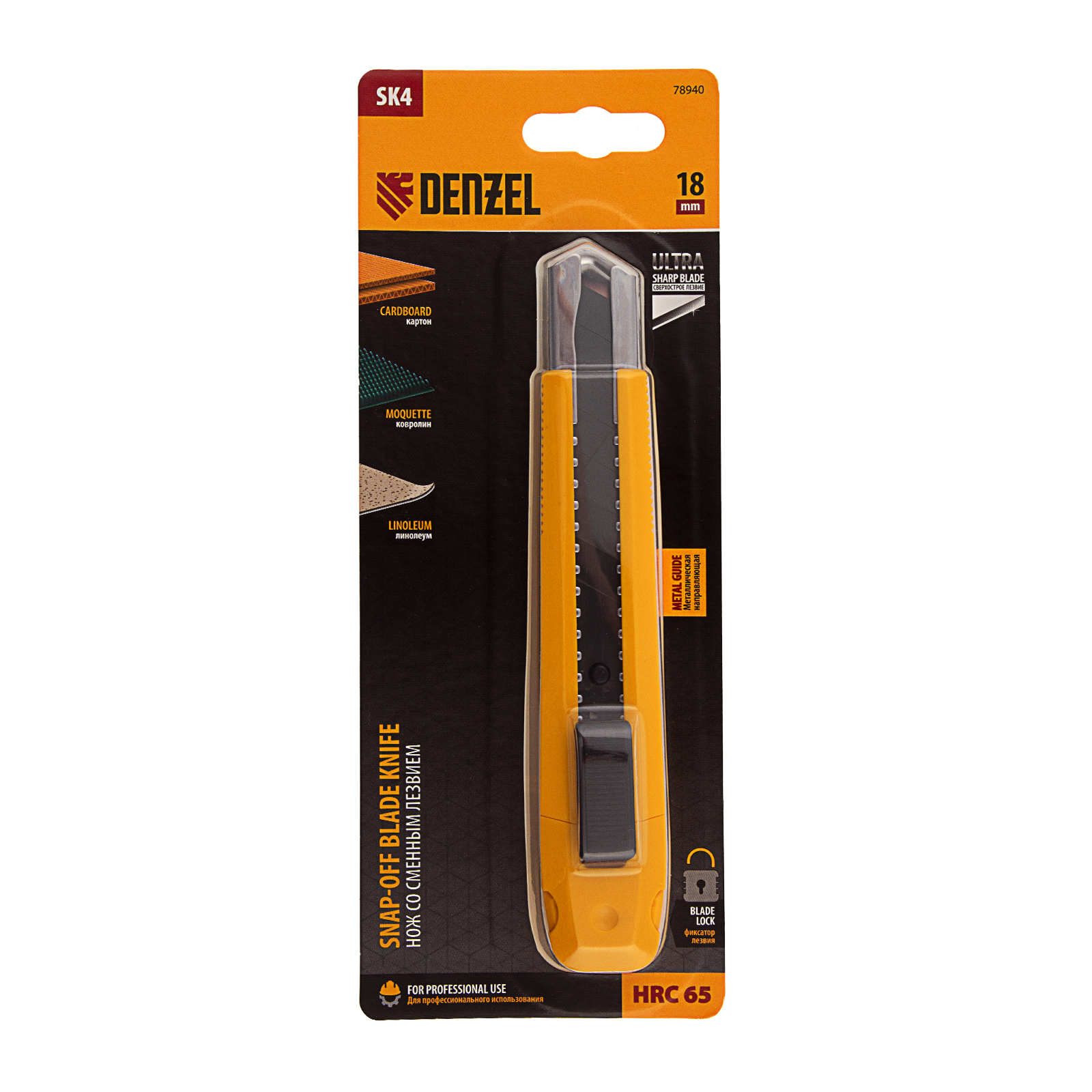 Нож Denzel 78940 со сменным лезвием шириной 18 мм, изготовленным из стали SK4, оснащен нажимным фиксатором, металлической направляющей и клипсой-держателем. Сверхострое выдвижное лезвие легко режет линолеум, ковролин, бумагу, обои, картон и другие листовые материалы. Нож рекомендован для профессионального применения, пригодится также в домашнем хозяйстве.