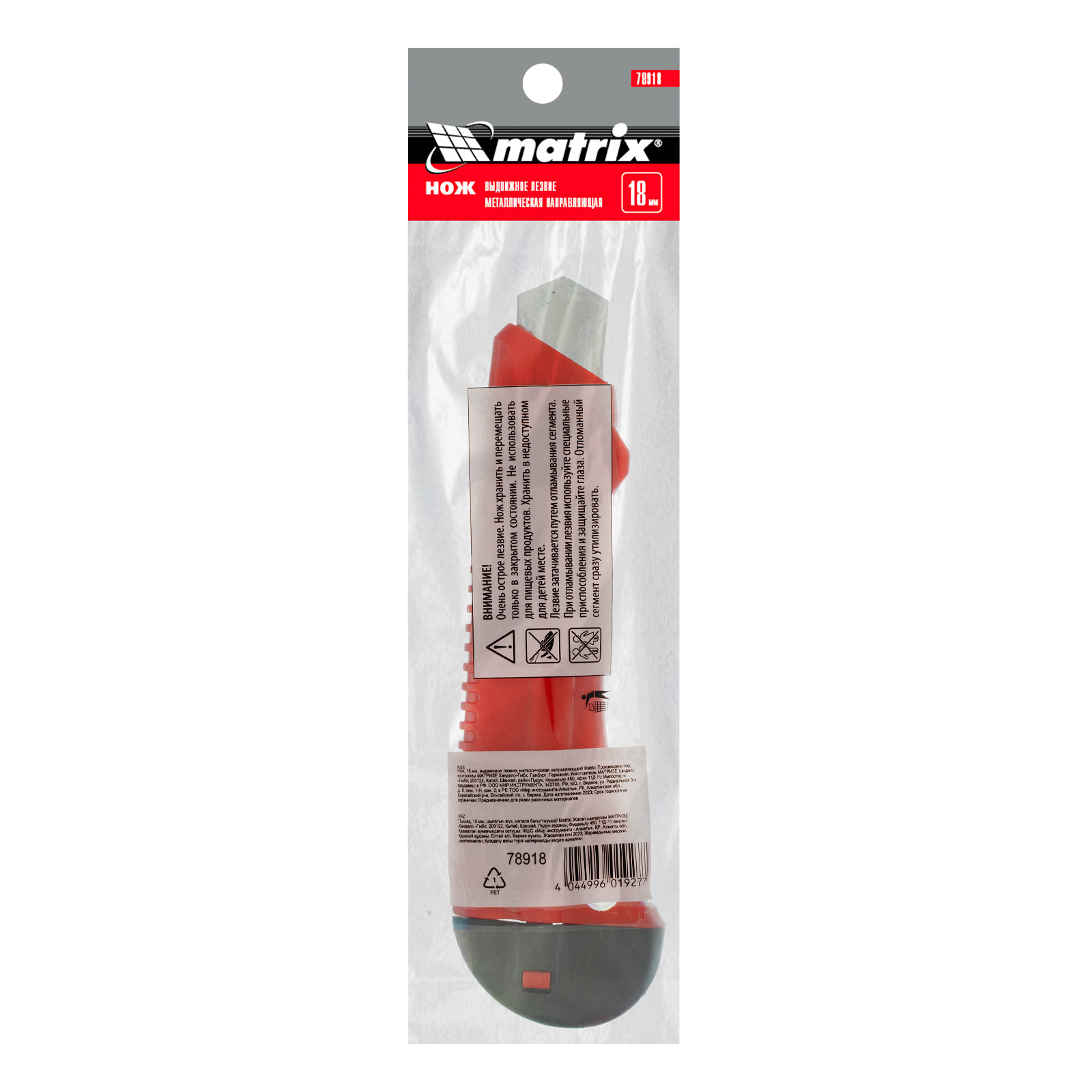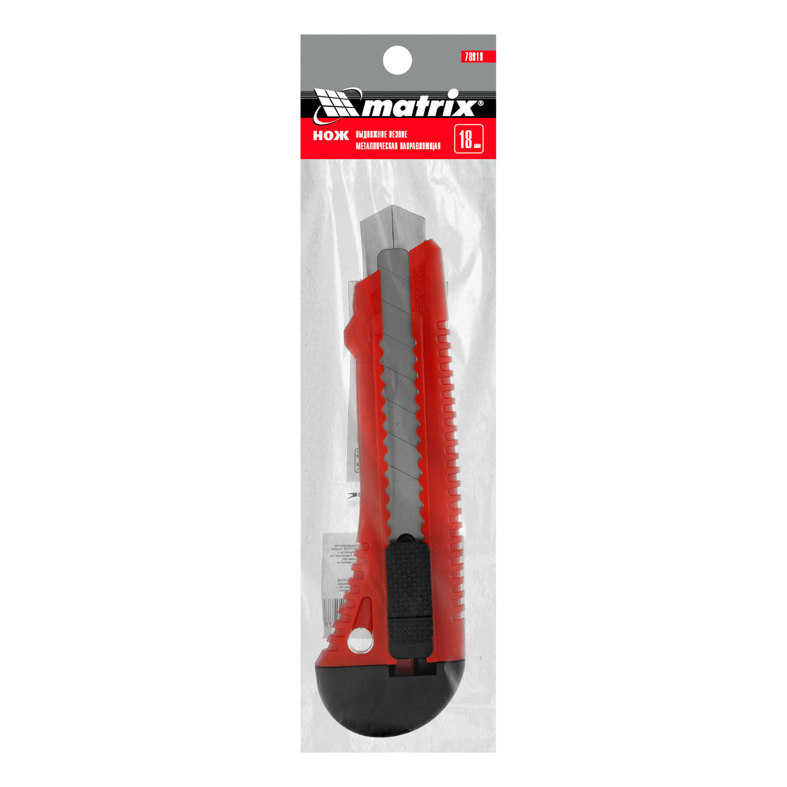 Нож Matrix 78918 с выдвижным лезвием шириной 18 мм и металлической направляющей используется для резки мягких материалов: картона, бумаги, пленки, обоев, линолеума, кожи. Лезвие выдвигается на нужную длину и фиксируется, а металлическая направляющая не дает ему перекоситься. Нож подходит как для домашнего применения, так и для профессиональных работ.