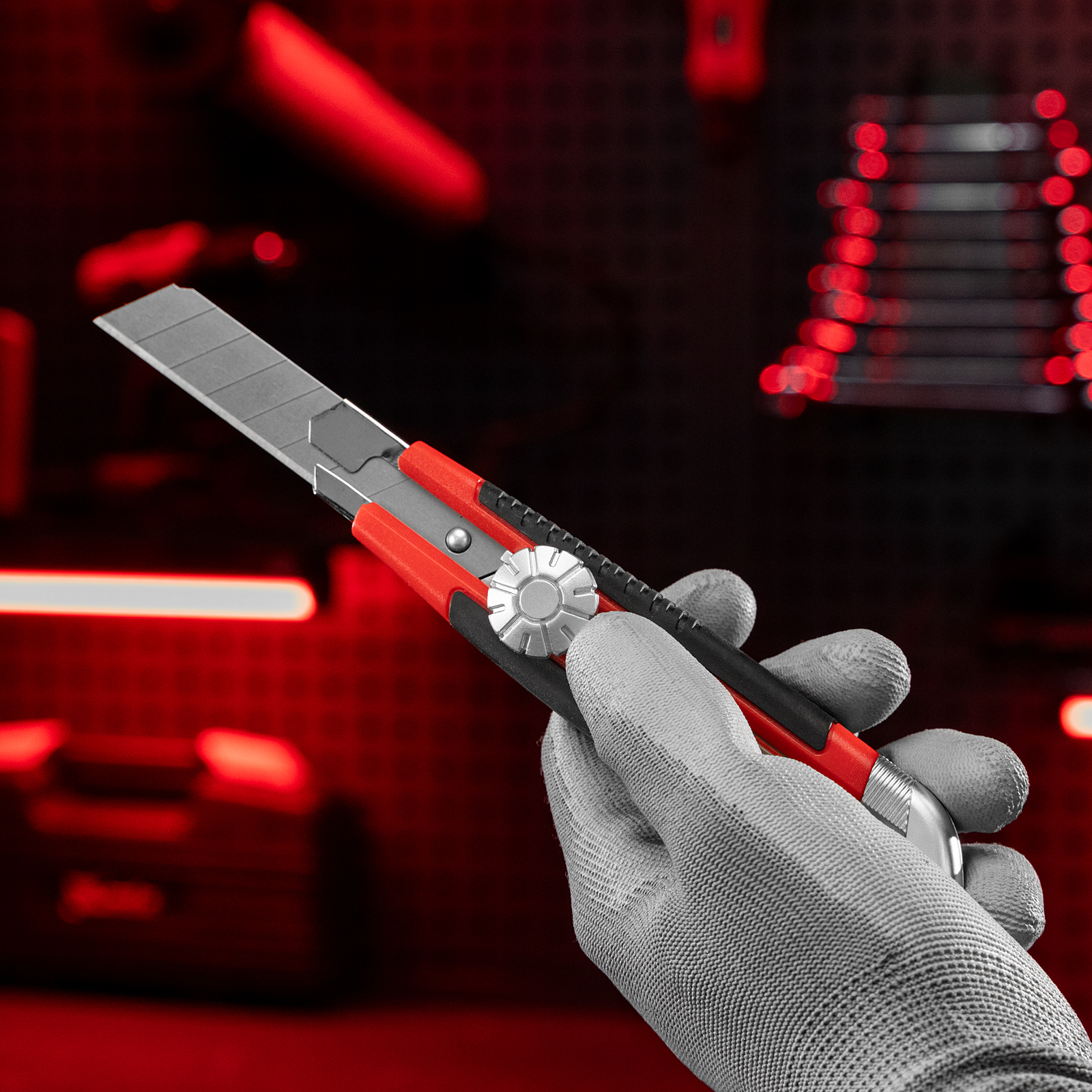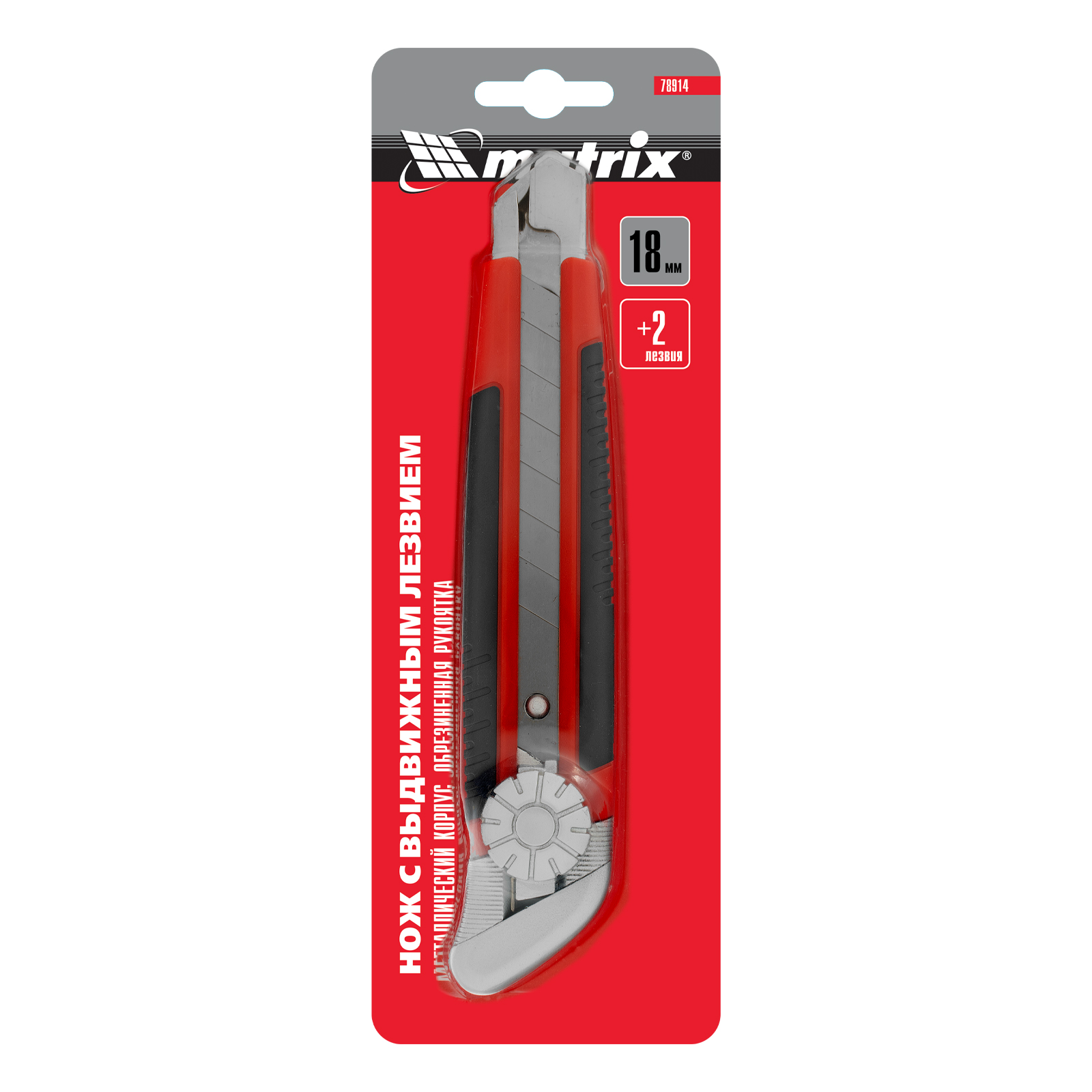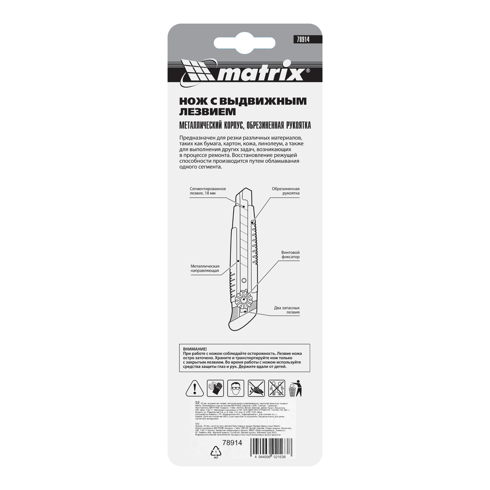 Нож Matrix 78914 с выдвижным лезвием шириной 18 мм, винтовым фиксатором и металлической направляющей используется в ходе ремонта и отделки помещений, будет полезен на складе, в офисе, в кожевенной мастерской, а также в быту. Легко режет бумагу, картон, линолеум, кожу, обои. Подходит для интенсивного использования, поскольку его конструкция усилена металлической направляющей.