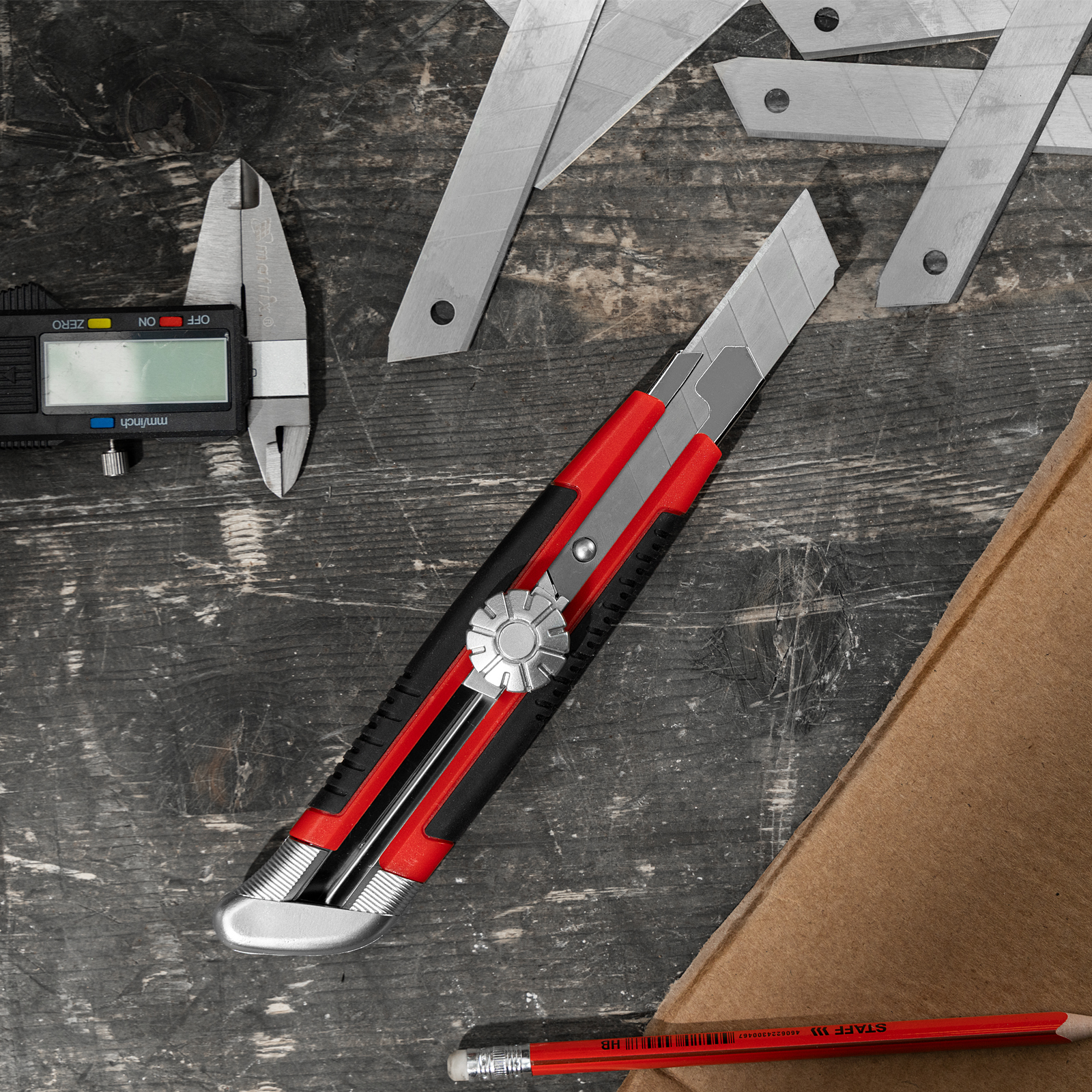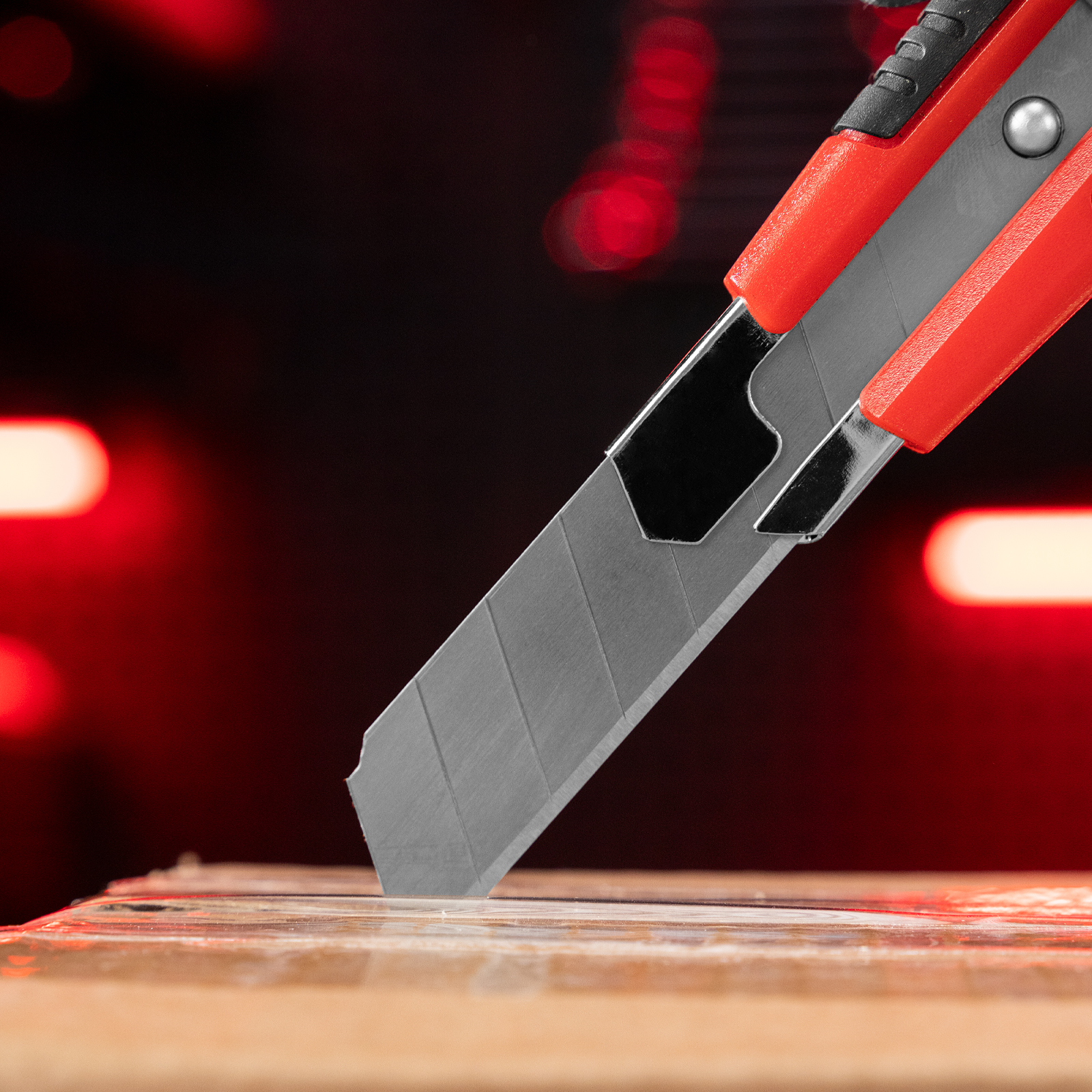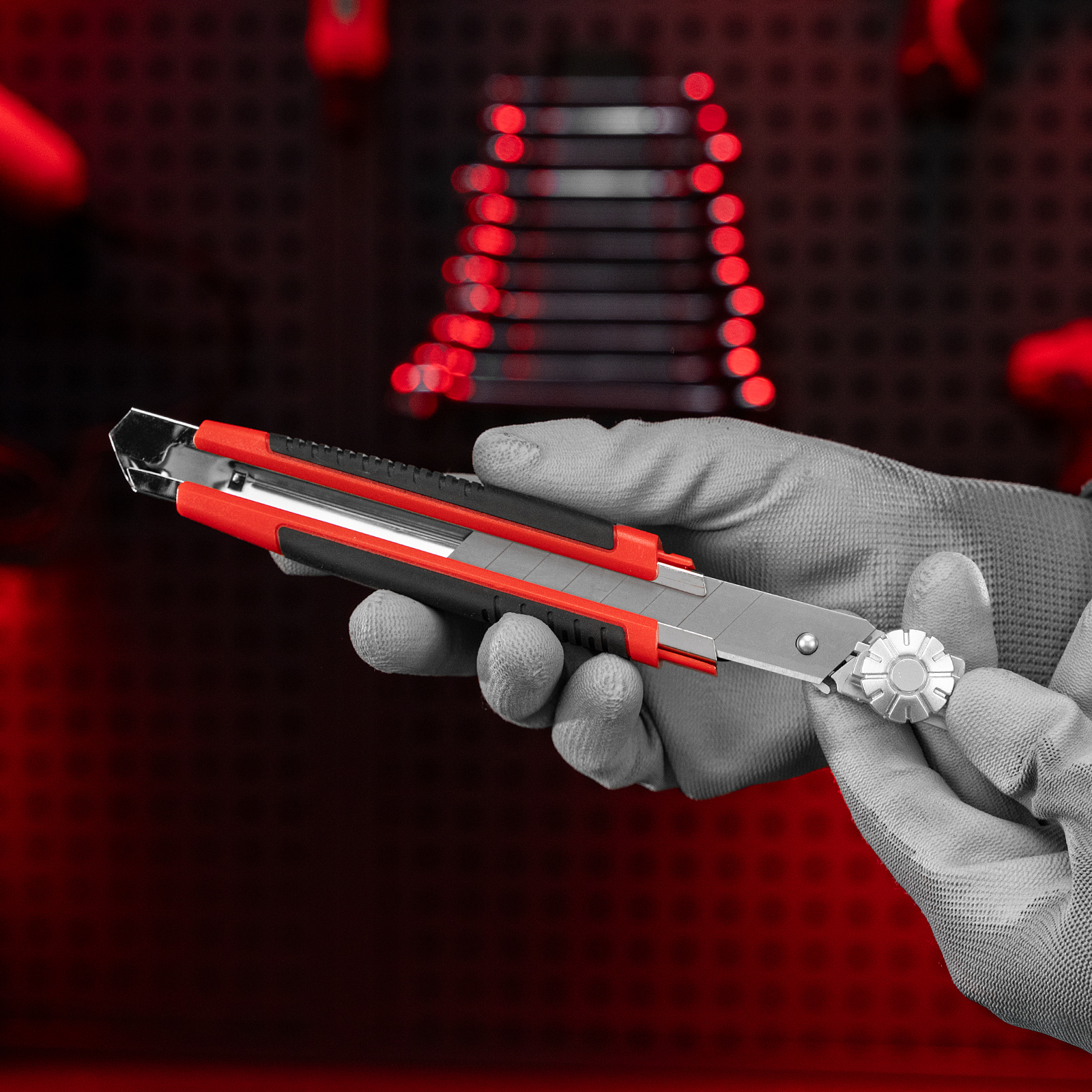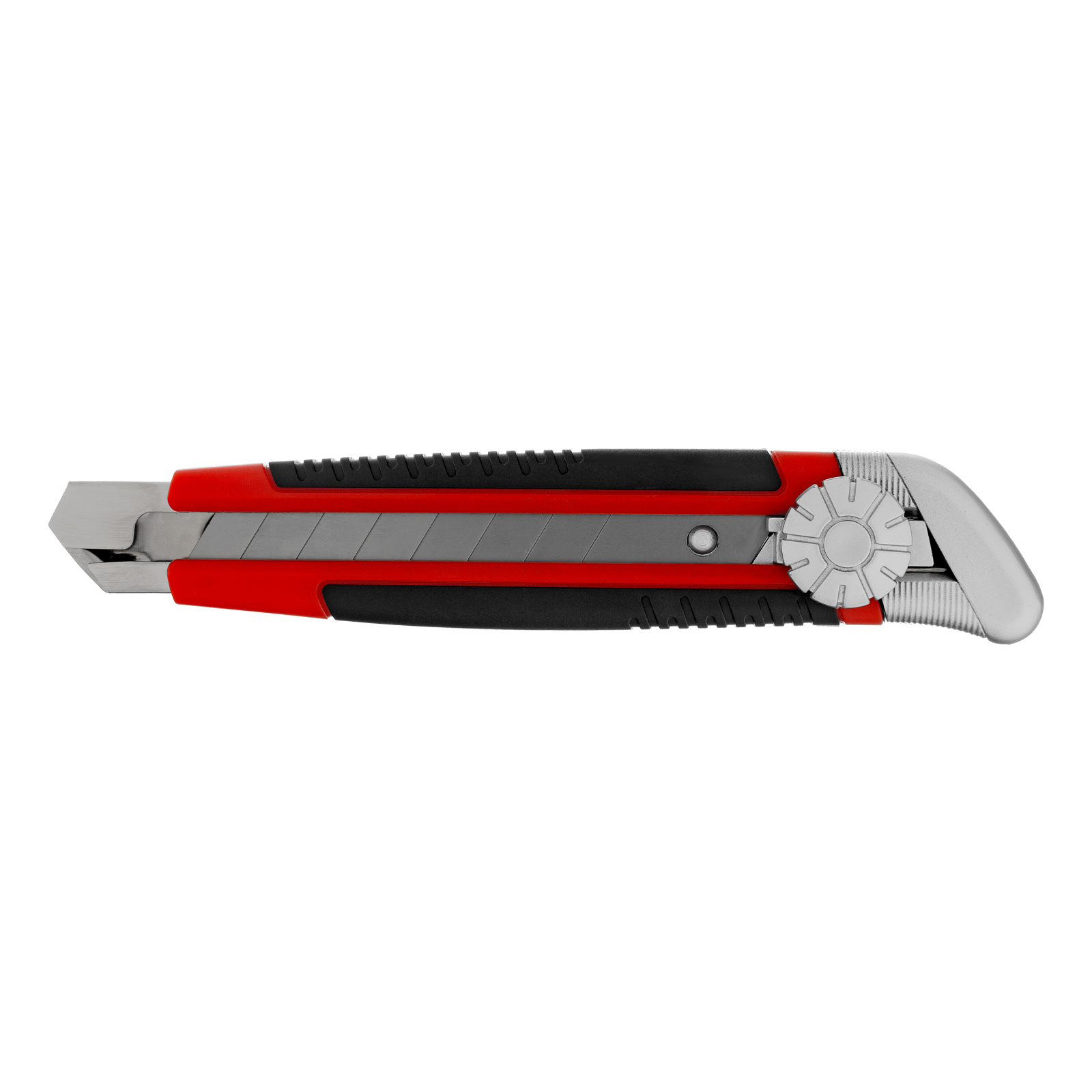Нож Matrix 78914 с выдвижным лезвием шириной 18 мм, винтовым фиксатором и металлической направляющей используется в ходе ремонта и отделки помещений, будет полезен на складе, в офисе, в кожевенной мастерской, а также в быту. Легко режет бумагу, картон, линолеум, кожу, обои. Подходит для интенсивного использования, поскольку его конструкция усилена металлической направляющей.