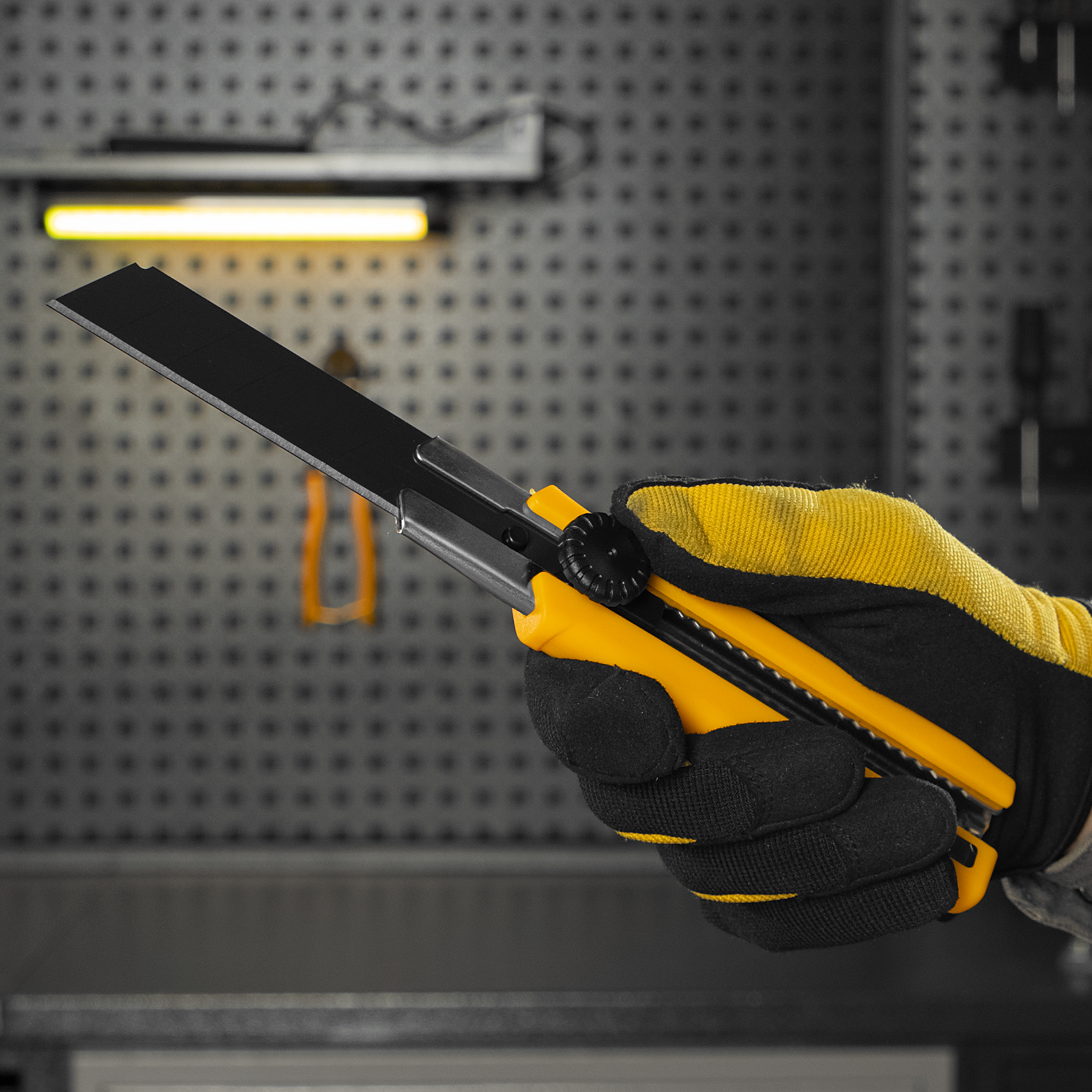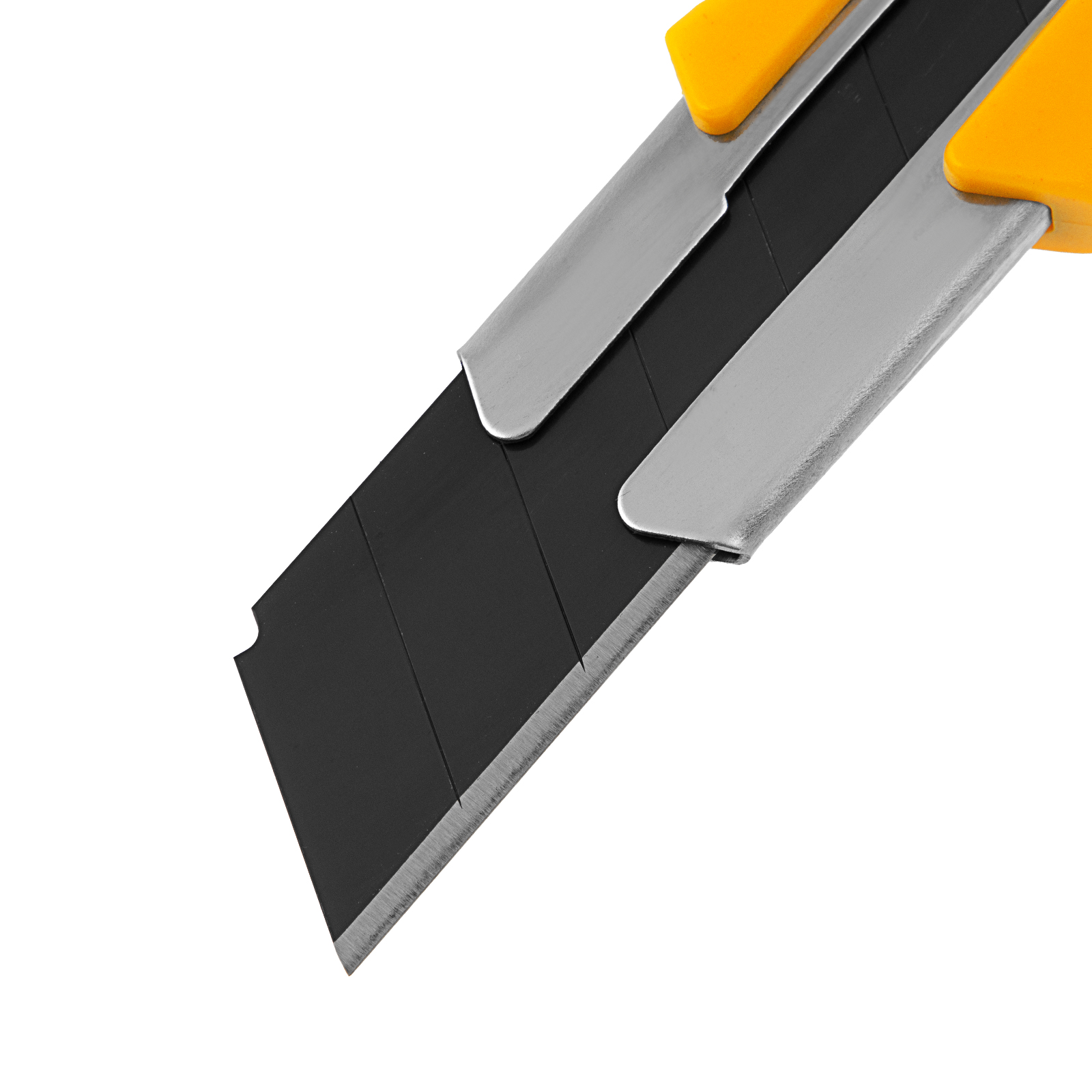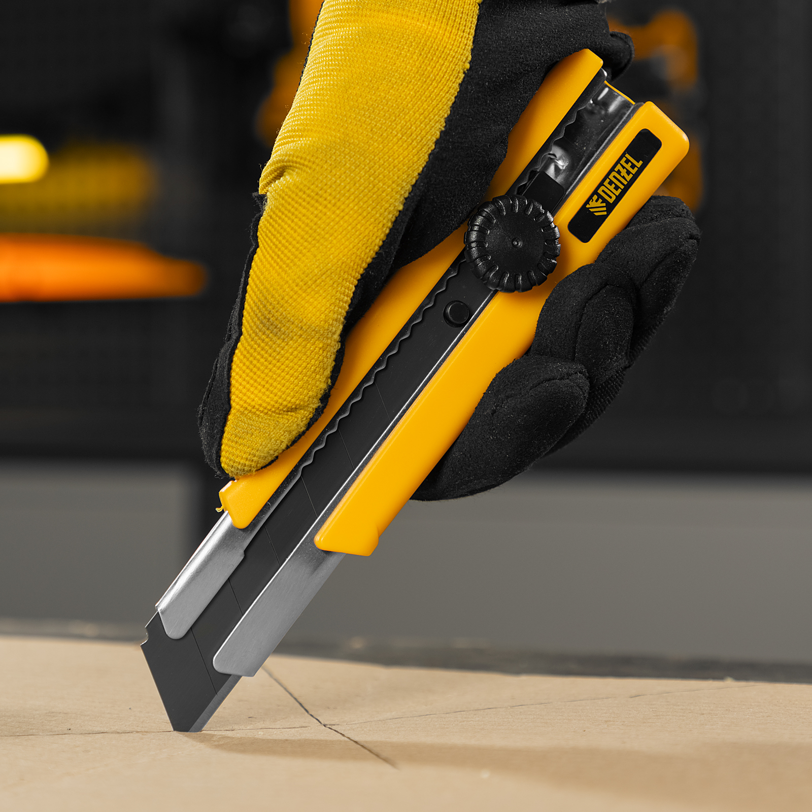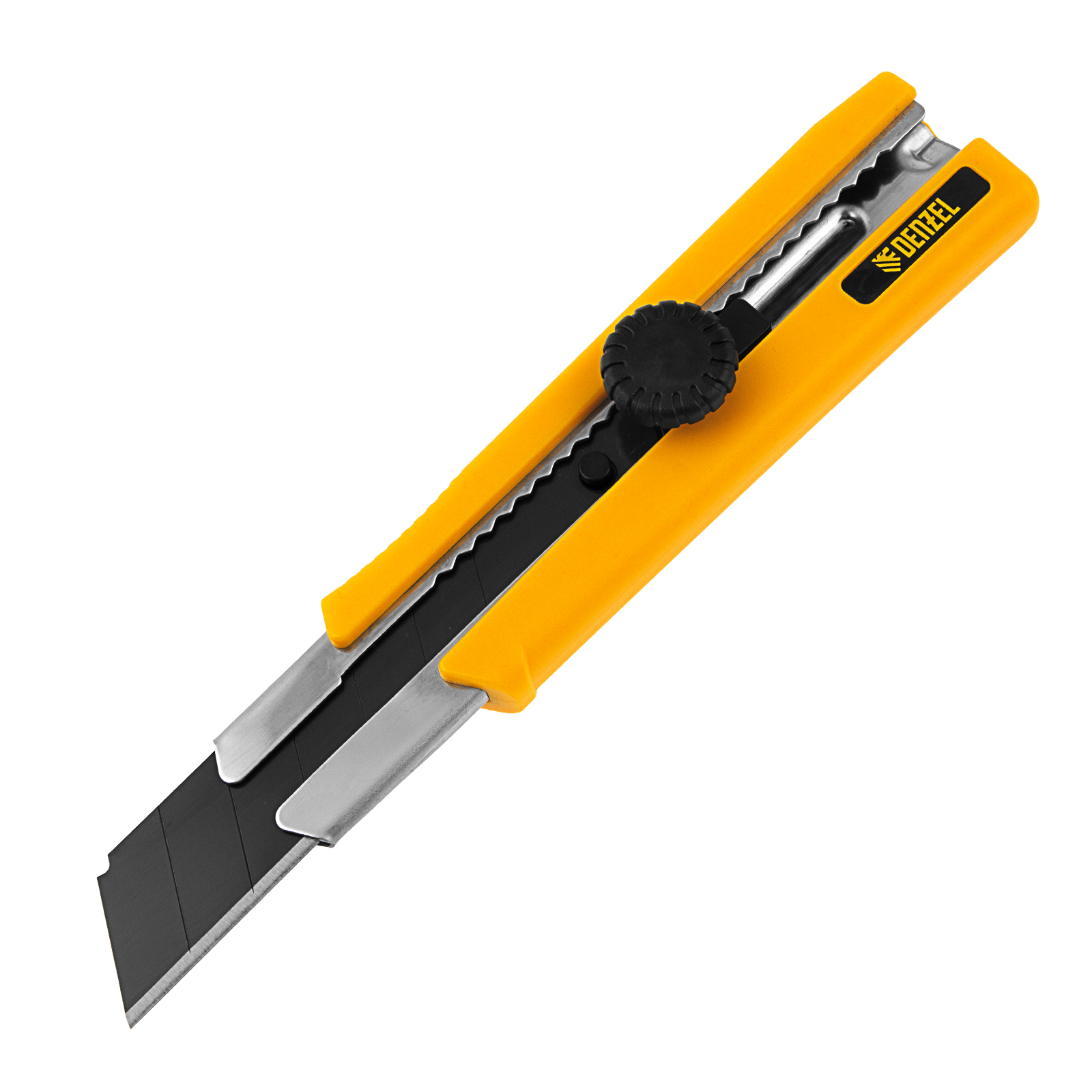 Нож Denzel 78945 выполнен в корпусе из термопластичной резины TPR, со сменным лезвием шириной 25 мм, изготовленным из стали SK4, оснащен винтовым фиксатором и металлической направляющей. Сверхострое выдвижное лезвие легко режет линолеум, ковролин, бумагу, обои, картон и другие листовые материалы. Нож рекомендован для профессионального применения, пригодится также в домашнем хозяйстве.