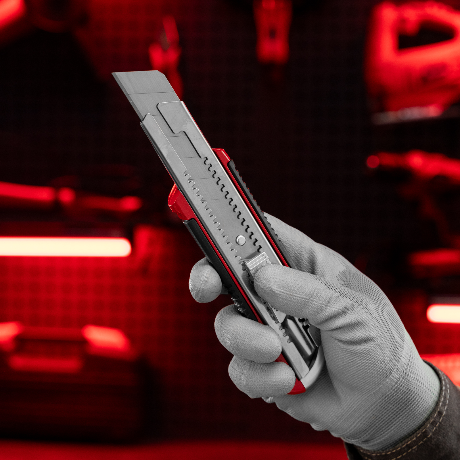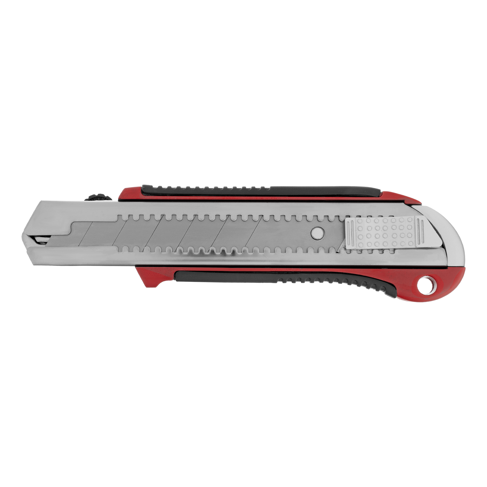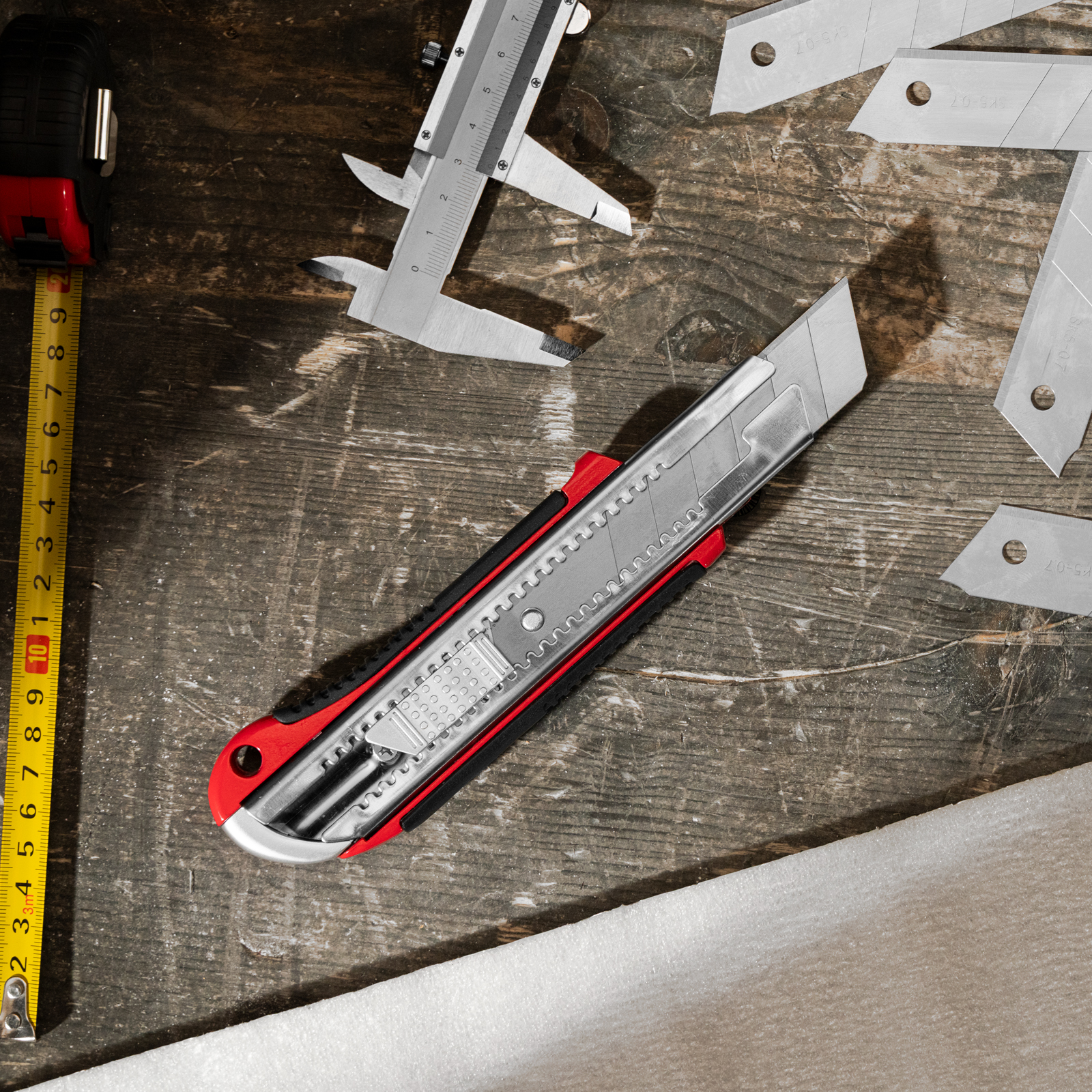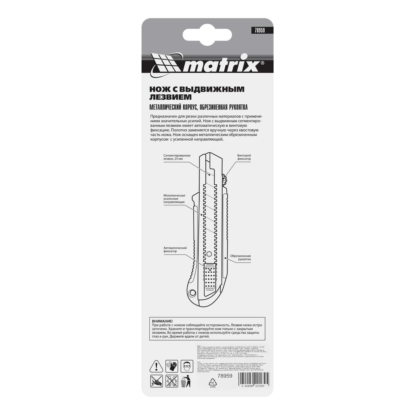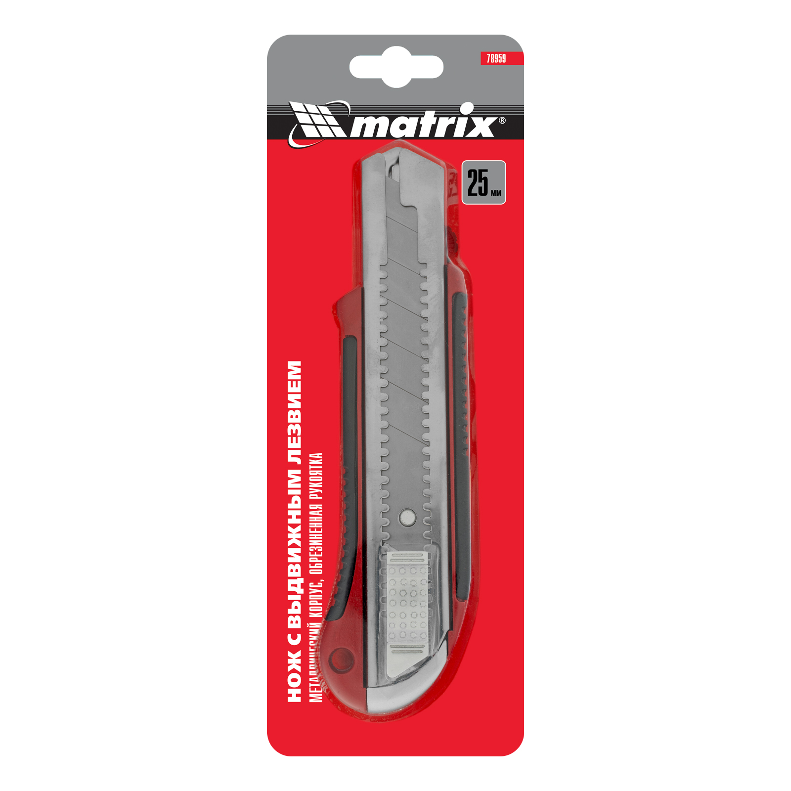 Нож Matrix 78959 с выдвижным лезвием шириной 25 мм, усиленной металлической направляющей и металлической обрезиненной ручкой служит для резания бумаги, картона, линолеума, обоев и других материалов. Благодаря усиленной направляющей нож не сломается даже при значительных нагрузках. Предусмотрена возможность ручной замены износившегося лезвия. Инструмент используется для проведения строительных работ, также полезен в быту.