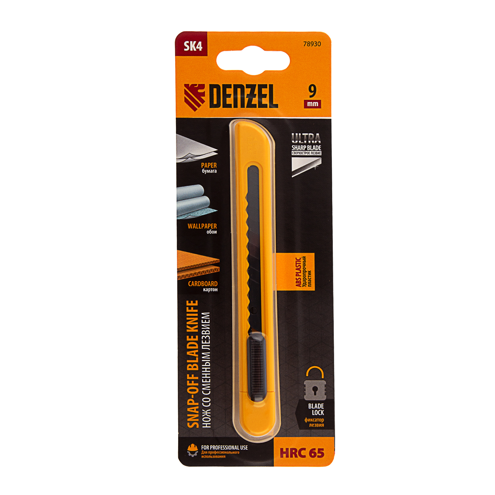 Нож Denzel 78930 в корпусе из ABS-пластика, со сменным лезвием шириной 9 мм, изготовленным из стали SK4, оснащен нажимным фиксатором. Сверхострое выдвижное лезвие легко режет бумагу, обои, картон и другие листовые материалы. Нож рекомендован для профессионального применения, пригодится также в домашнем хозяйстве.