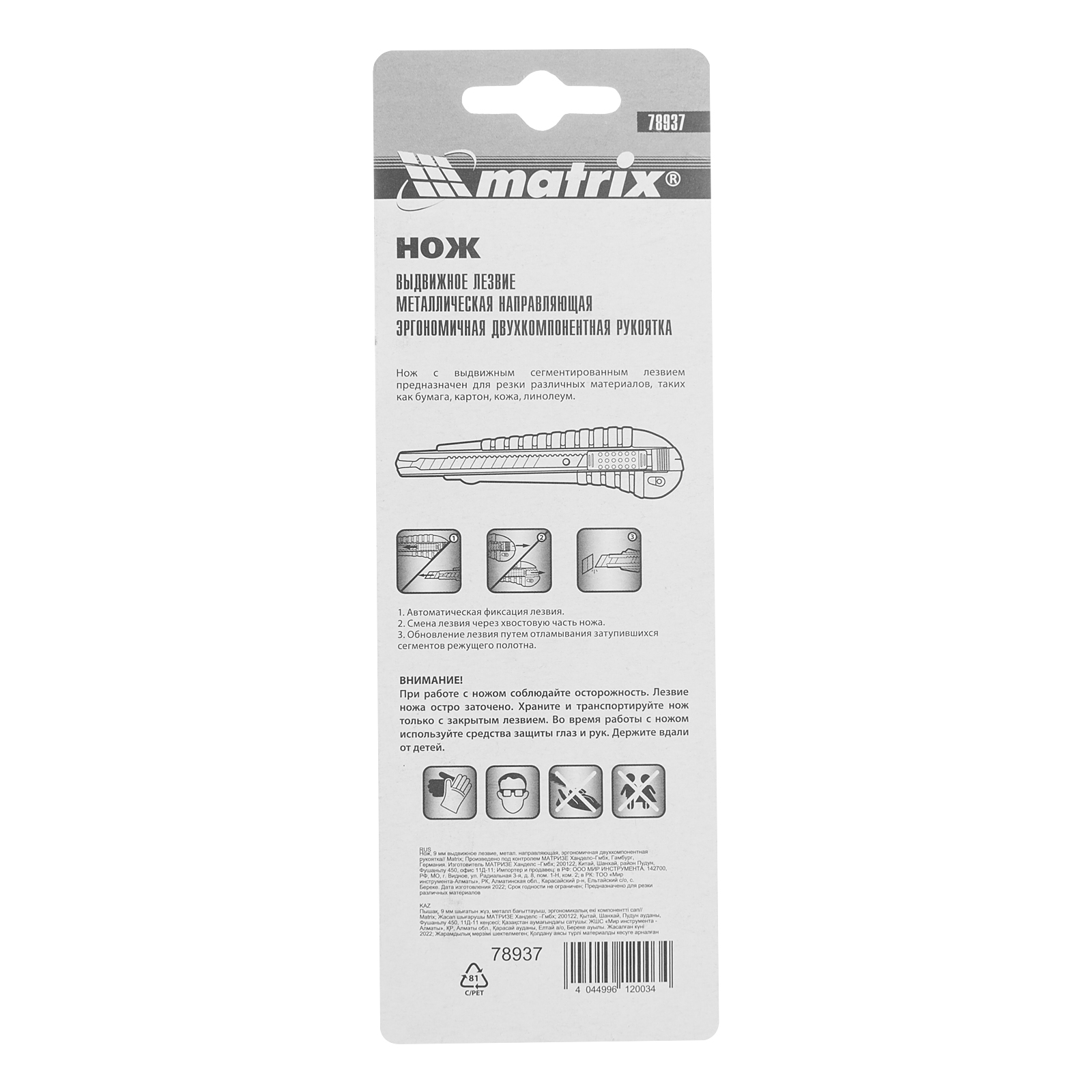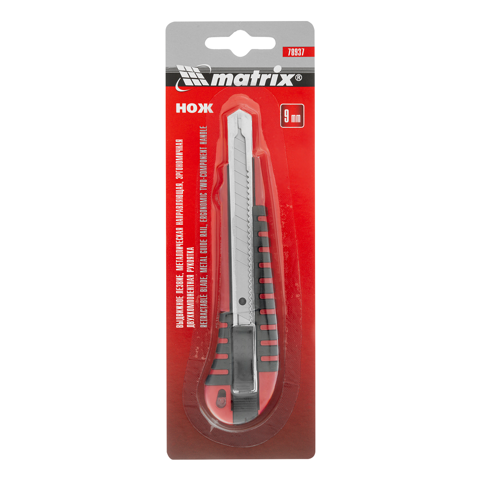 <p>Нож Matrix 78937 с выдвижным лезвием шириной 9 мм, металлической направляющей и эргономичной двухкомпонентной рукояткой пригодится в мастерской, для бытового использования, проведения ремонтных работ, а также для рукоделия. Он с легкостью разрезает бумагу, картон и более плотные материалы, например, кожаные изделия.</p><h2>Преимущества</h2><ul><li>Прочность и твердость — лезвие выполнено из стали 60.</li><li>Металлическая направляющая — корпус защищен от повреждений.</li><li>Сегментированное лезвие — его часть можно легко отломить, если режущая кромка потеряла остроту.</li><li>Эргономичный корпус с обрезиненными рукоятками — руки не устают даже при интенсивном использовании.</li></ul>
