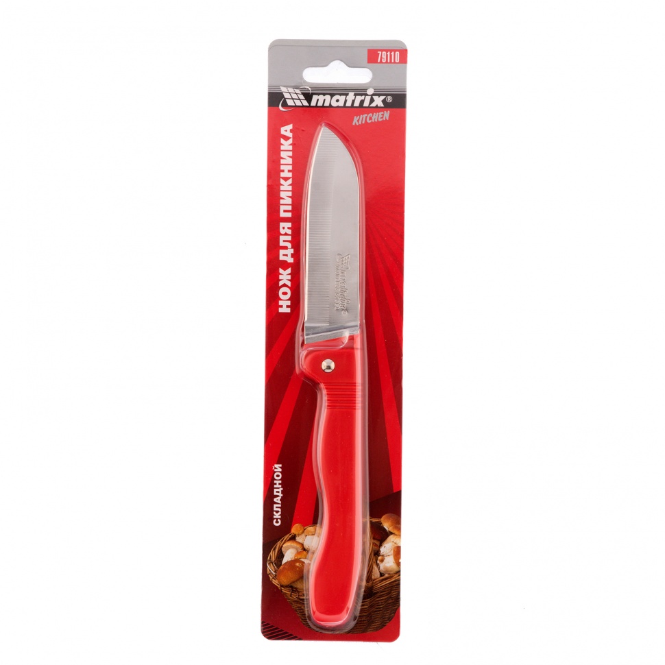 Складной нож для пикника Matrix Kitchen 79110 используется в турпоходах и во время отдыха на природе. Остро заточенное лезвие легко справляется с нарезанием продуктов или мелких веток для костра, вскрыванием упаковок, срезанием грибов. Благодаря складному механизму полотно убирается внутрь рукоятки, что исключает риск травмирования пользователя во время транспортировки ножа.