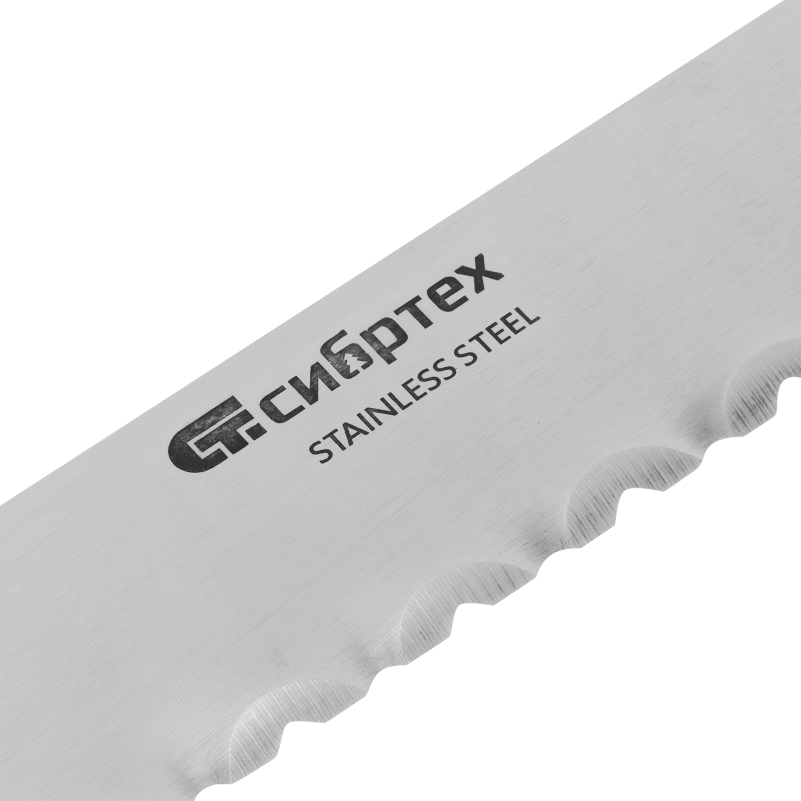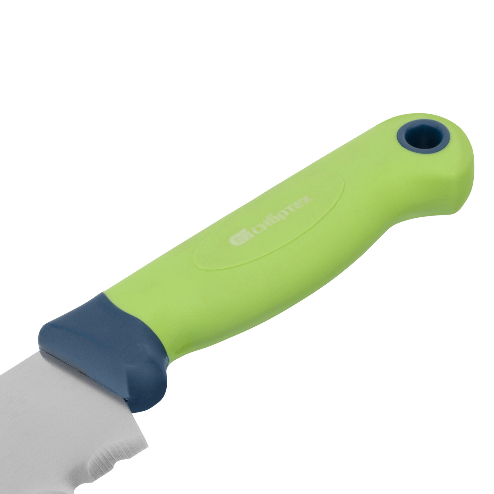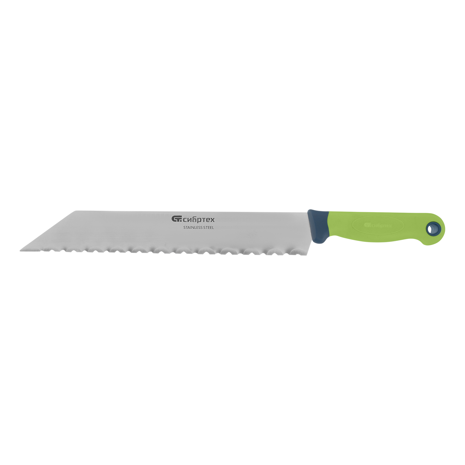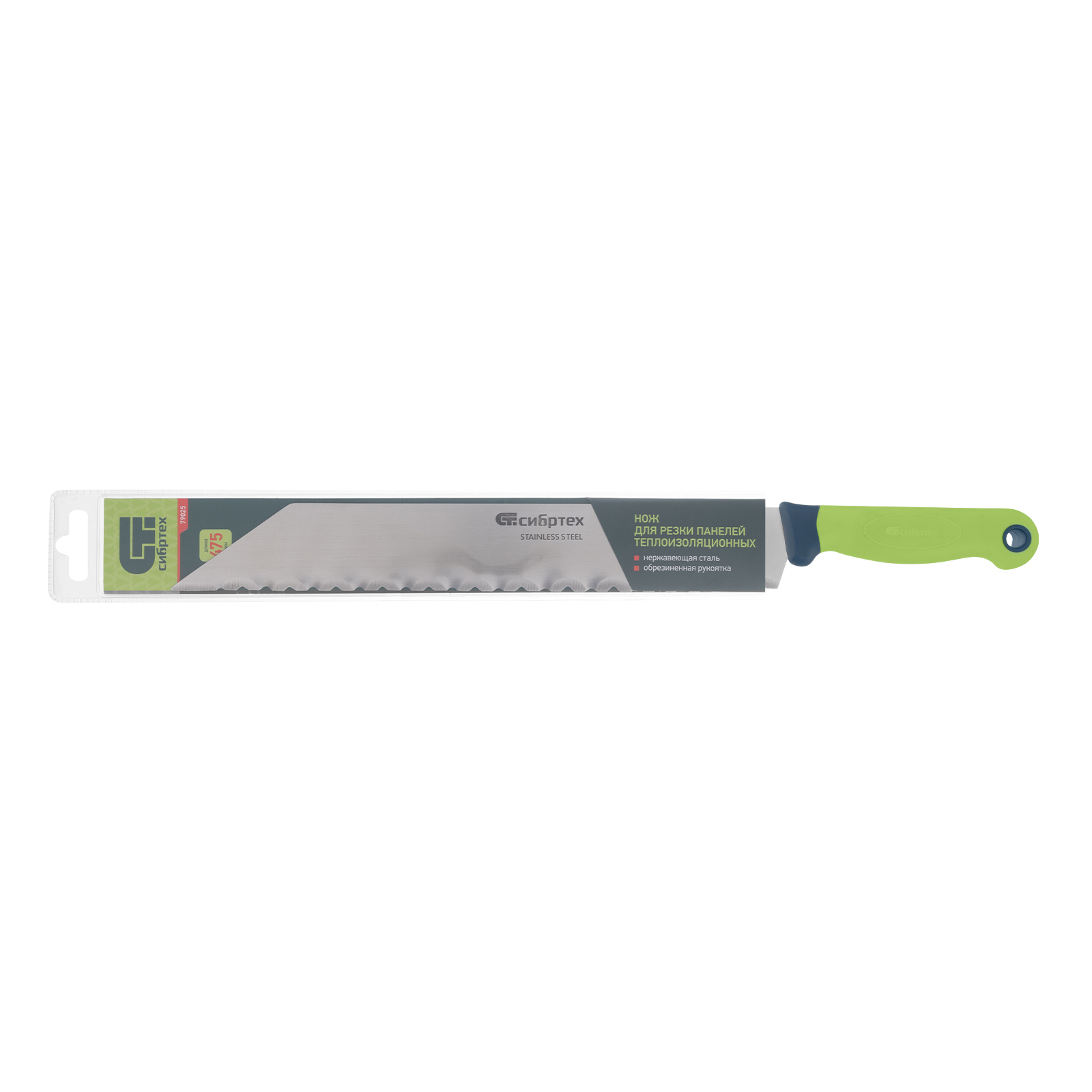 Нож Сибртех 79025 общей длиной 475 мм и длиной лезвия 340 мм, с обрезиненной рукояткой, предназначен для резки теплоизоляционных панелей. Он пригодится в ходе проведения строительных работ при укладке утеплителя. Лезвие длиной 340 мм легко справляется с резкой длинных и толстых пластов.