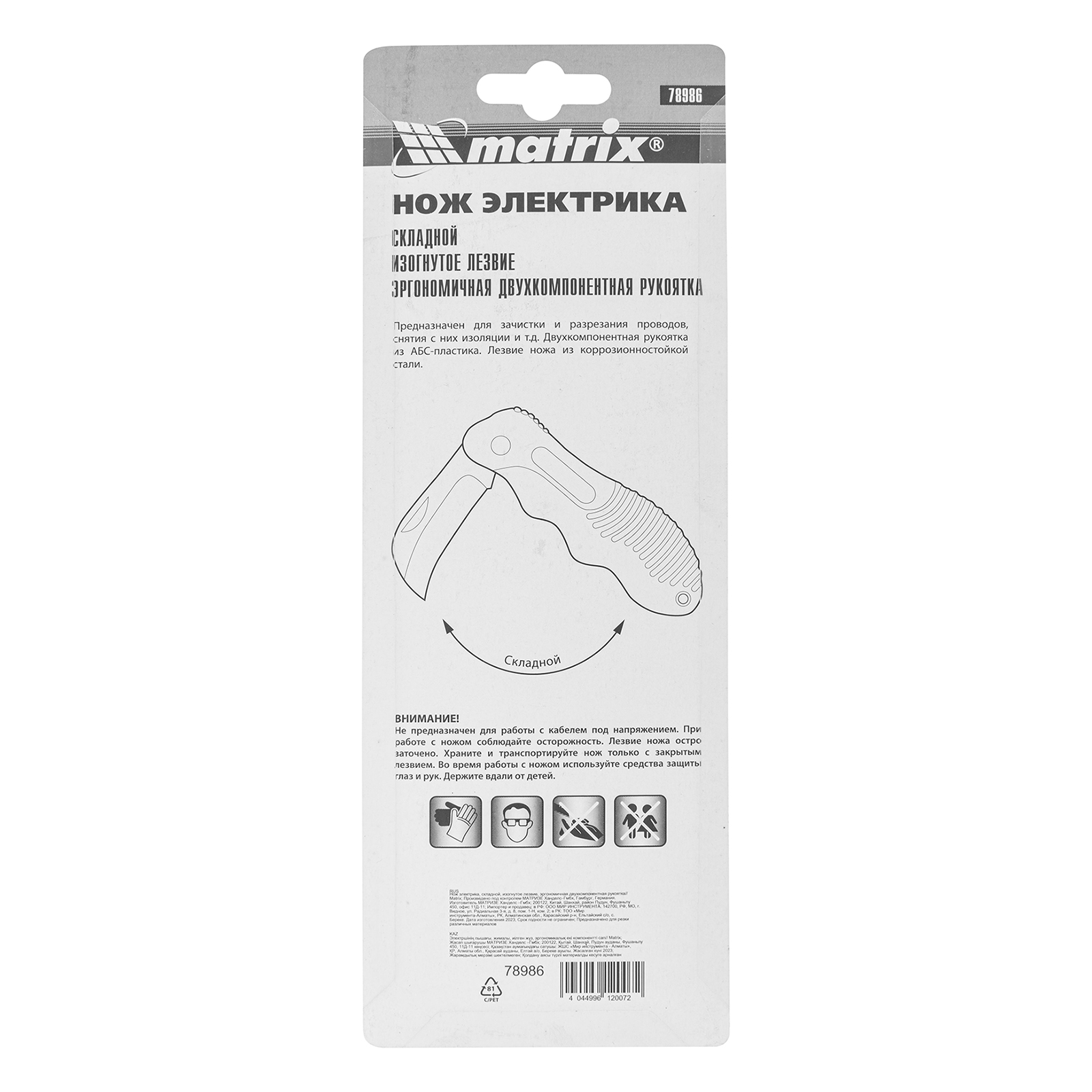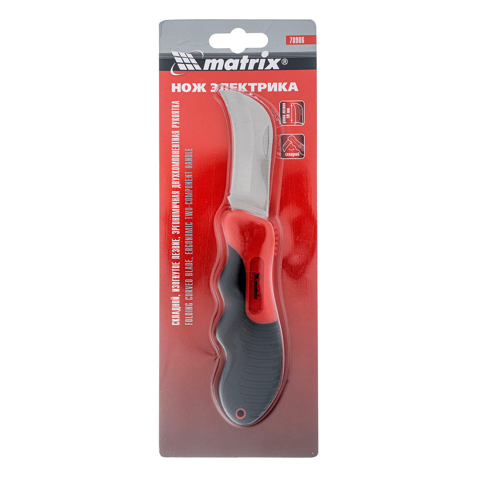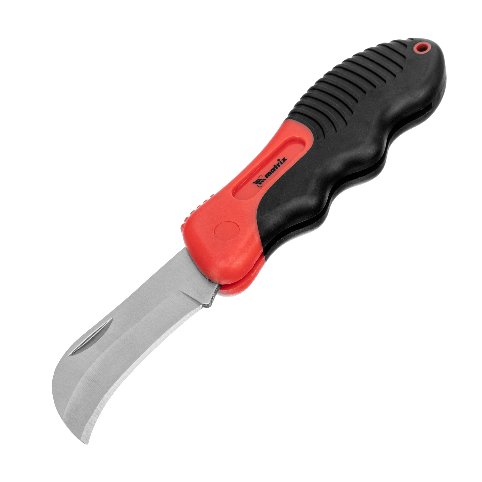 Складной нож электрика Matrix 78986 с изогнутым лезвием и эргономичной двухкомпонентной рукояткой используется для рассечения проводов и снятия с них изоляции. Изогнутое лезвие длиной 60 мм удобно для работы в стесненных условиях. Инструмент предназначен для электромонтажных работ, подходит для бытового применения.