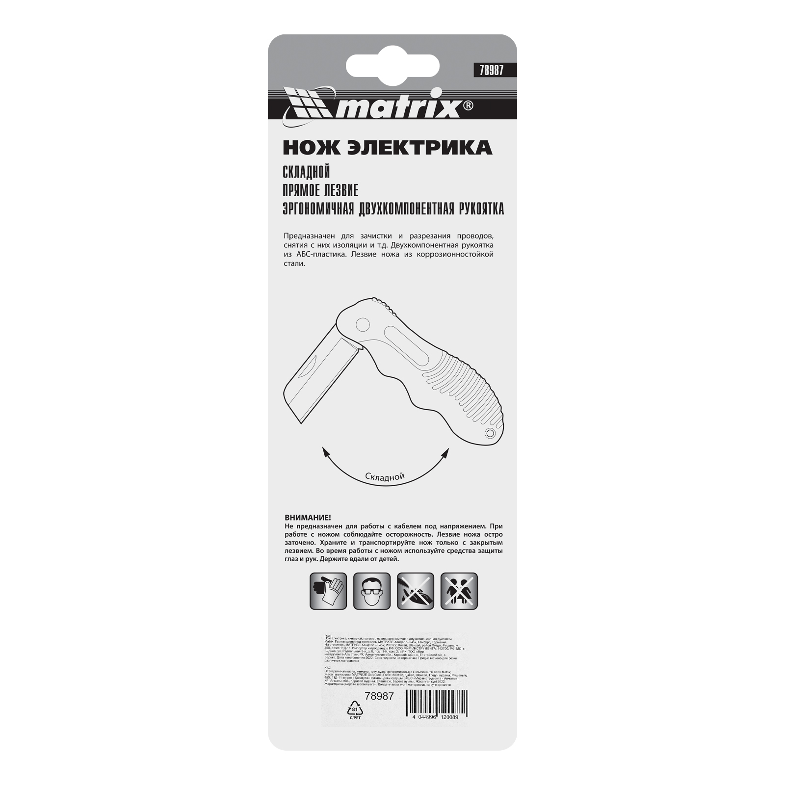 Складной нож электрика Matrix 78987 с прямым лезвием и эргономичной двухкомпонентной рукояткой используется для рассечения проводов и снятия с них изоляции. Прямое лезвие длиной 60 мм удобно для работы в стесненных условиях. Инструмент предназначен для электромонтажных работ, подходит для бытового применения.