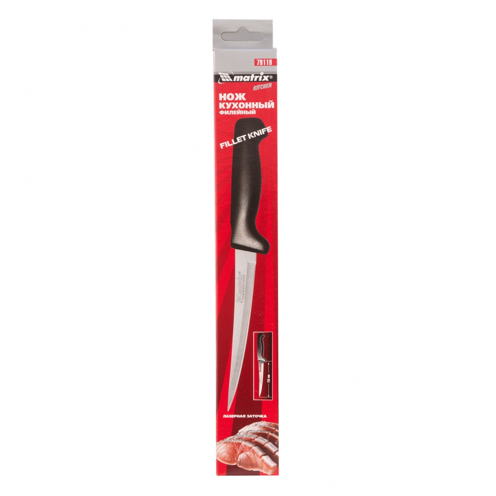 Кухонный филейный нож Matrix Kitchen 79119 с полотном длиной 155 мм предназначен для отделения филе рыбы или мяса от костей и кожи и нарезания его на тонкие ломтики. Узкое и гибкое полотно делает нож оптимальным инструментом для решения этих задач. По утверждению производителя, нож является наиболее острым по сравнению с аналогичными моделями конкурентов.