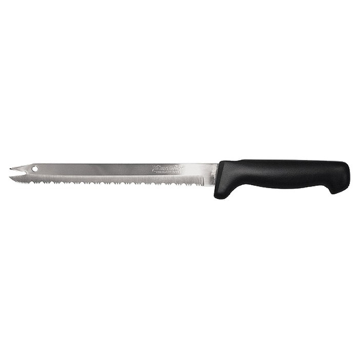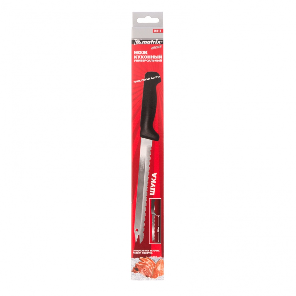 Универсальный кухонный нож Matrix KITCHEN «Щука» 79118 длиной 200 мм, со специальной заточкой лезвия полотна, используется для нарезания продуктов, в том числе замороженных или с большим количеством косточек. Наиболее подходящий инструмент для аккуратной резки мягких фруктов или хлеба — на лезвии имеются зазубрины, которые позволяют аккуратно разрезать корку или кожуру, не смяв при этом содержимое.