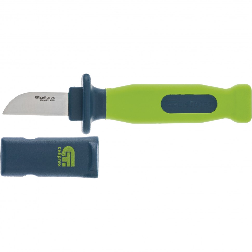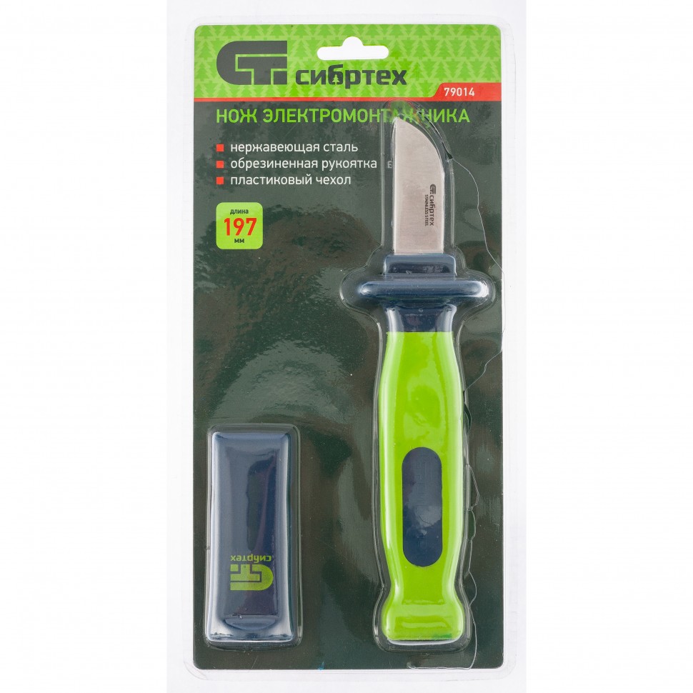 Нож монтажника Сибртех 79014 общей длиной 197 мм и длиной лезвия 50 мм, с чехлом и обрезиненной рукояткой, предназначен для работ с проводкой. С его помощью можно зачистить и обрезать кабель. Нож с пластиковым чехлом безопасен при транспортировке, поэтому его удобно брать с собой на выездные работы.