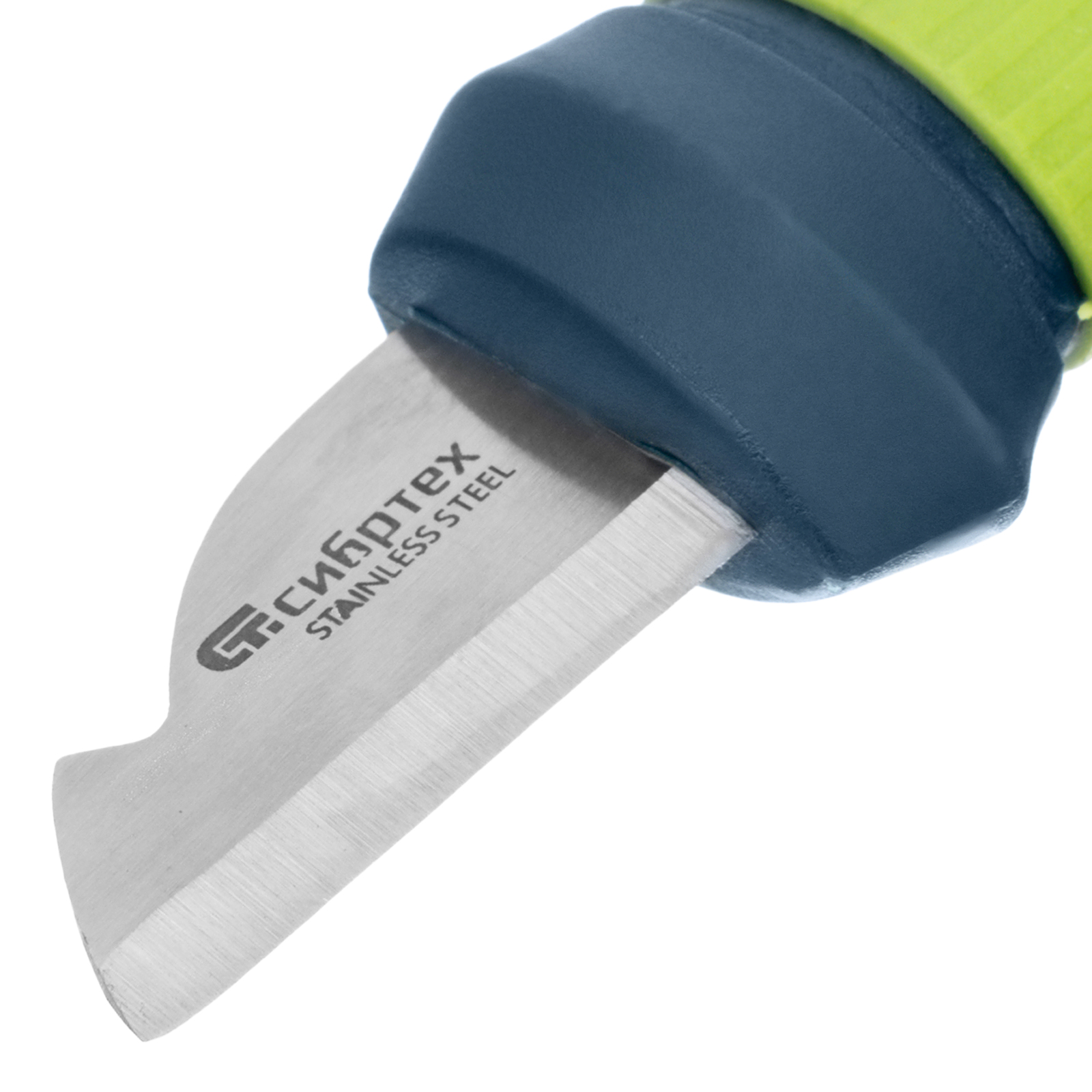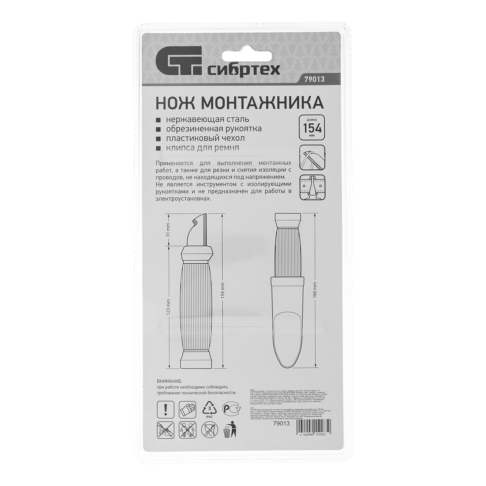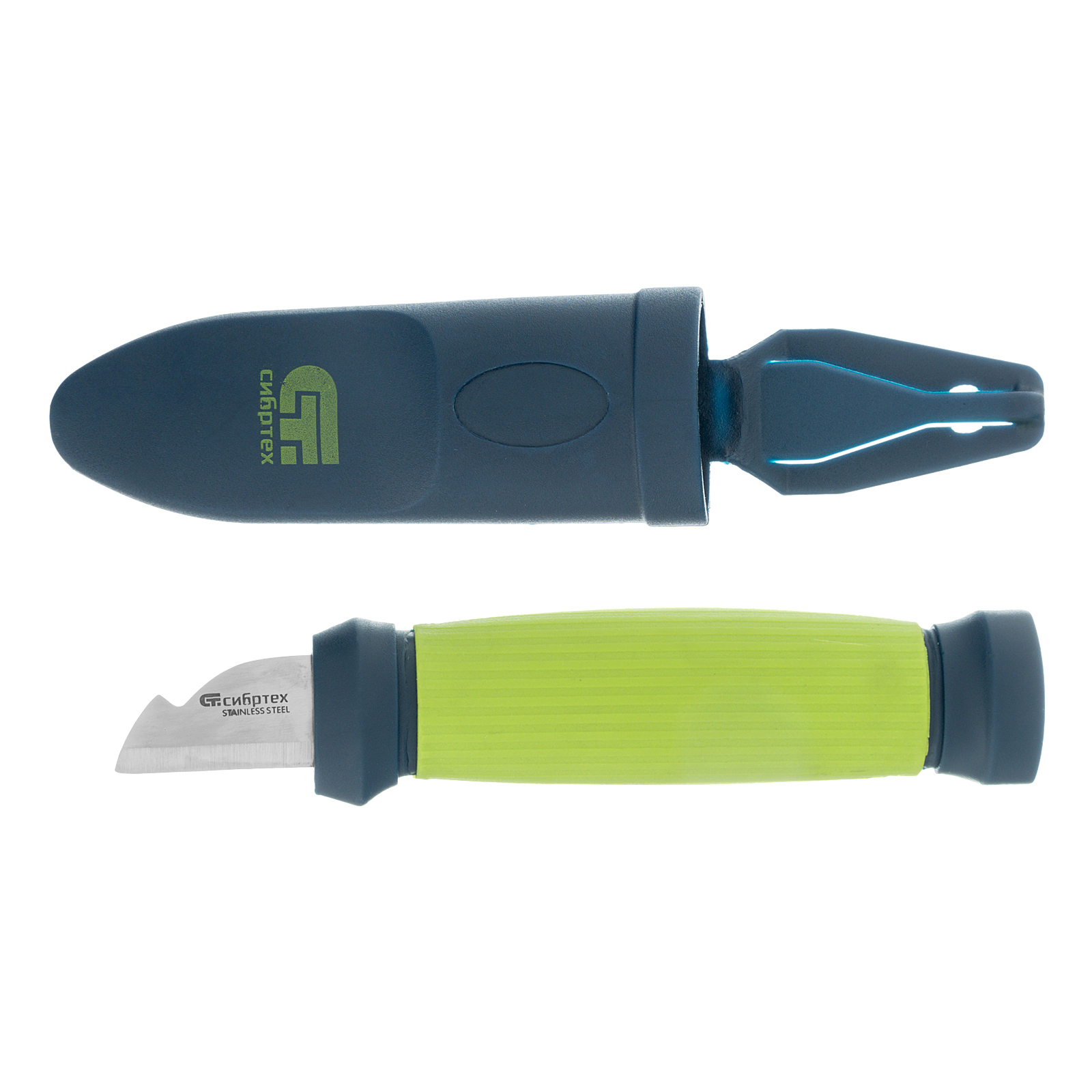 Нож монтажника Сибртех 79013 общей длиной 154 мм, с лезвием длиной 31 мм и с заточкой справа, с чехлом и обрезиненной рукояткой, предназначен для работ с проводкой. С его помощью можно зачистить и обрезать кабель. Нож в пластиковом чехле безопасен при транспортировке, поэтому его удобно брать с собой на выездные работы.