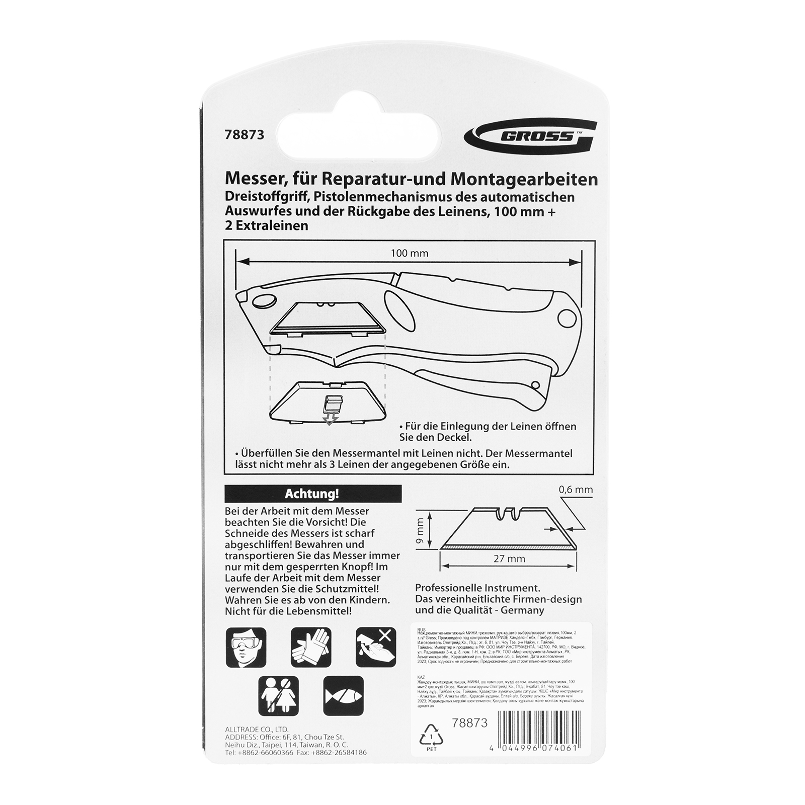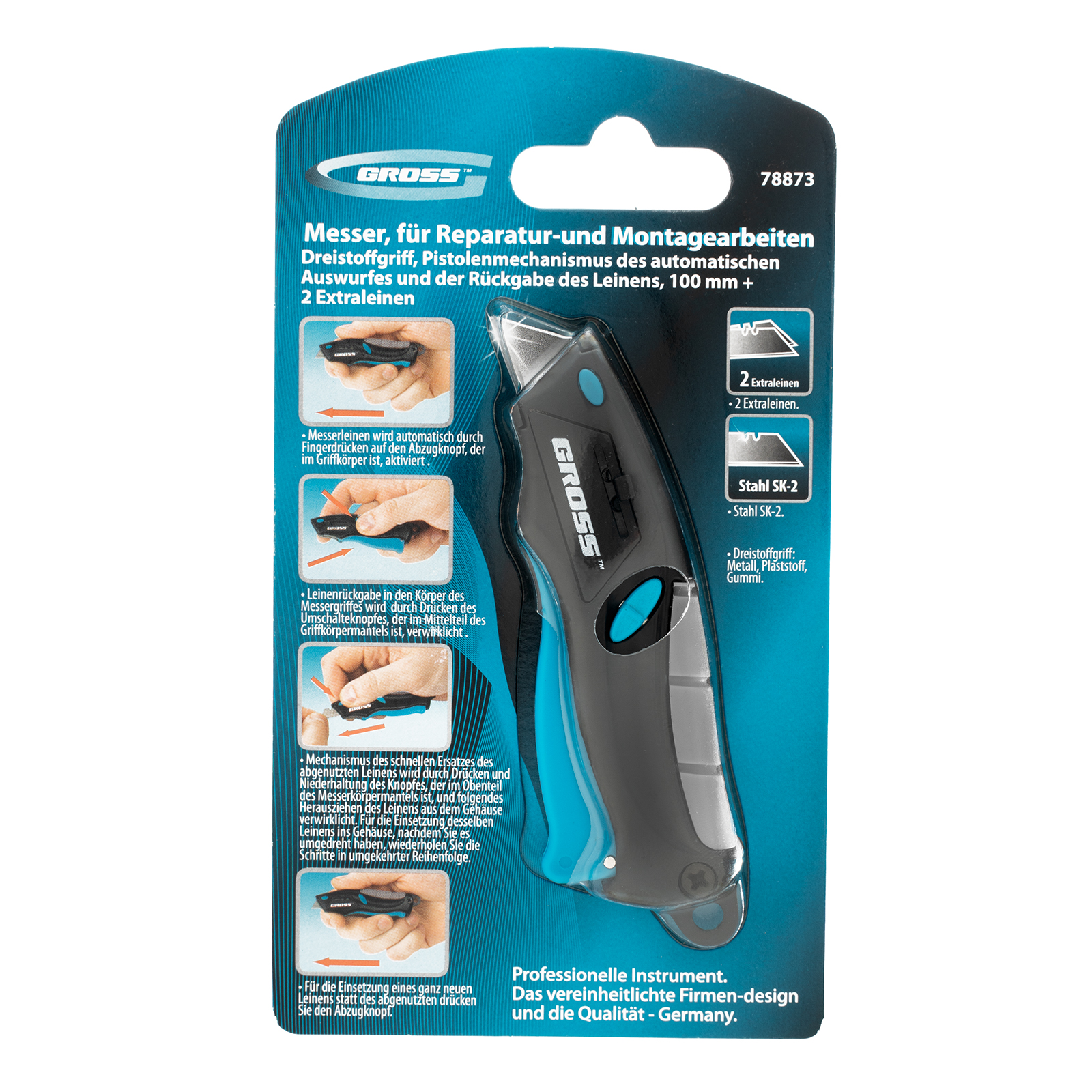 Ремонтно-монтажный нож Gross МИНИ 78873 длиной 100 мм, с трехкомпонентной рукояткой, автоматическим выбросом и возвратом лезвия, с 2 запасными полотнами, используется для разрезания бумаги, обоев, картона, линолеума, кожи. Прочное трапециевидное лезвие из высококачественной японской стали SK-2 толщиной 0,6 мм и шириной 9 мм не ломается и долго не тупится. Нож рекомендован для профессионального применения, а также будет полезен в быту.