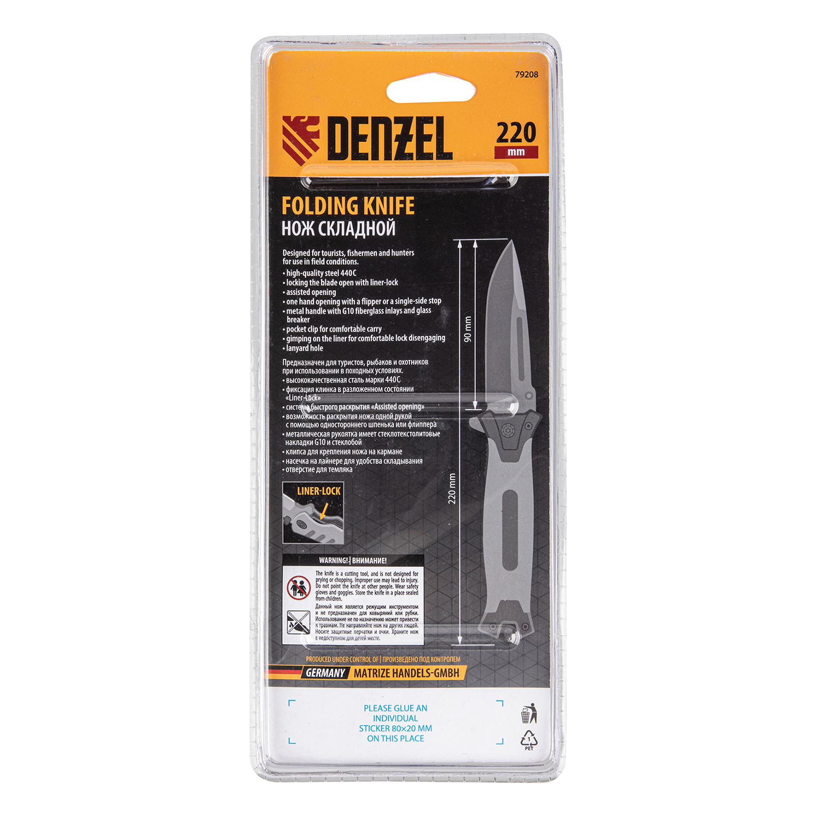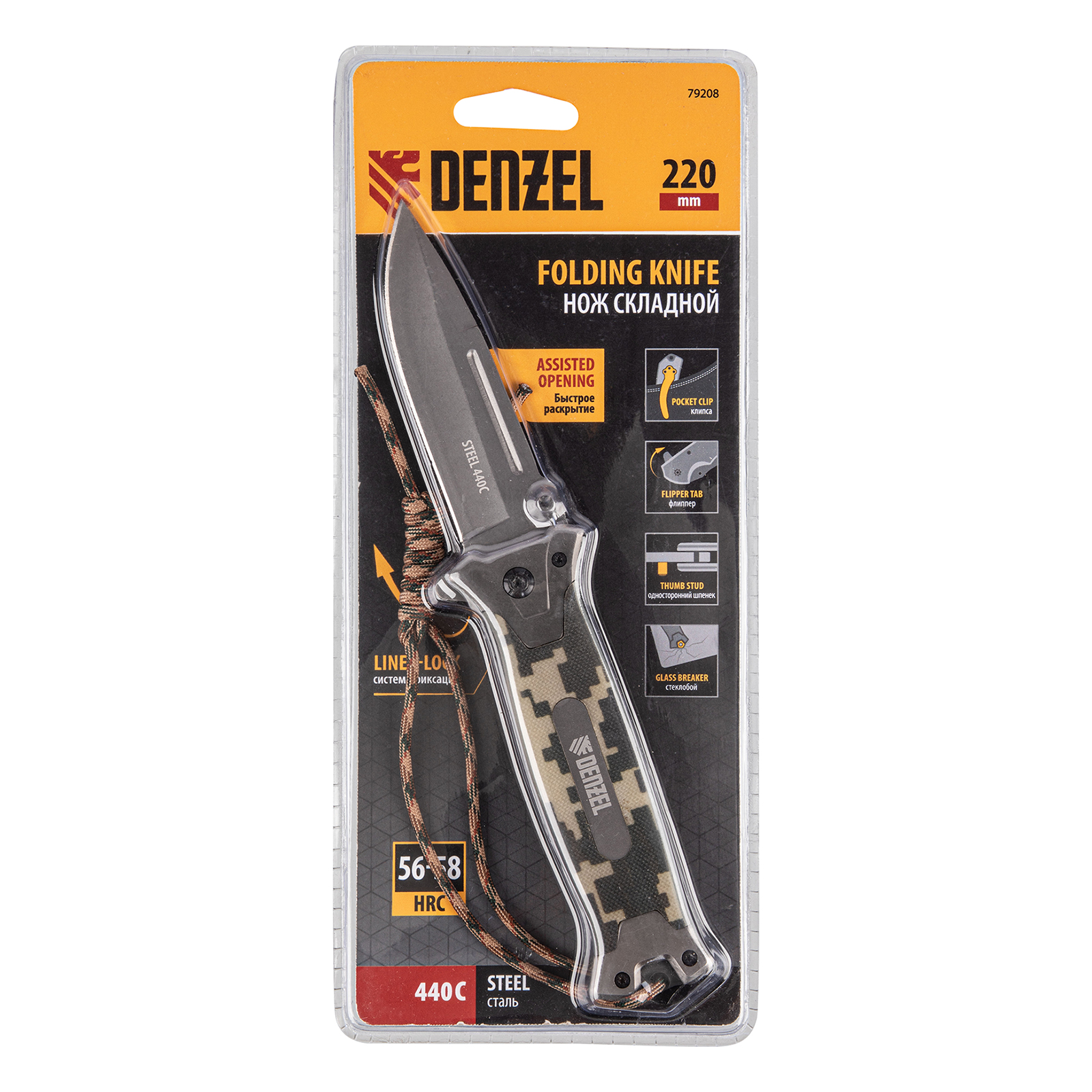 Многоцелевой складной нож Denzel 79208 длиной 220 мм, с системой Liner-Lock, накладкой G10 на прямой рукоятке и стеклобоем, находит широкое применение при активном отдыхе на природе, во время рыбалки и охоты. Флиппер помогает быстро раскрывать нож. Также нож оснащен стеклобоем, которым можно разбить стекло в аварийной ситуации.