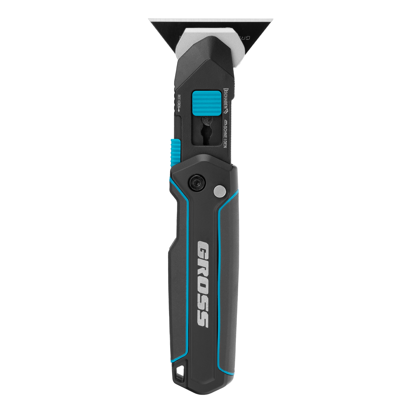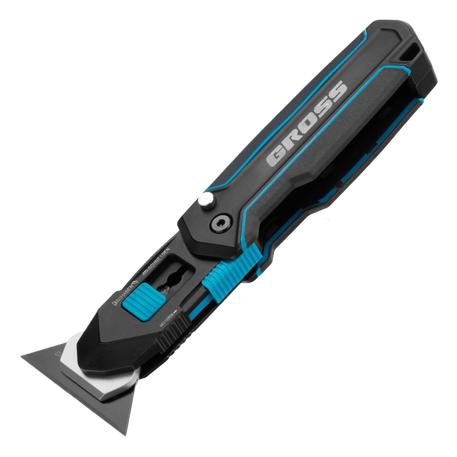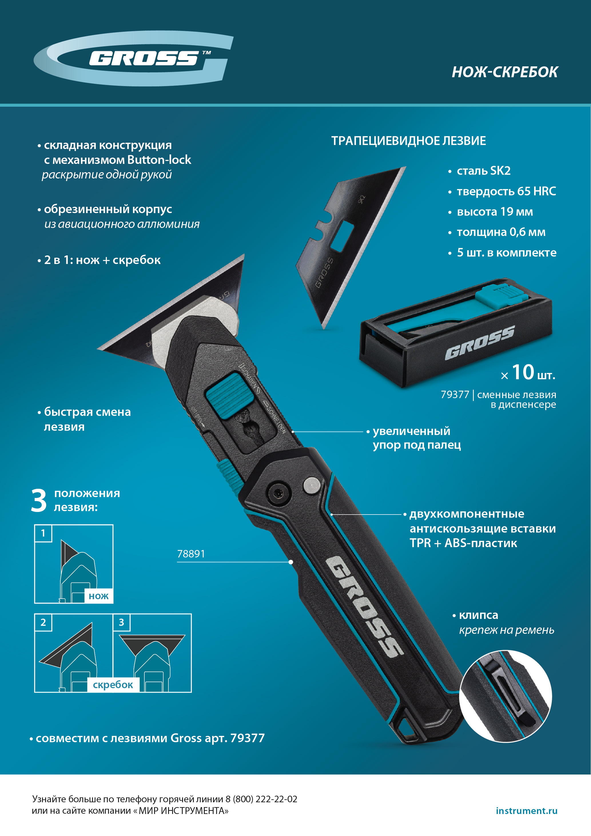 Складной нож-скребок Gross 78891 в алюминиевом корпусе — универсальный инструмент 2 в 1. Используется в качестве скребка для удаления краски, шпаклевки, обоев и клея с гладких поверхностей, а также в качестве ножа для разрезания картона, обоев, линолеума, пластика и других материалов. Благодаря механизму Button-lock нож раскладывается мгновенно — достаточно одного нажатия. Лезвие автоматически принимает 1 из 3 положений при перемещении «бегунка», что упрощает и ускоряет работу. Нож совместим с лезвиями Gross 79377 (приобретаются отдельно). Инструмент незаменим при проведении строительных, ремонтных и отделочных работ.