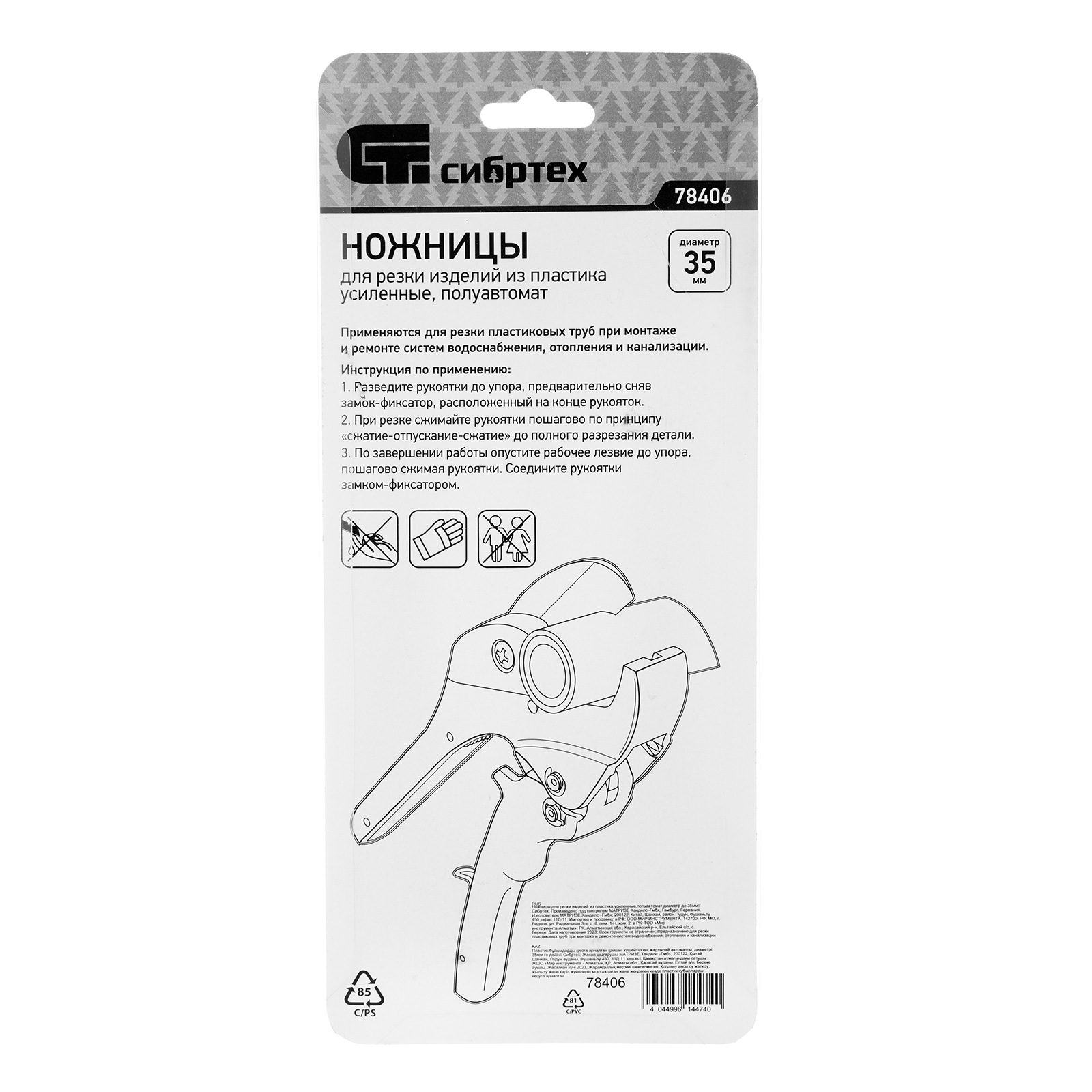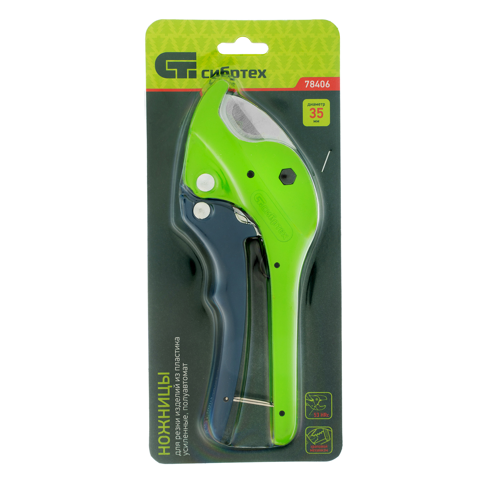 <p>Усиленные полуавтоматические ножницы Сибртех 78406 применяются для резки изделий из пластика диаметром до 35 мм. Полуавтоматический рычажный механизм облегчает работу. Ножницы бытового назначения пригодятся для обслуживания трубопроводных систем дома и на даче.</p><h2>Преимущества</h2><ul><li>Лезвие из стали У8 обладает необходимой твердостью и рассчитано на долгий срок службы.</li><li>Легкий и прочный алюминиевый корпус позволяет долго работать без ощущения усталости.</li><li>Металлическая скоба блокирует рукоятки в одном положении, предотвращая их случайное раскрытие.</li></ul><p>Для корректной работы инструмента, чтобы предотвратить перекос лезвия относительно ПВХ-трубы, рекомендуется, чтобы отрезаемая часть была больше или равна внешнему диаметру ПВХ-трубы. В противном случае может возникнуть перекос лезвия, что также может привести к поломке лезвия/инструмента.</p>