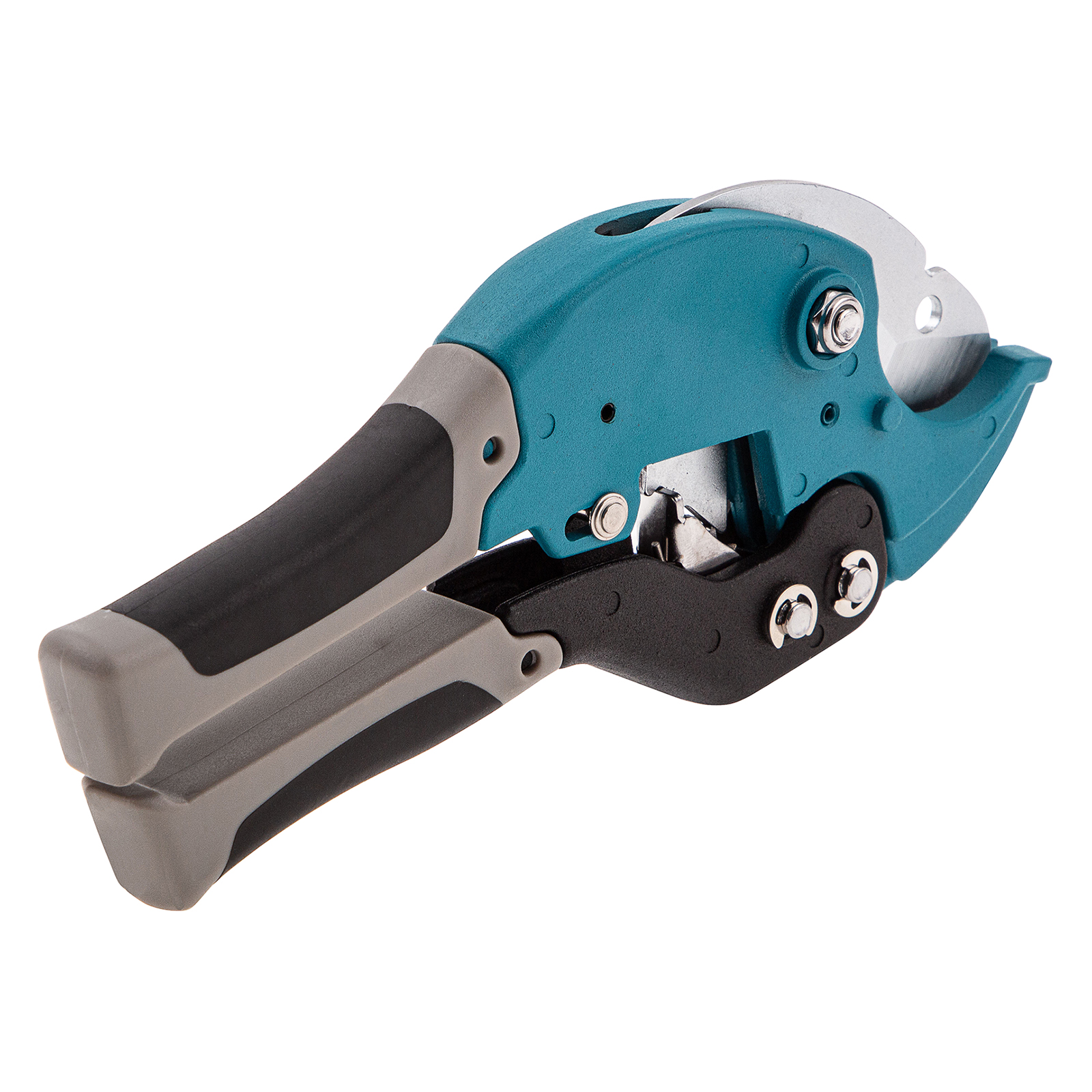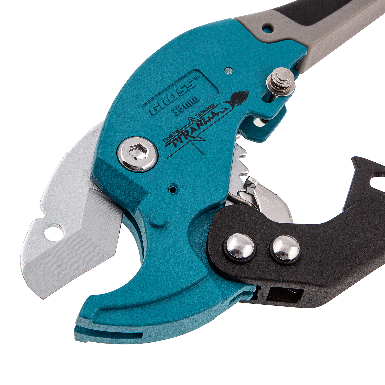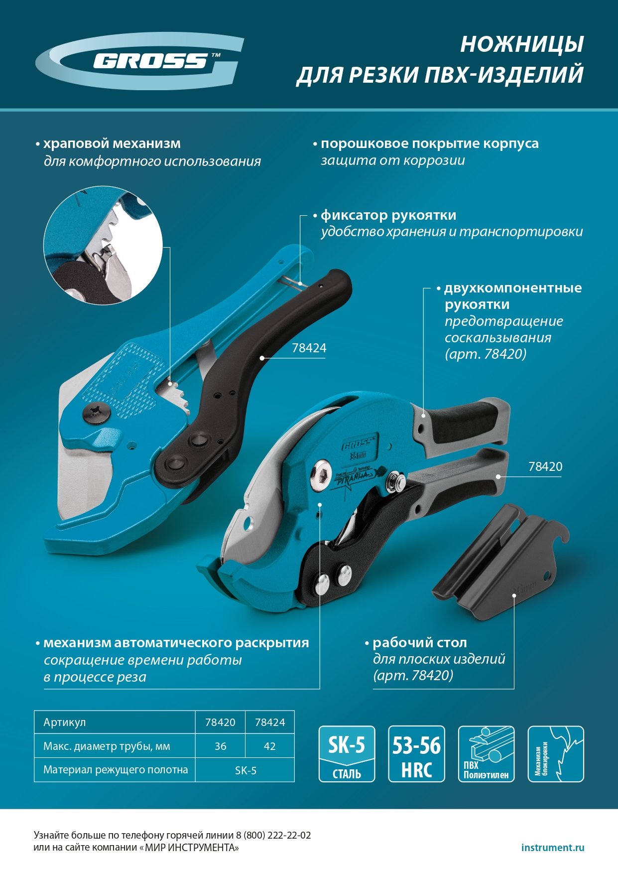 Ножницы для резки изделий из ПВХ Gross 78420 с двухкомпонентными рукоятками и рабочим столиком используются для разрезания резиновых шлангов и пластиковых заготовок диаметром до 36 мм — труб, плинтусов, профилей, галтелей, планок, реек. Трапециевидное полотно с двумя рабочими кромками обеспечивает высокую производительность инструмента. Стол, устанавливаемый на опорную поверхность ножниц, позволяет резать плоские предметы. Инструмент рекомендован для профессионального применения.