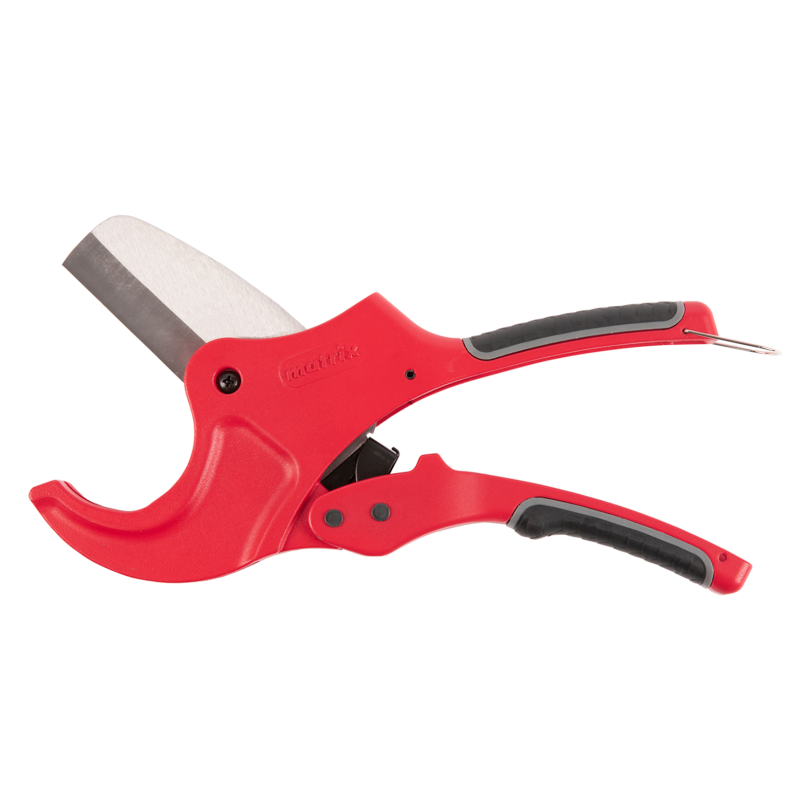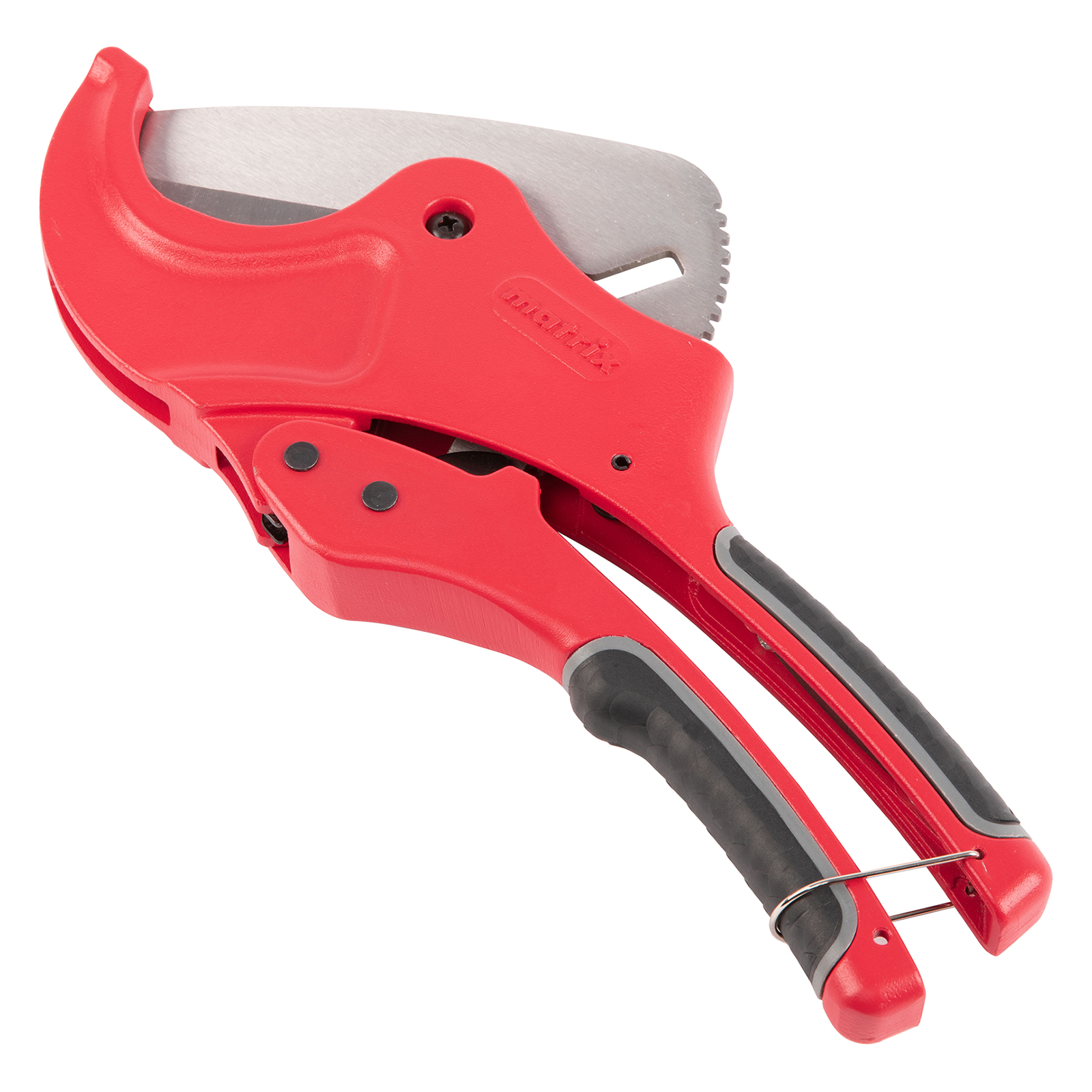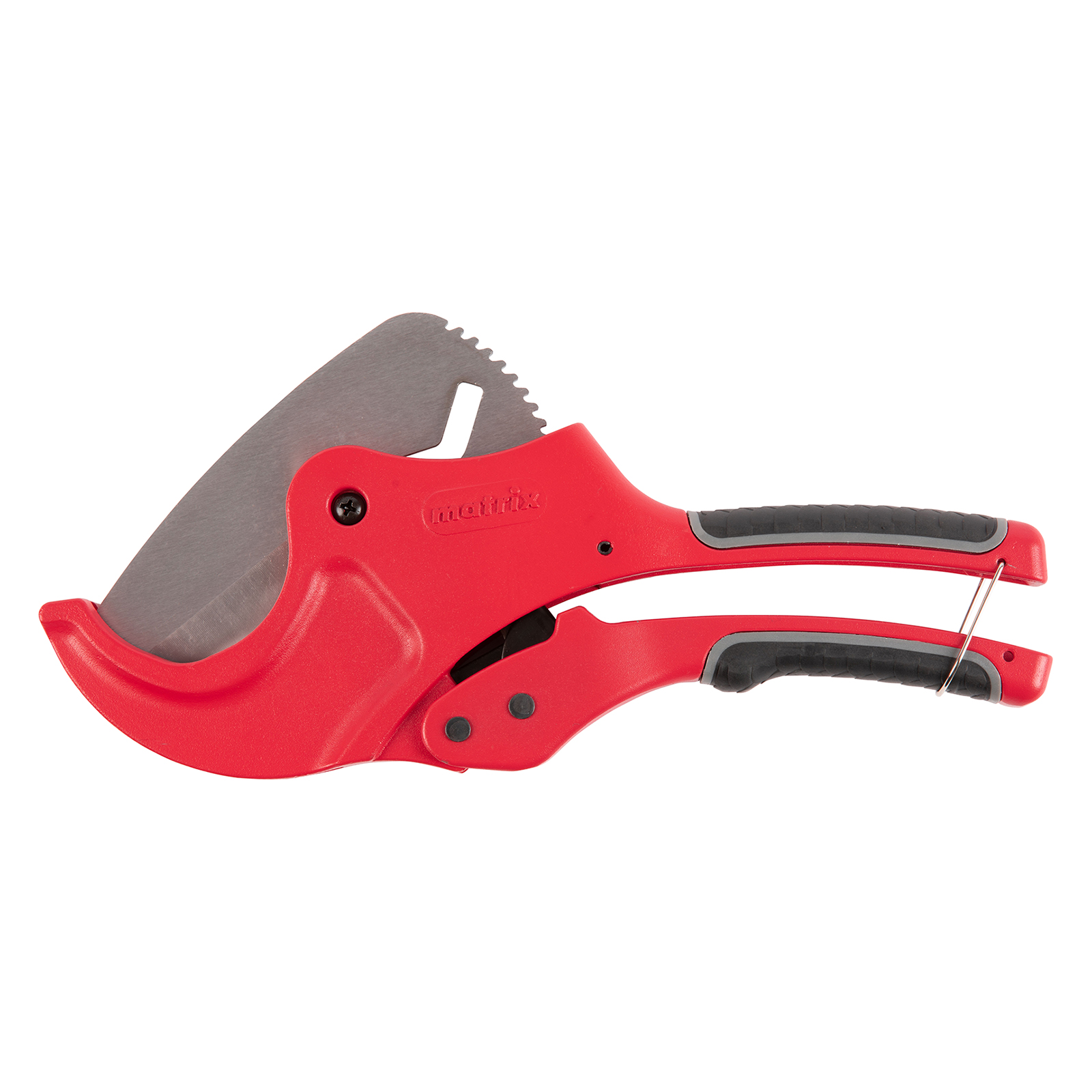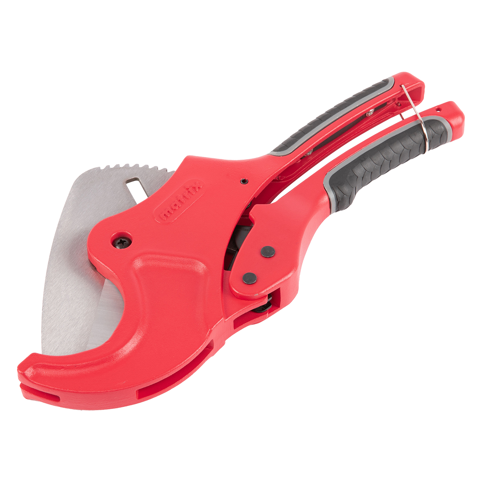 Ножницы для резки изделий из ПВХ Matrix 78419 с лезвием из нержавеющей стали и функцией автоматического раскрытия применяются для работы с пластиковыми трубами диаметром до 63 мм, а также для разрезания профилей, плинтусов, галтелей, реек, планок, резиновых шлангов и других предметов. Прямой нож инструмента позволяет резать плоские заготовки. Ножницы пригодятся для выполнения сантехнических и отделочных работ.