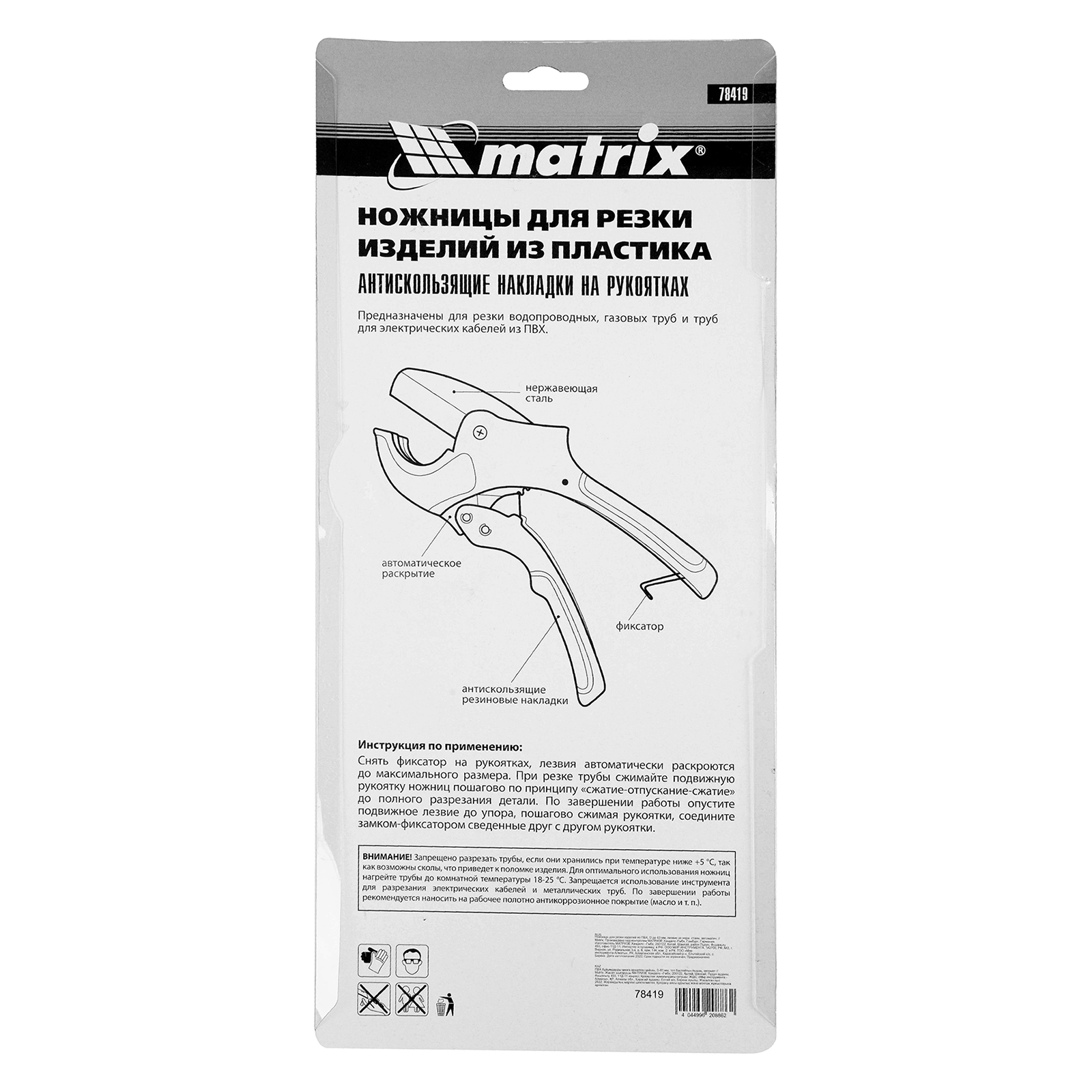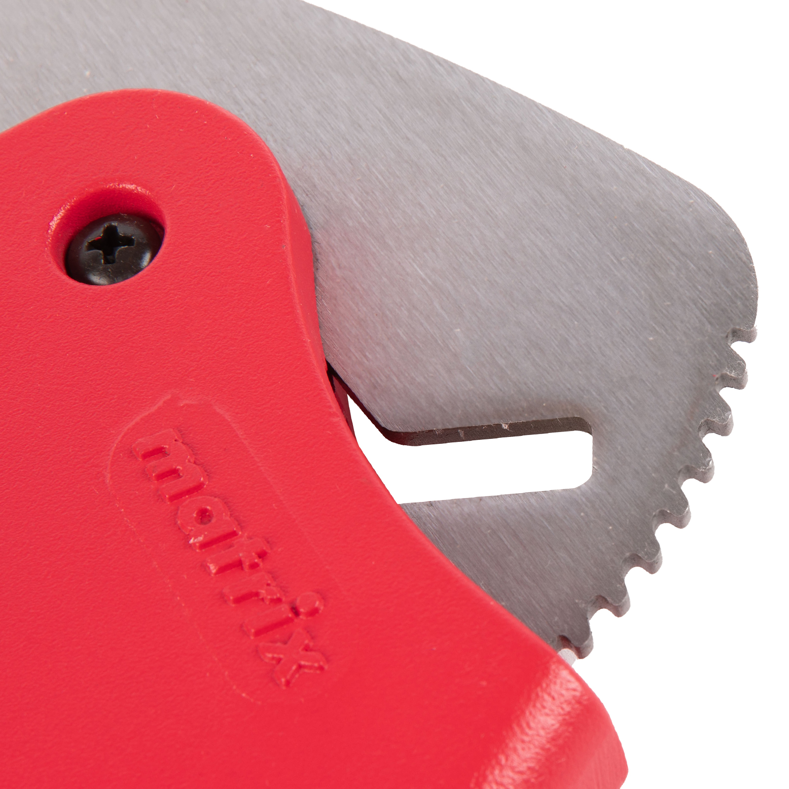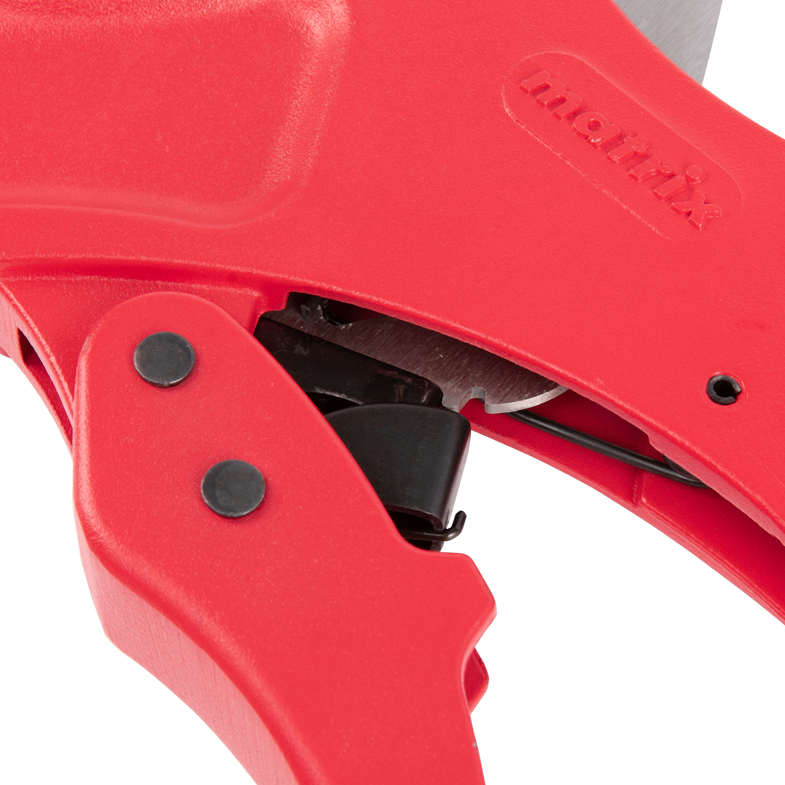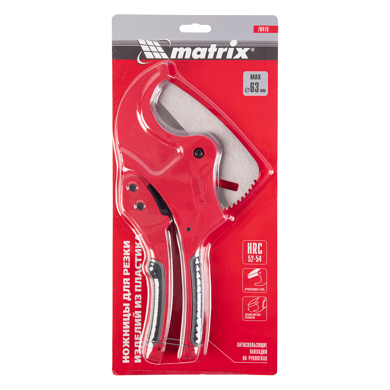Ножницы для резки изделий из ПВХ Matrix 78419 с лезвием из нержавеющей стали и функцией автоматического раскрытия применяются для работы с пластиковыми трубами диаметром до 63 мм, а также для разрезания профилей, плинтусов, галтелей, реек, планок, резиновых шлангов и других предметов. Прямой нож инструмента позволяет резать плоские заготовки. Ножницы пригодятся для выполнения сантехнических и отделочных работ.