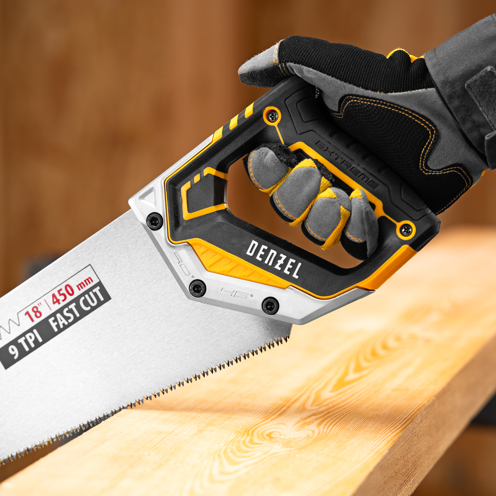 Ножовка по дереву Denzel 24140 длиной 450 мм, с зубьями с шагом 9 TPI и 3D-заточкой, с металлопластиковой рукояткой, предназначена для продольной и поперечной распиловки заготовок из древесины, ДСП, ДВП, МДФ, ламината, а также из ПВХ (труб, панелей, коробов). Подходит для спиливания молодых веток. Зубья с шагом 9 TPI позволяют выполнять быстрый рез. Ножовка используется для проведения столярных работ в мастерской и на дачном участке.